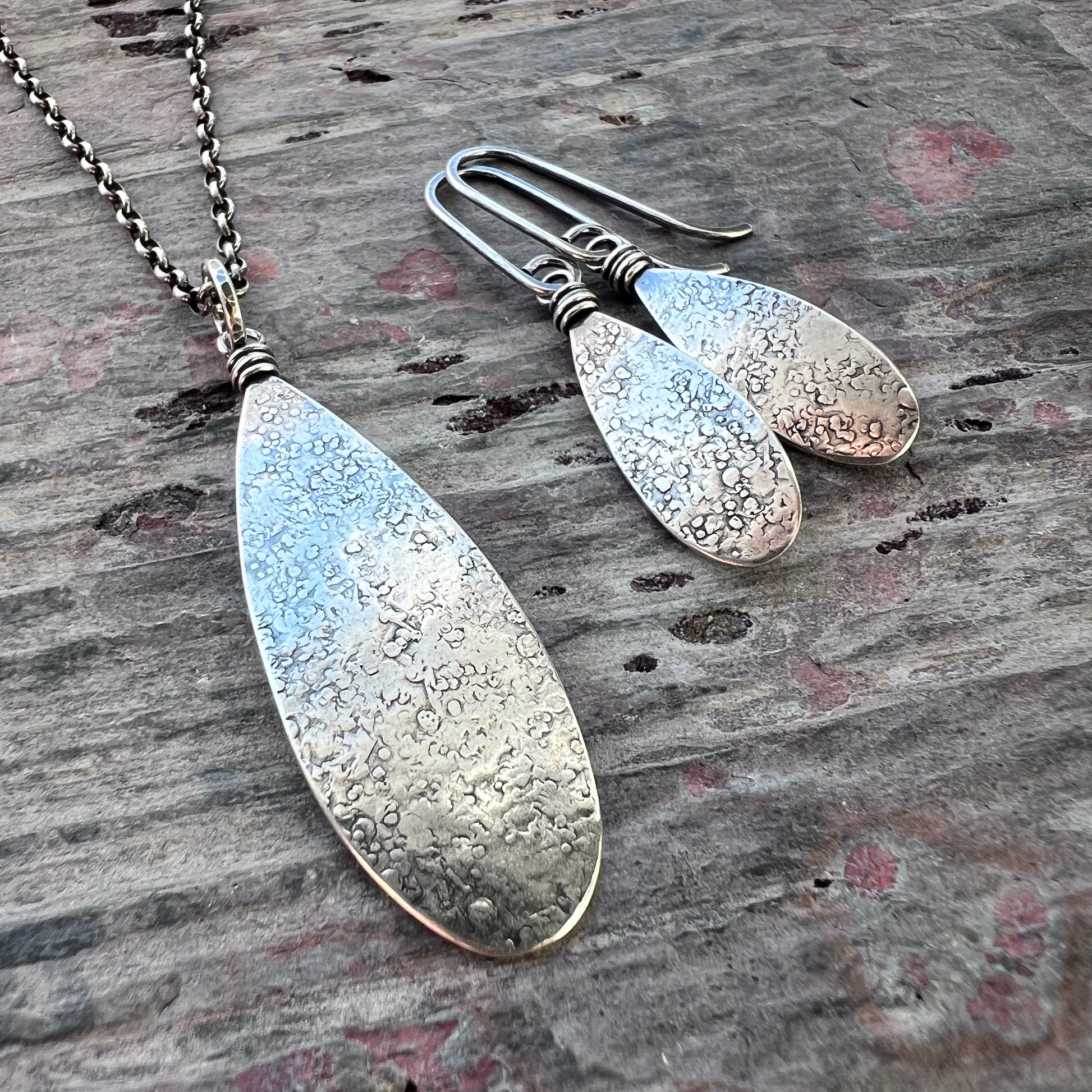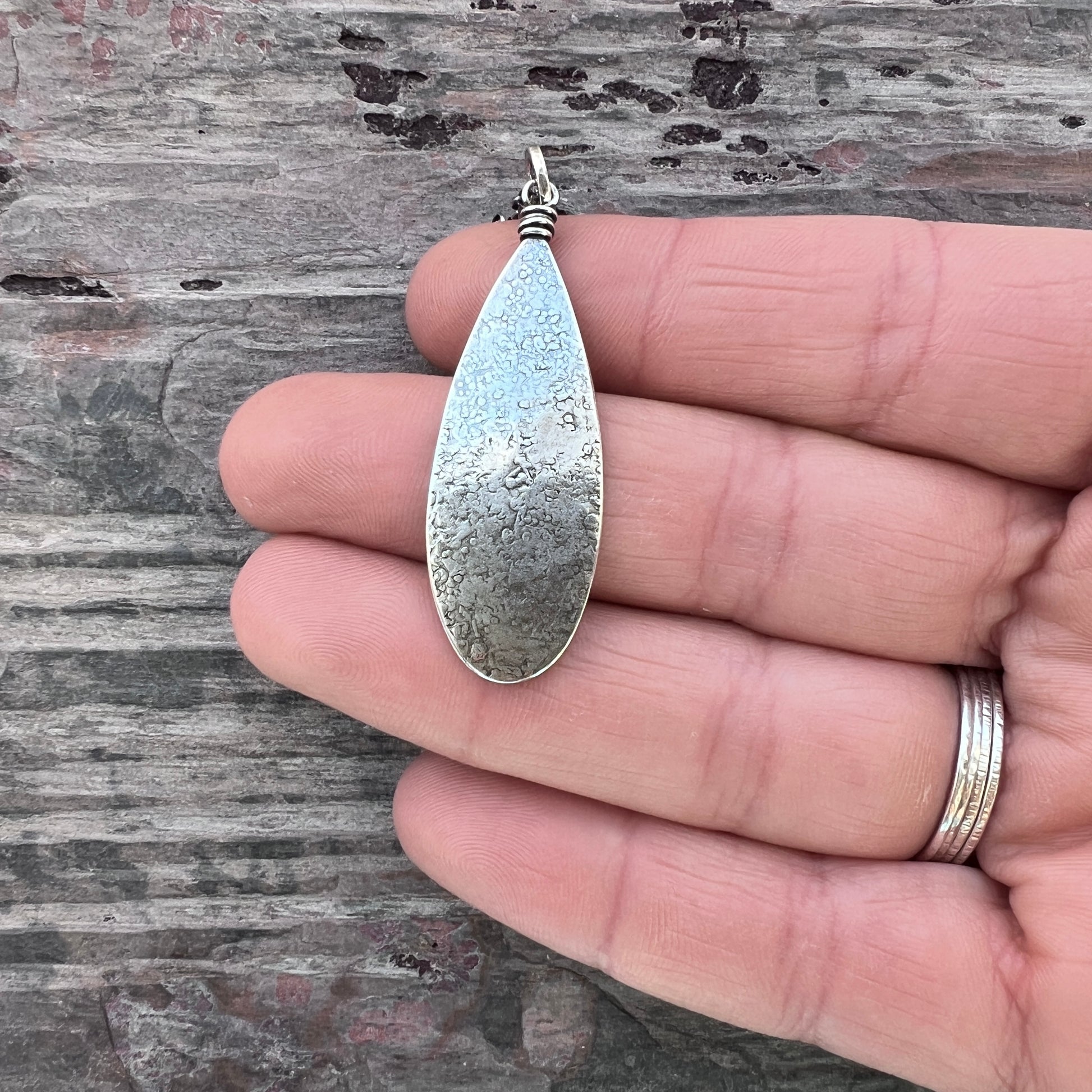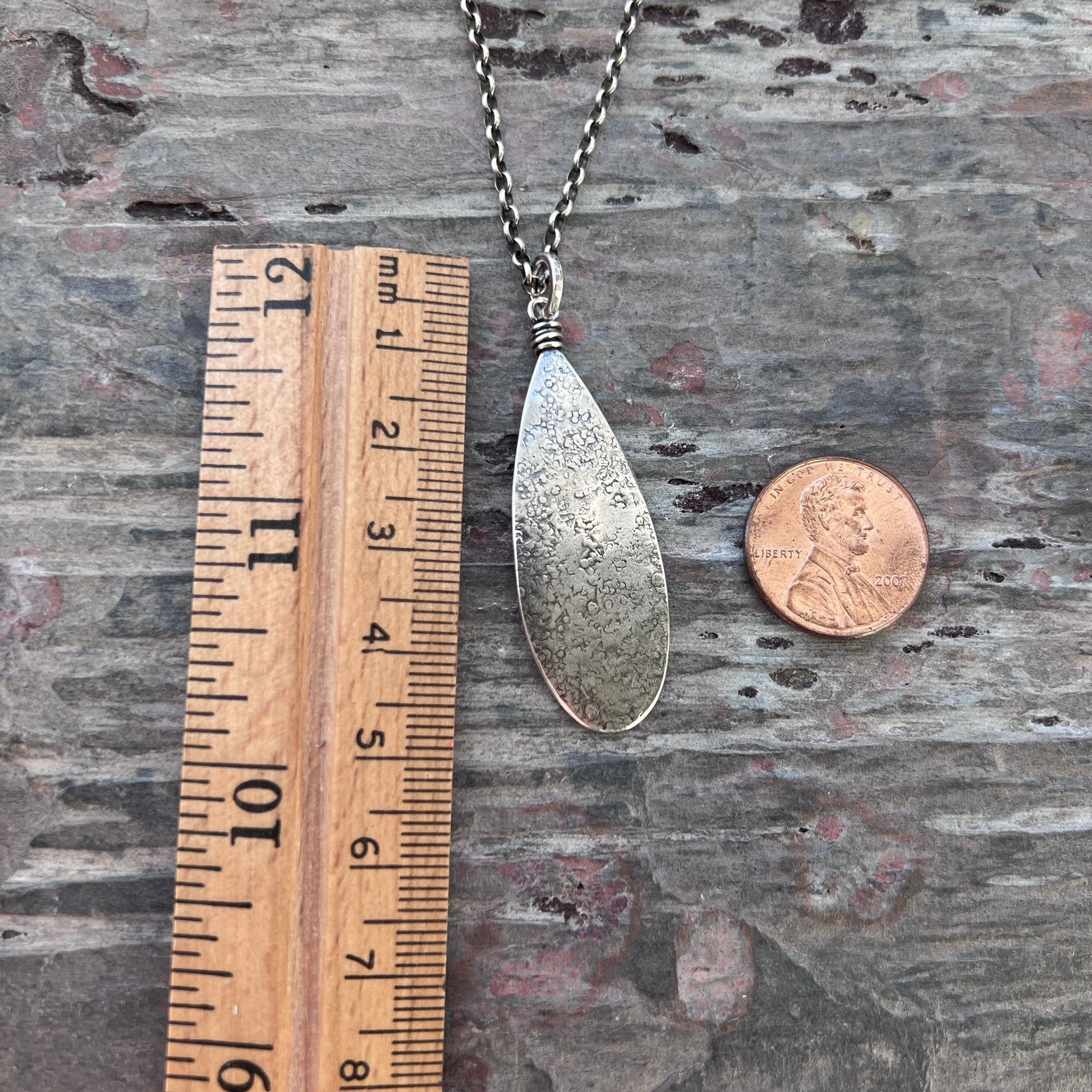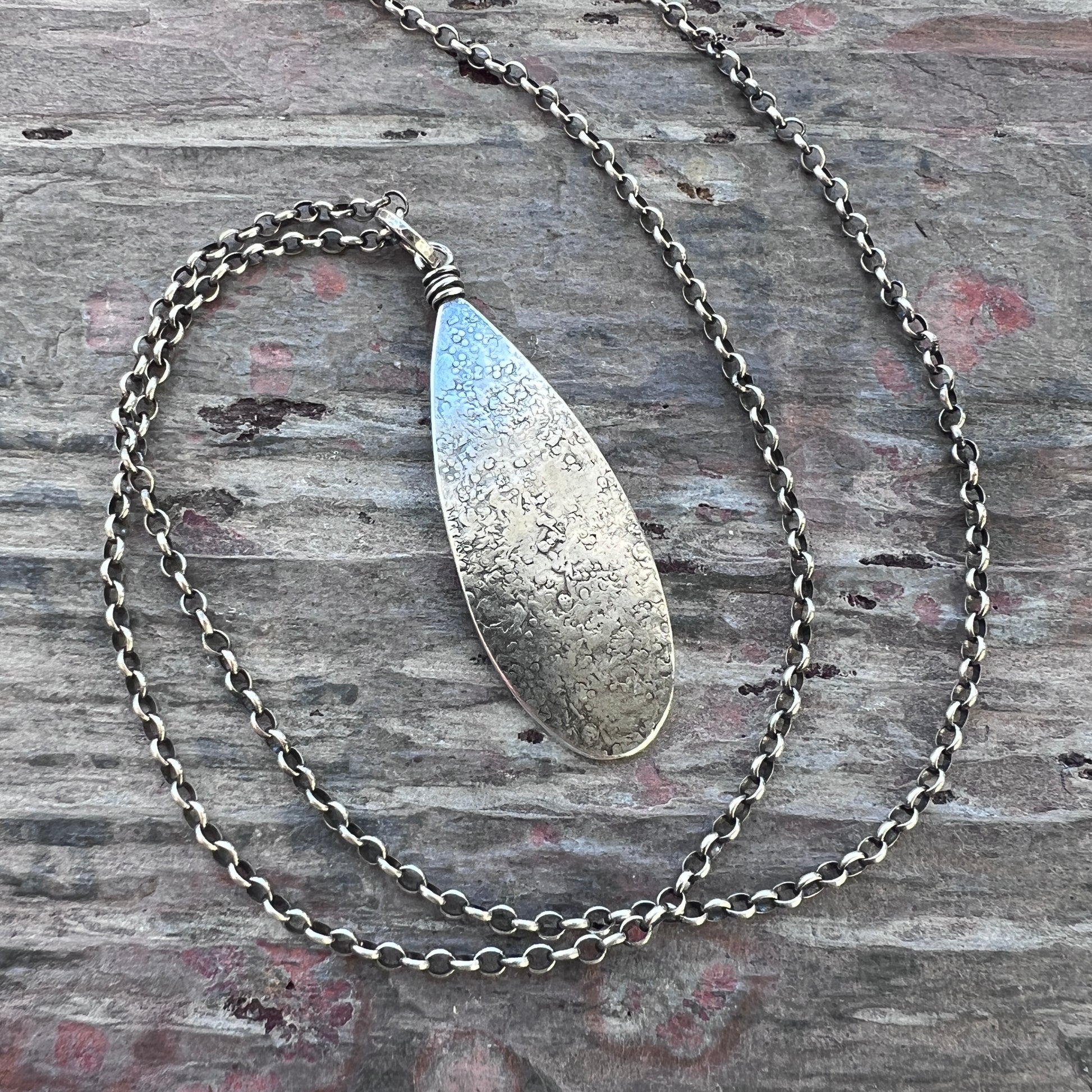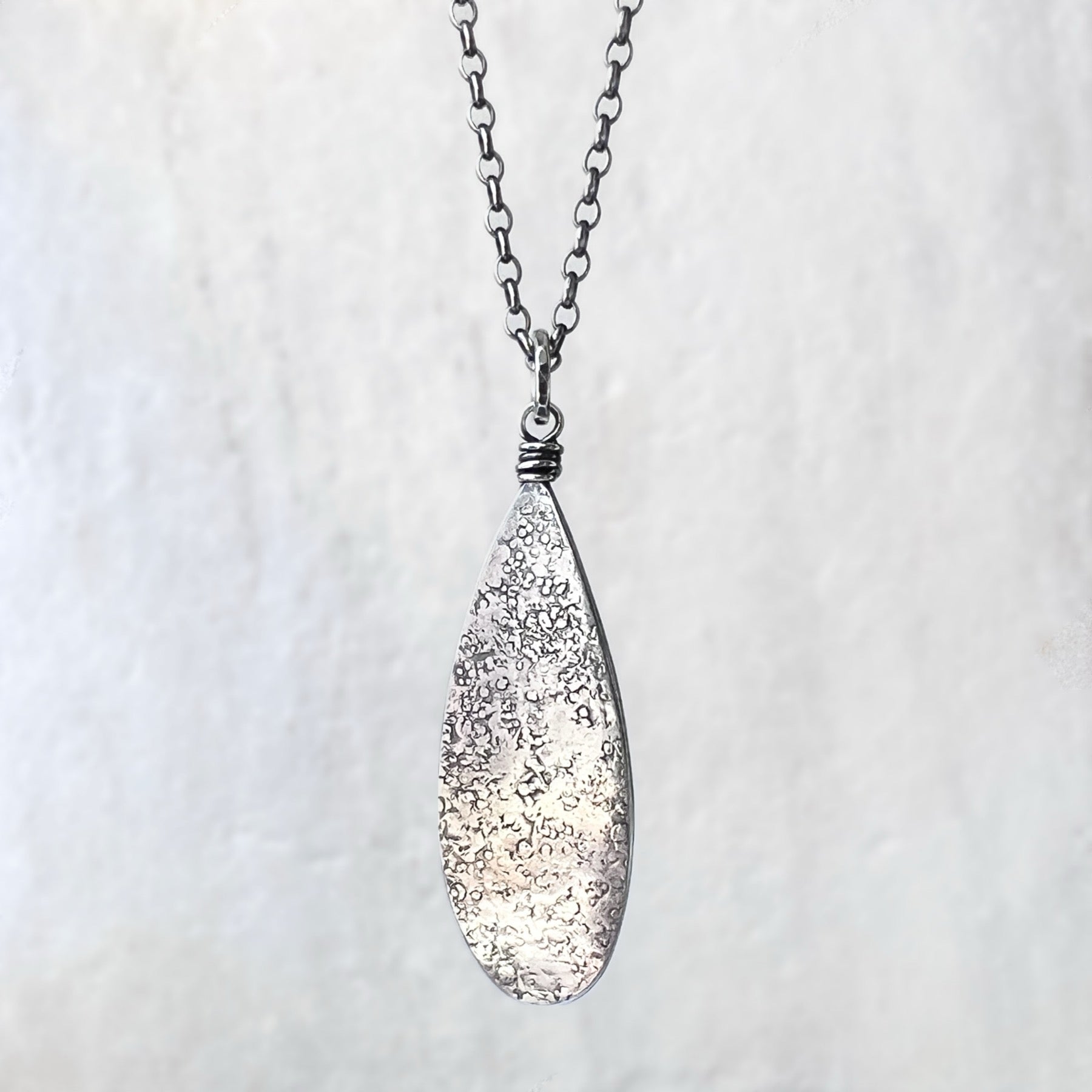 This teardrop pendant necklace is handmade from solid sterling silver. I have cut a teardrop from a sheet of silver using my jeweler's saw. I then used a variety of vintage hammers to create its unique texture. I have attached the bail with a wire-wrapped loop and suspended the pendant along a sterling silver chain. The chain features a 3-inch extender which allows it to be slightly adjustable. The silver has been oxidized and polished to create an antique patina finish.