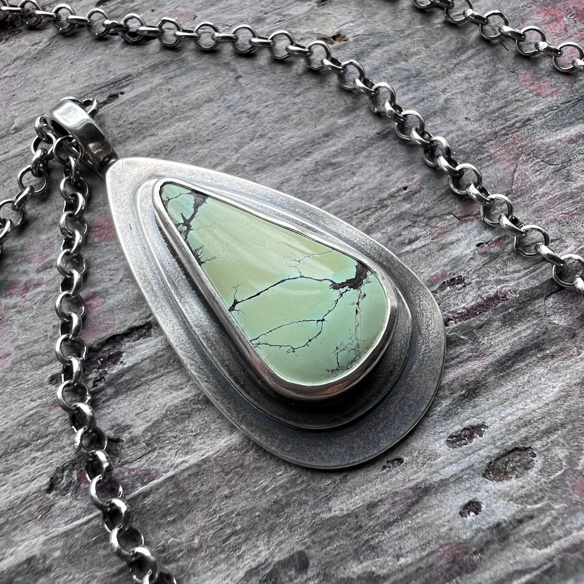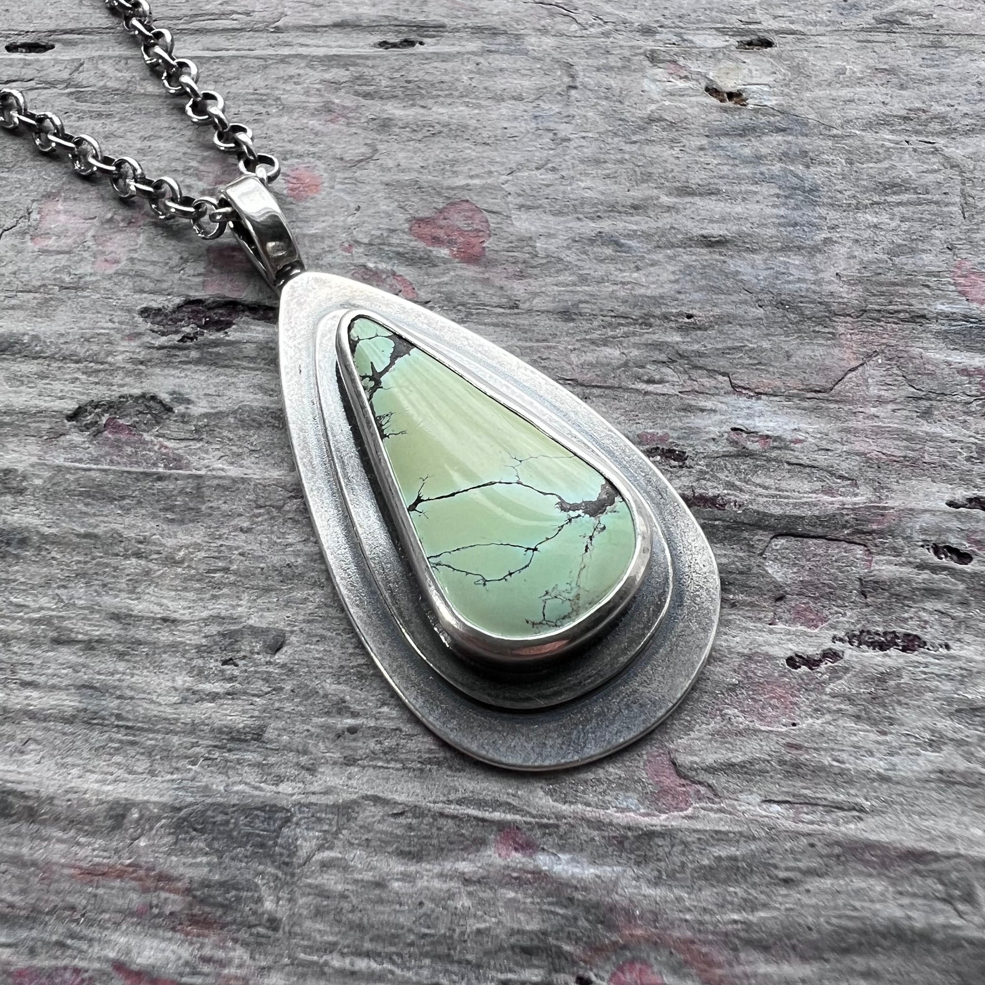 A genuine Turquoise teardrop cabochon has been set in sterling and fine silver. The natural stone is pale green in color and it is framed by two layers of silver. This unique pendant has been formed, soldered, and finished entirely by hand. The pendant hangs from a sterling silver chain featuring a 3-inch extender and a lobster claw clasp. It can be worn from between 22 to 25 inches in total length. I have oxidized and polished the silver to create an antique patina finish.