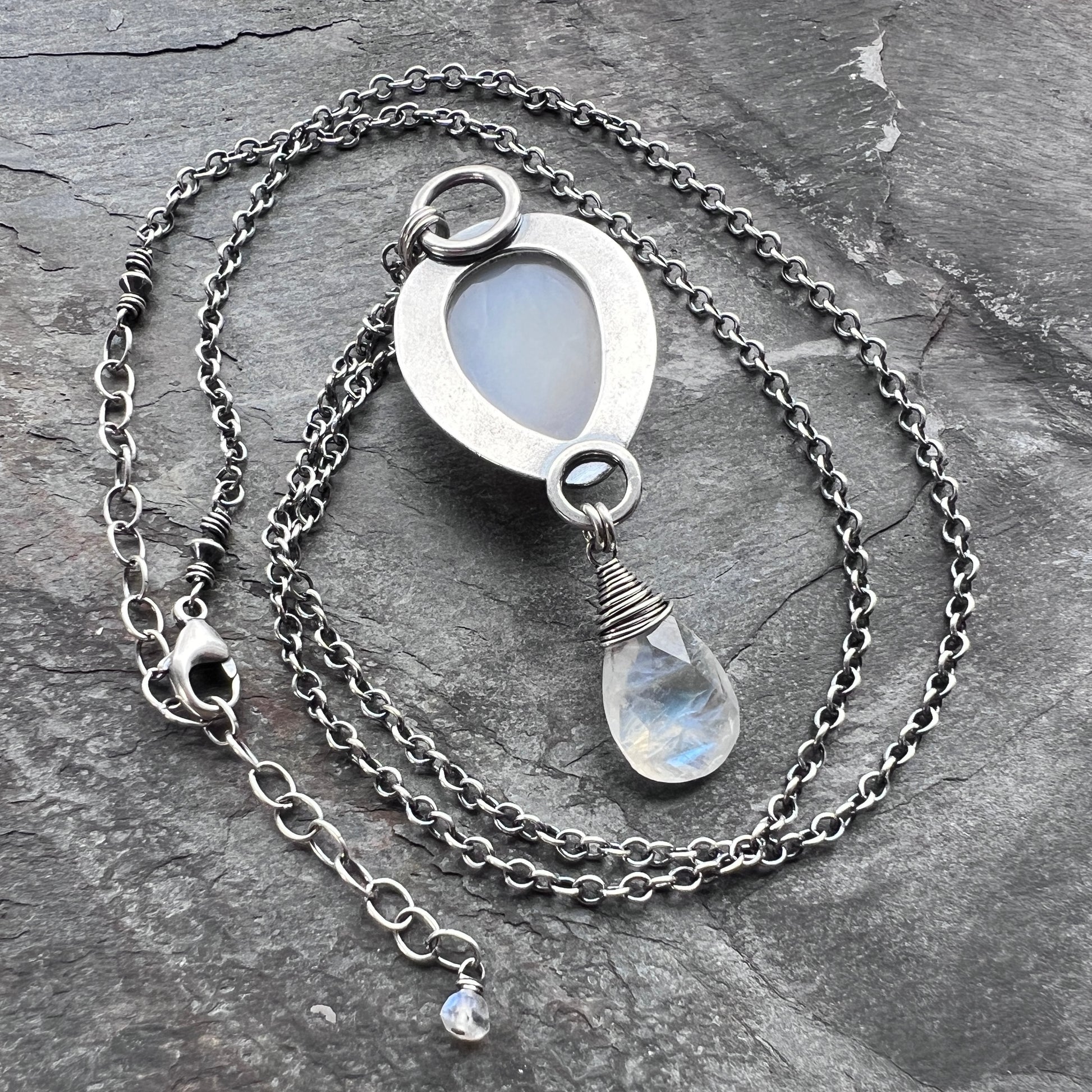 This long pendant necklace is handmade from sterling silver, agate druzy, and rainbow moonstone. The raw druzy crystals on this agate stone have been given an iridescent luster. The stone is framed by a textured silver border. Below the druzy dangles a natural rainbow moonstone teardrop. I have made this unique necklace by sawing, soldering, texturing, and finishing the design entirely by hand. The pendant hangs from a sterling silver chain featuring a 3-inch extender allowing it to be worn from between 22-25 inches in total length. The silver has been oxidized and polished to create an antique patina finish.
