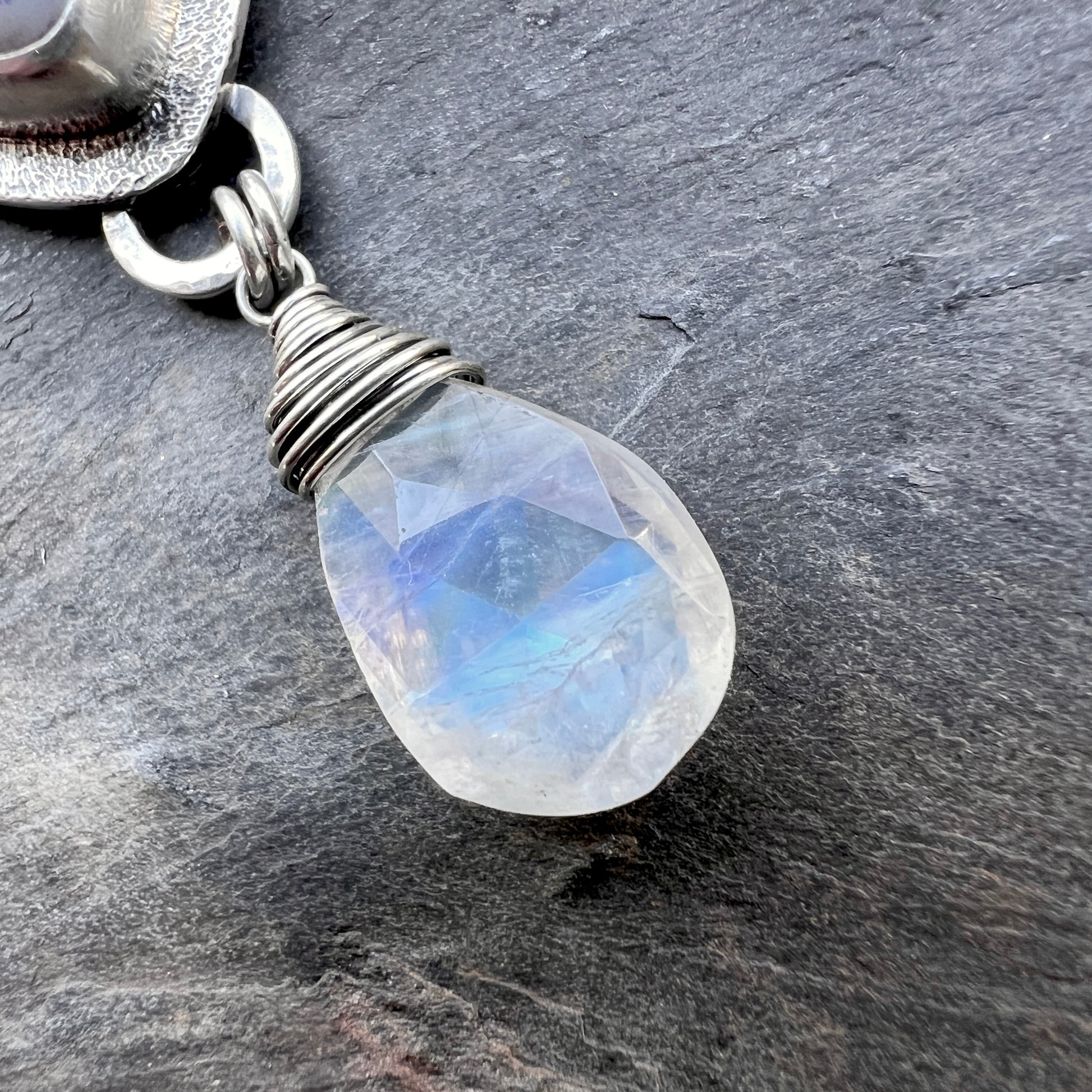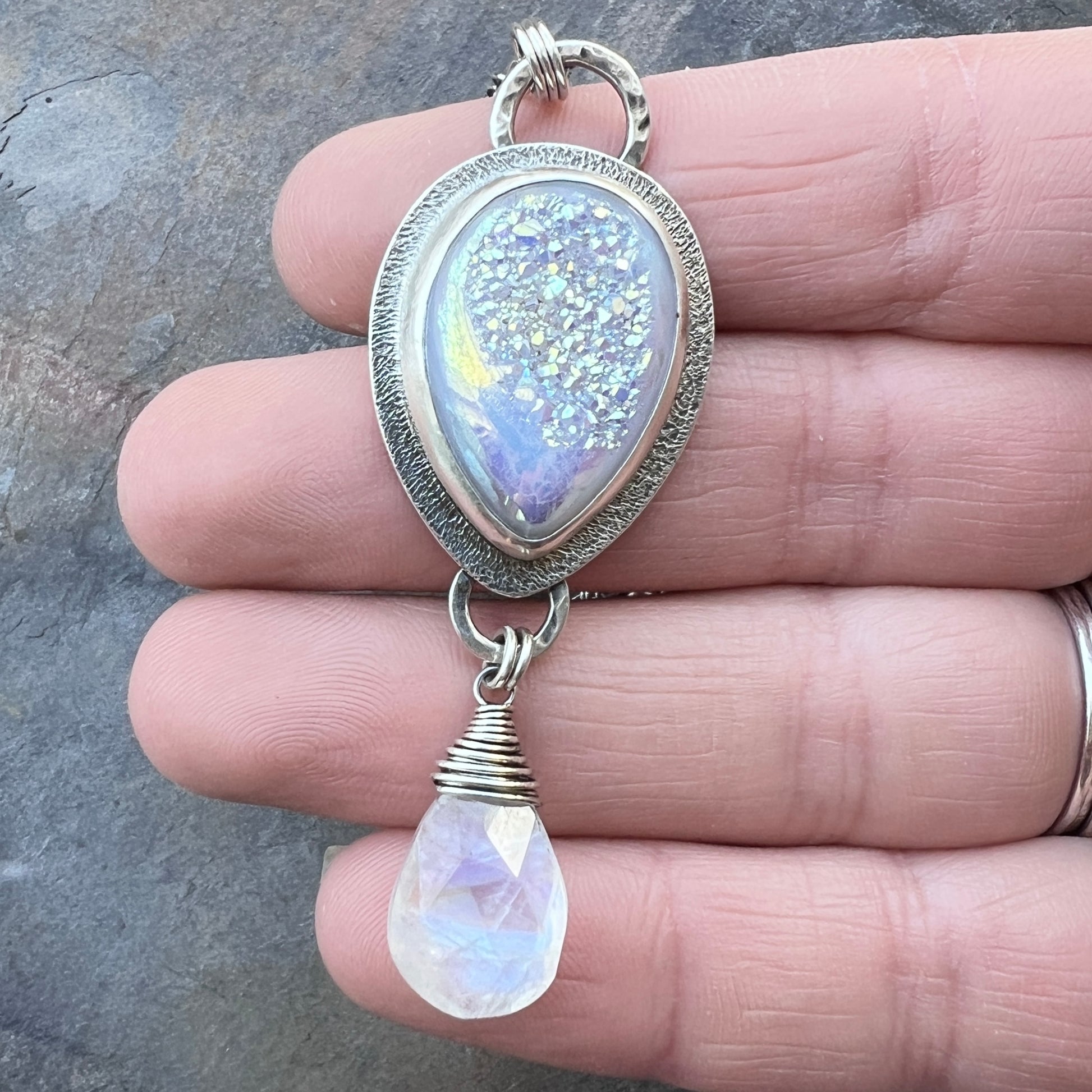 Sterling Silver Rainbow Moonstone and Druzy Necklace | Handmade One-of-a-Kind Stone Pendant