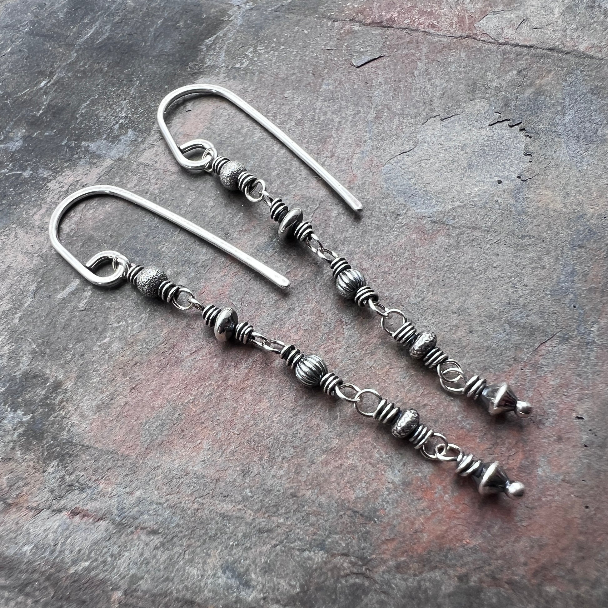 These long dangle earrings are handmade entirely from sterling silver. I have carefully wrapped a set of ten silver beads in wire. Each bead has its own unique shape and texture. The drop earrings are lightweight, versatile, and can be dressed up or down. The pair dangles from handmade sterling silver earwires. The silver has been oxidized and polished to create an antique patina finish.