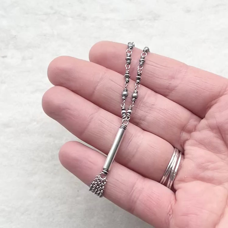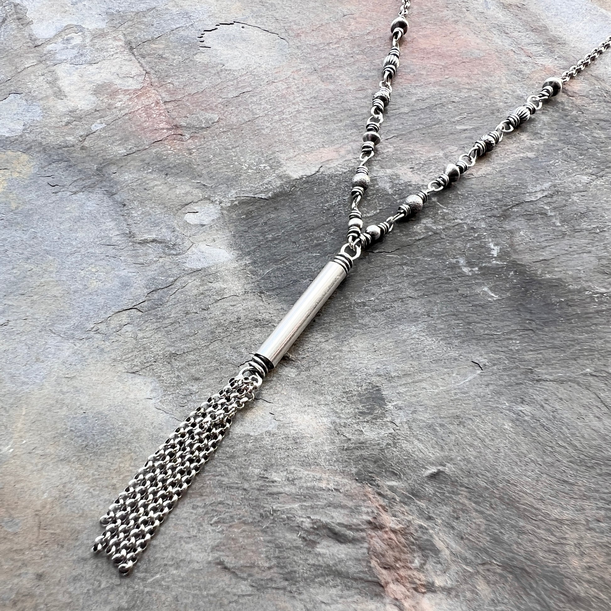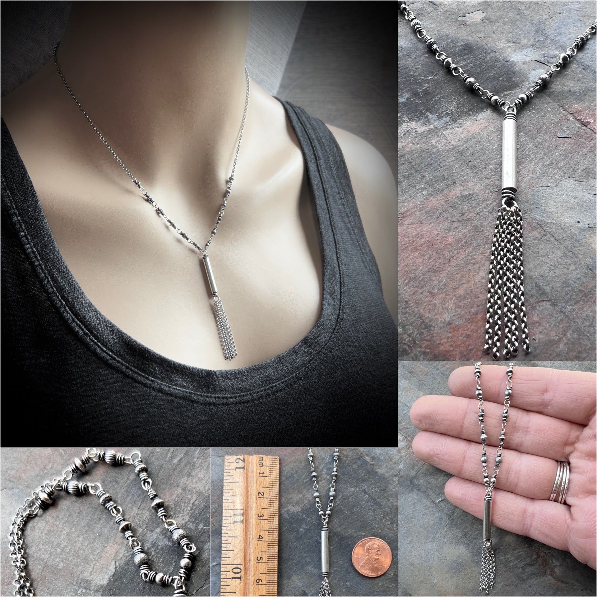 This beaded tassel necklace is handmade entirely from sterling silver. I have carefully wrapped a dozen different silver beads in wire. Below the beaded section of the chain dangles a silver tube and a set of fringed tassels. The beads and drop pendant are suspended along a sterling silver chain. The end of the chain features a lobster claw clasp and a 3-inch extender chain allowing the necklace to be slightly adjustable in length. The silver has been oxidized and polished to create an antique patina finish.