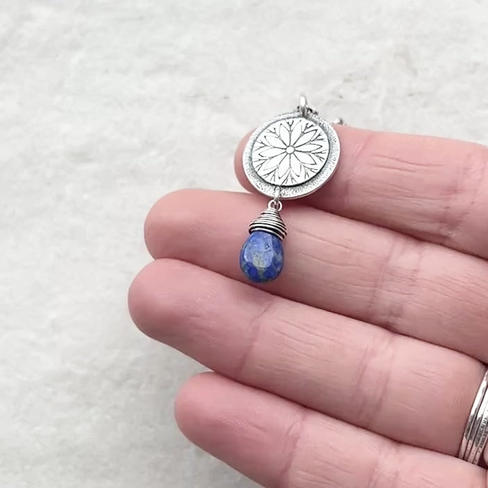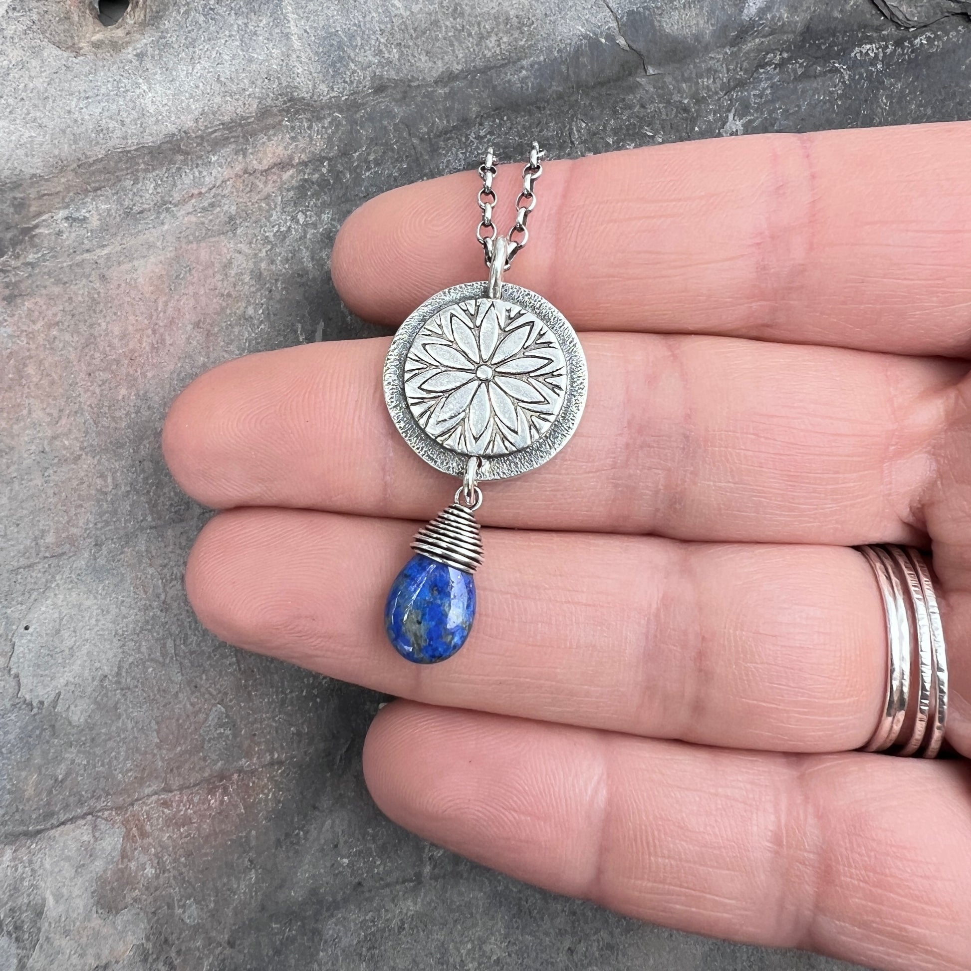 This flower pendant necklace is handmade from blue lapis lazuli and sterling silver. I have combined two circular layers of silver to create this design. On the top layer I have hand stamped a flower pattern into the silver. The outer bottom layer has been given a textured surface. Below the flower design dangles a blue lapis teardrop which has been wrapped in silver wire. The silver has been oxidized and polished to create an antique patina finish.