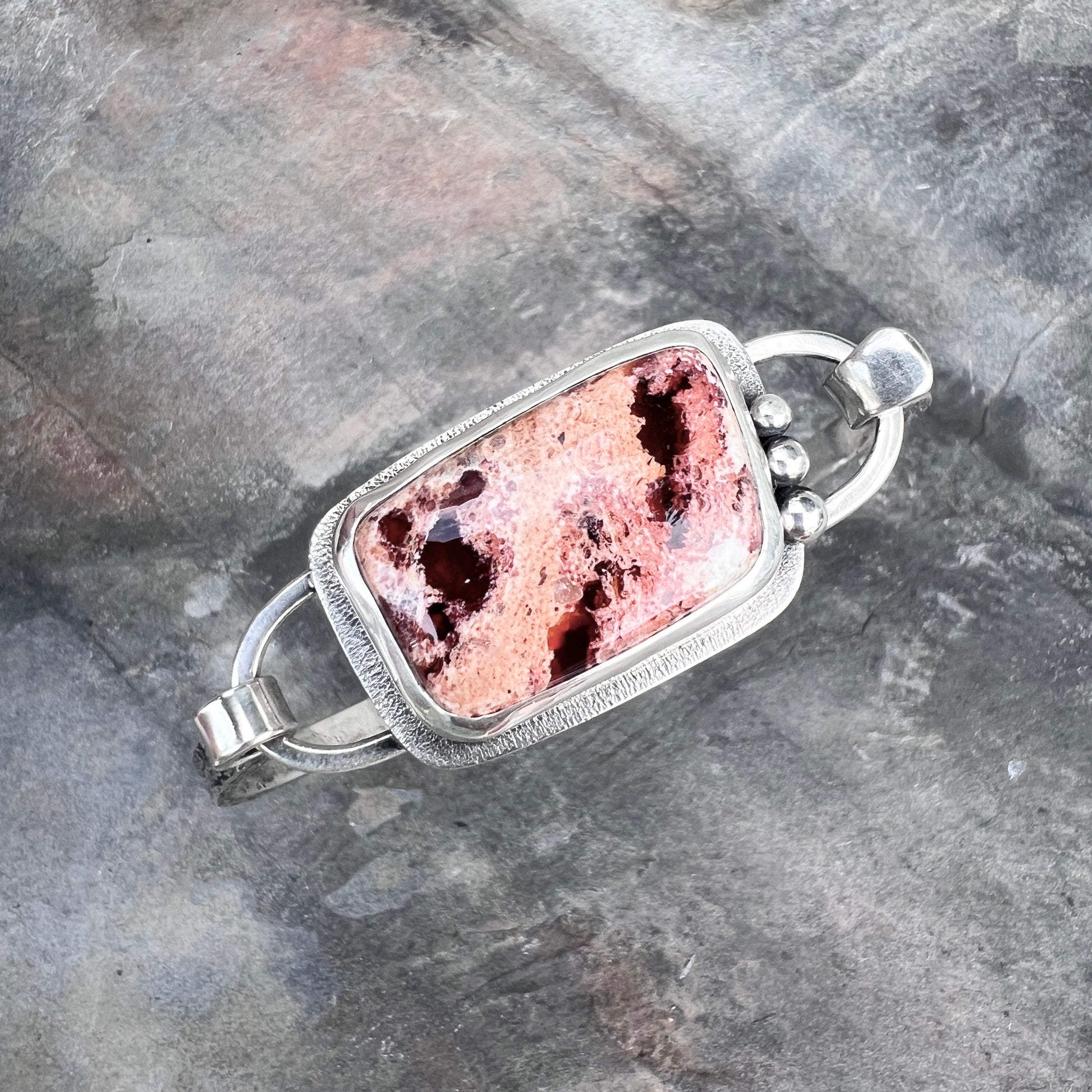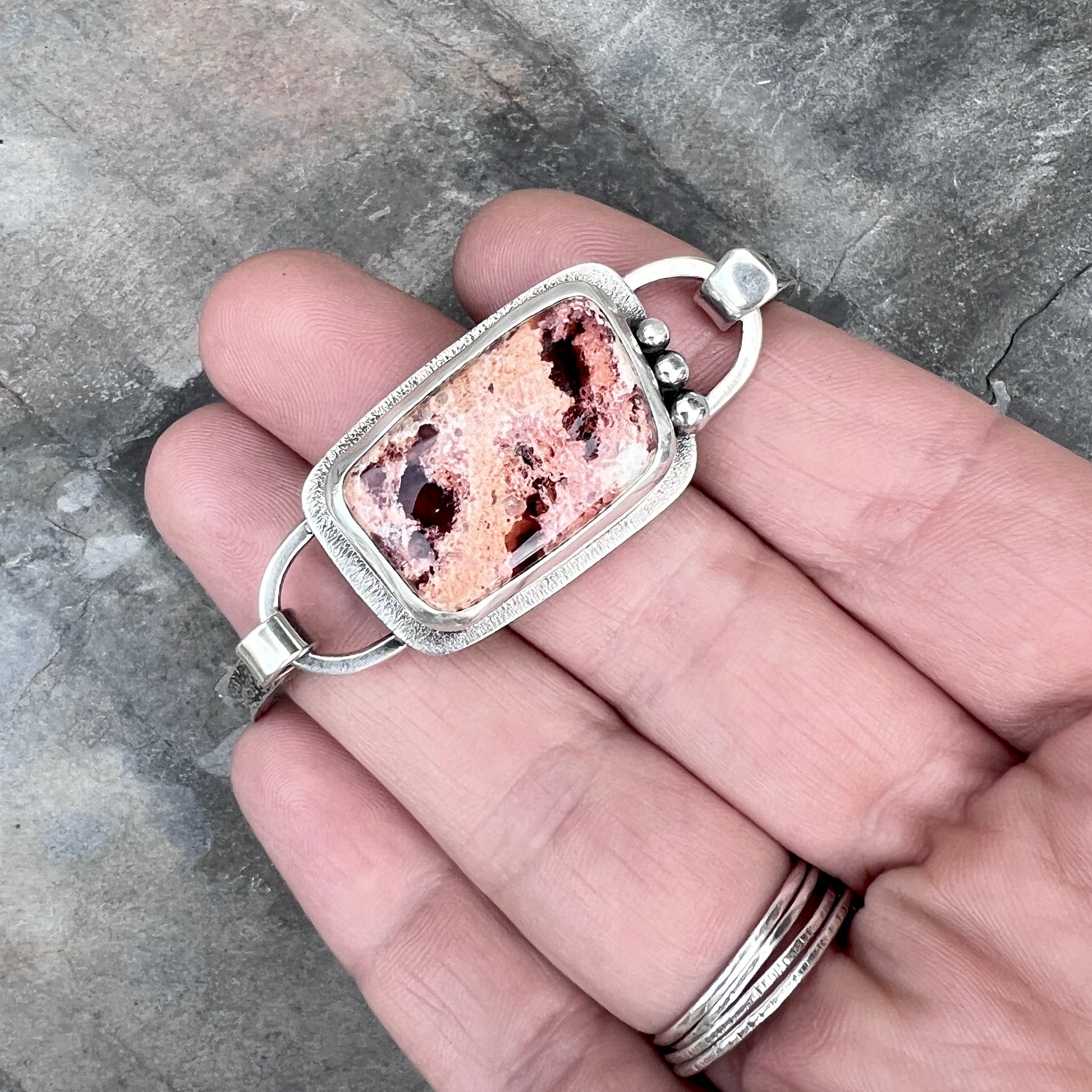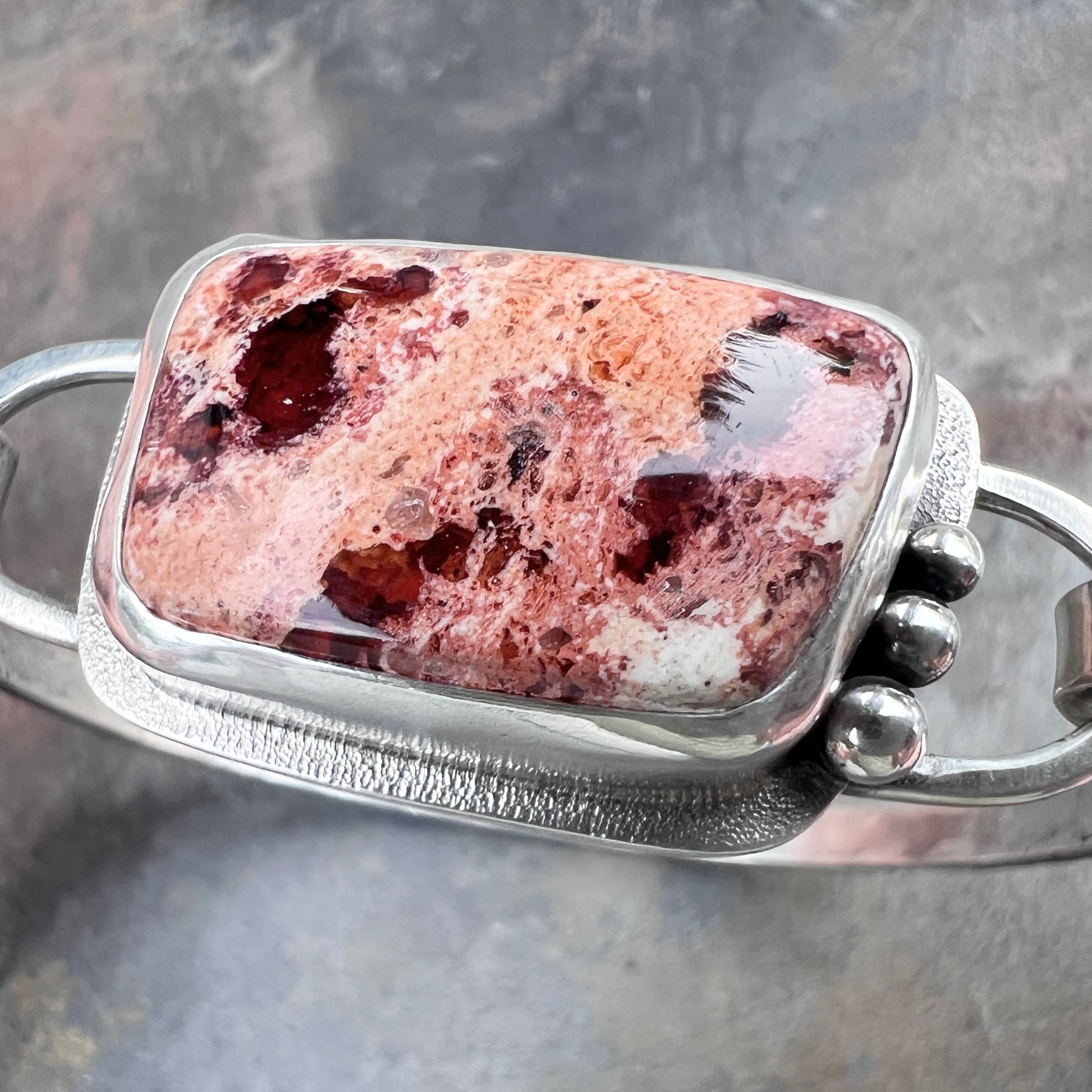This artisan tension cuff bracelet is handmade from sterling silver and a Mexican Fire Opal cabochon. The natural stone is framed by a textured silver border and accented with a trio of silver granules. The bracelet features a textured silver cuff. I have made this one of a kind bracelet by sawing, soldering, hammering, and finishing the design entirely by hand. The silver has been oxidized and polished to create an antique patina finish.