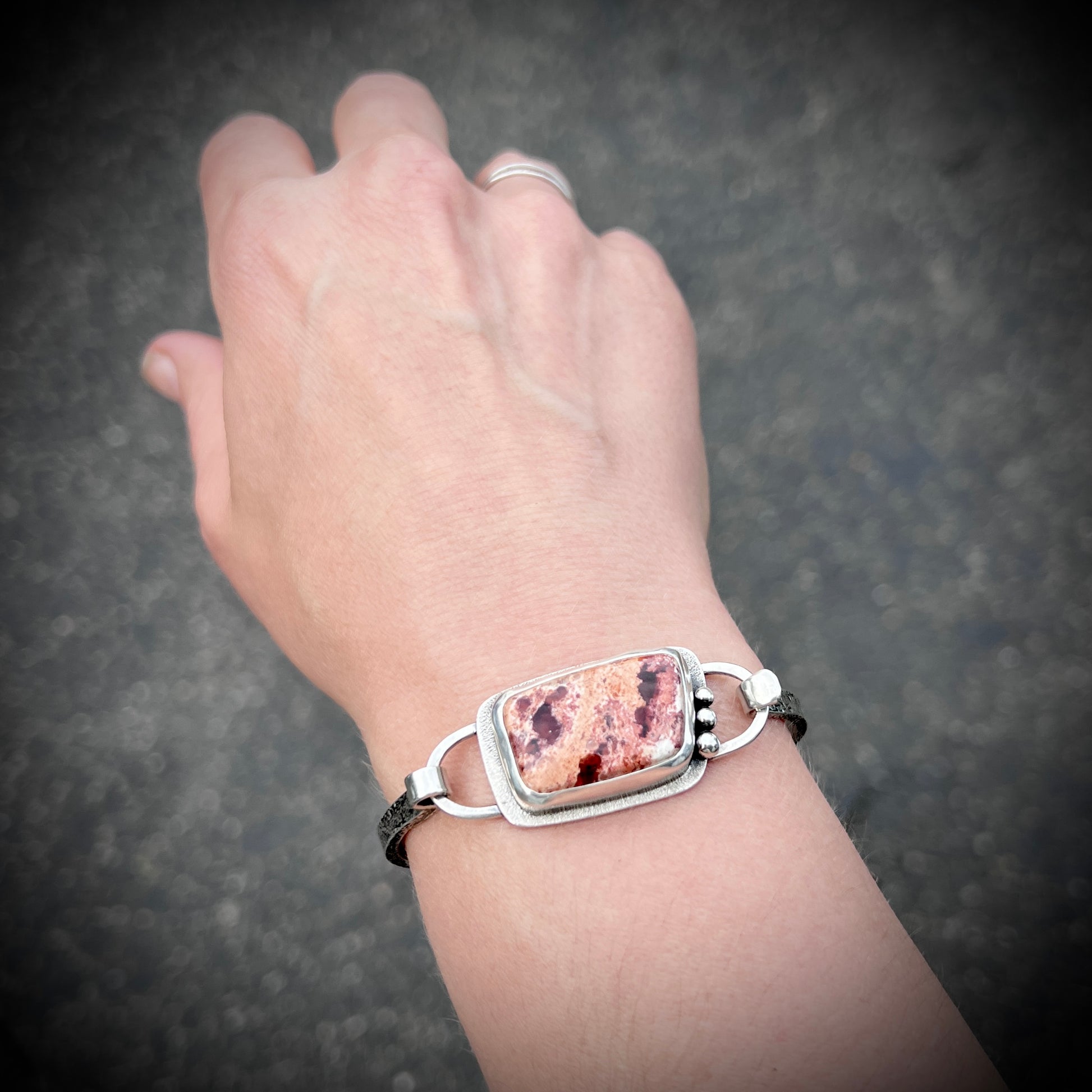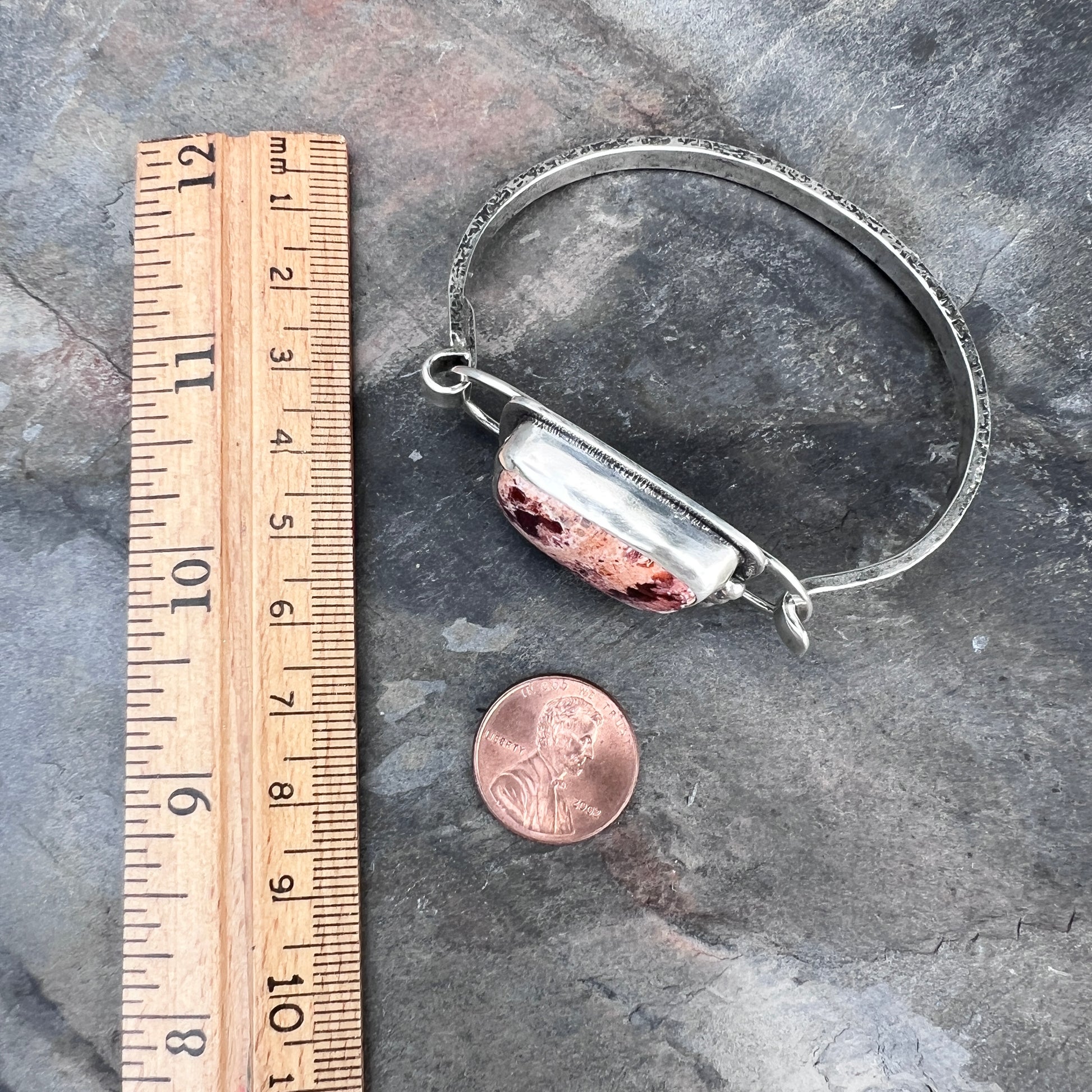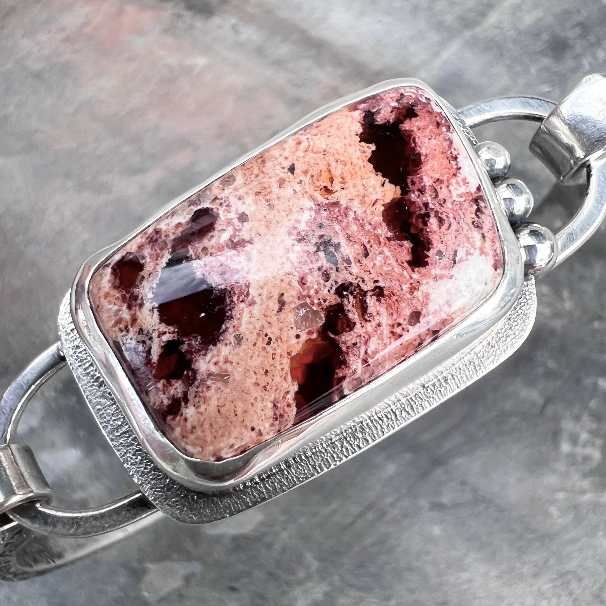 This artisan tension cuff bracelet is handmade from sterling silver and a Mexican Fire Opal cabochon. The natural stone is framed by a textured silver border and accented with a trio of silver granules. The bracelet features a textured silver cuff. I have made this one of a kind bracelet by sawing, soldering, hammering, and finishing the design entirely by hand. The silver has been oxidized and polished to create an antique patina finish.