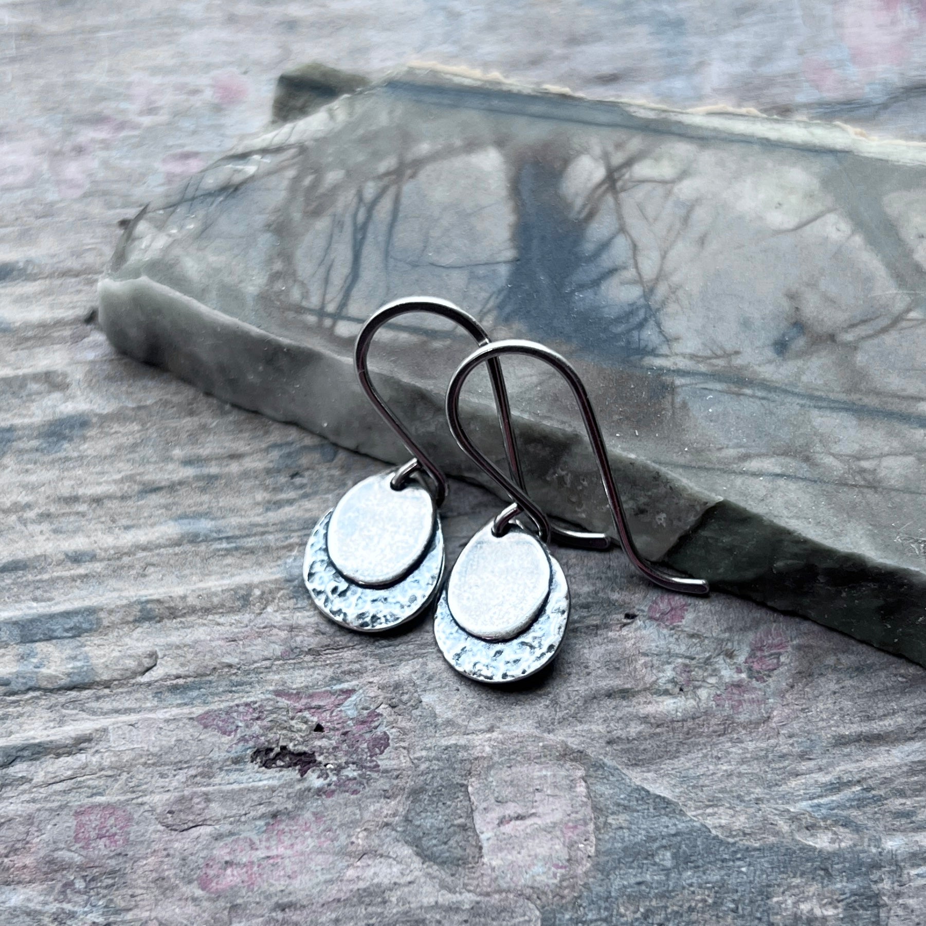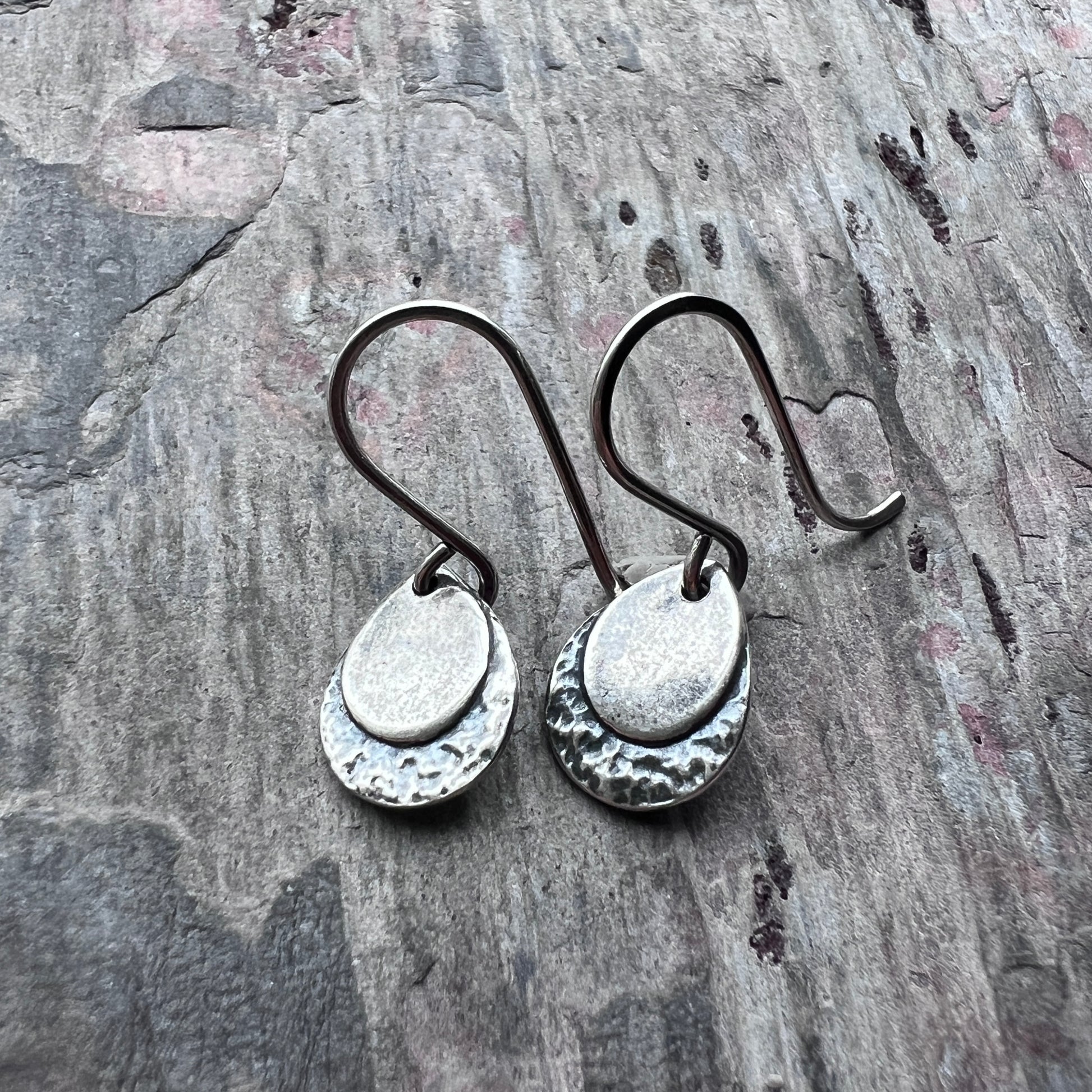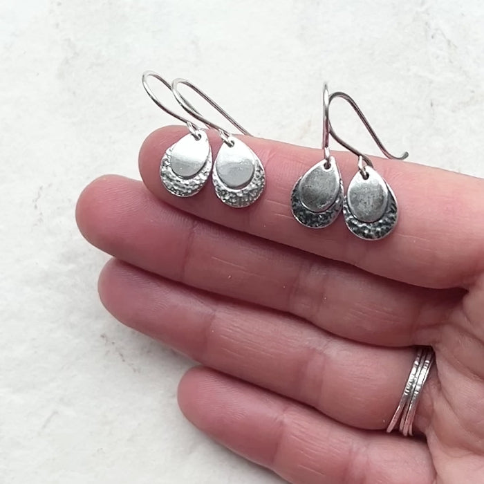These small teardrop dangle earrings are handmade from solid sterling silver. Each teardrop is made from two layers of silver which I have cut and textured by hand. The smooth inner teardrops are contrasted against hammered borders. The drops dangle from handmade sterling silver earwires.