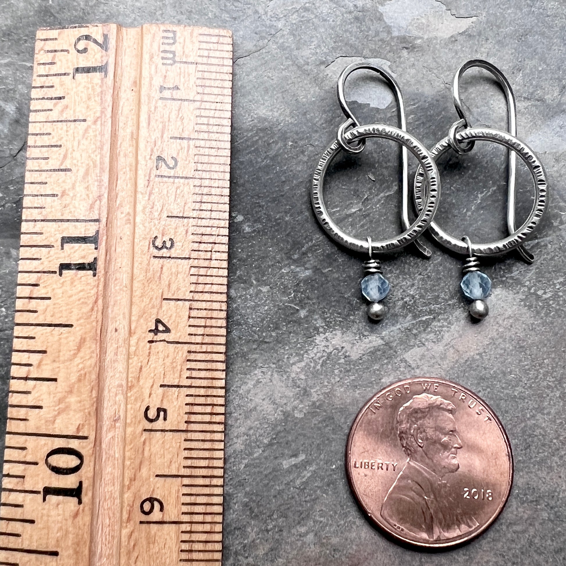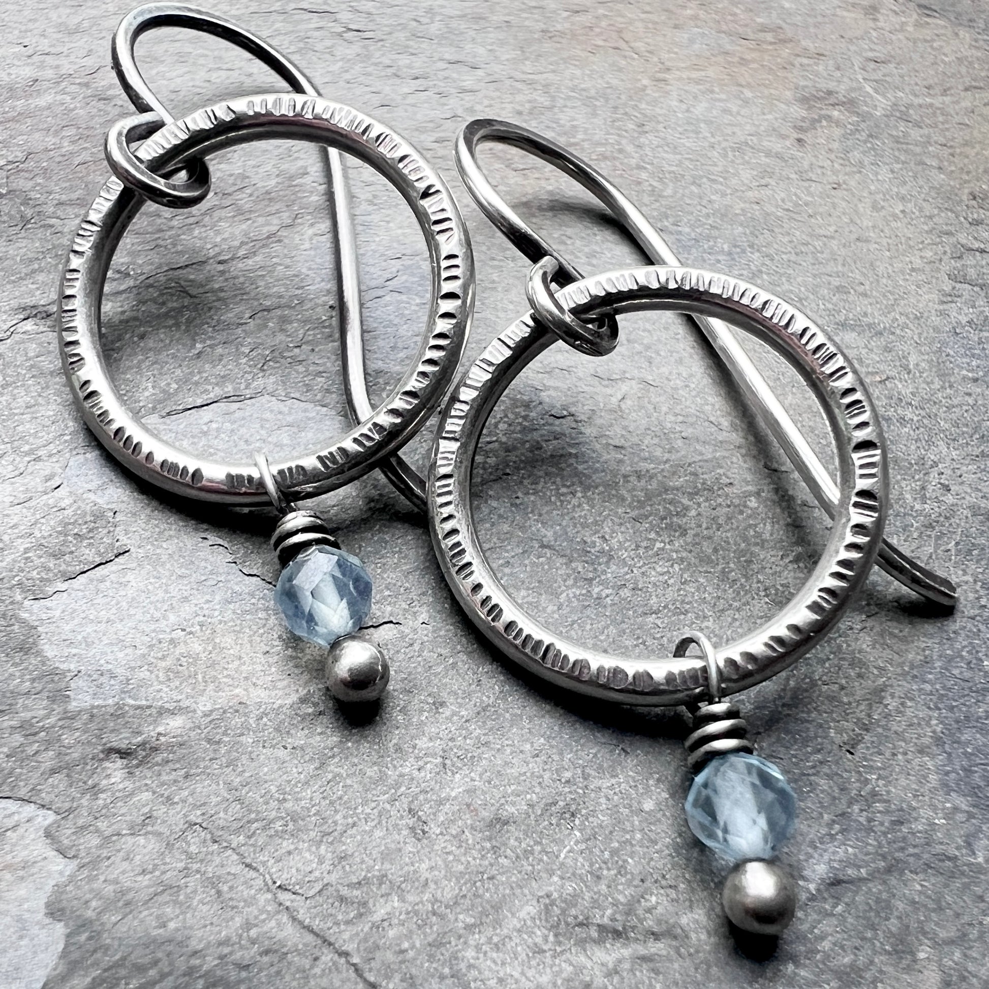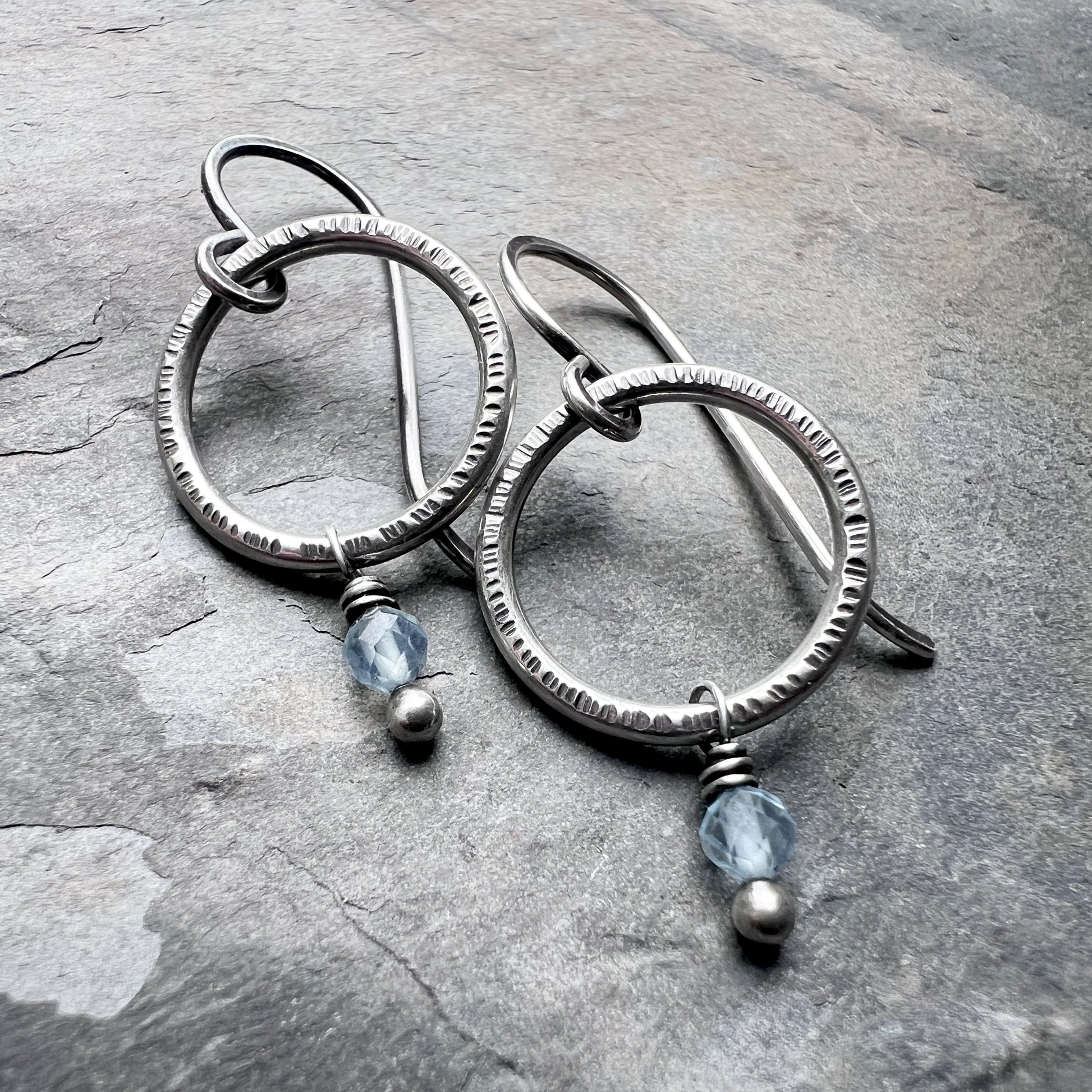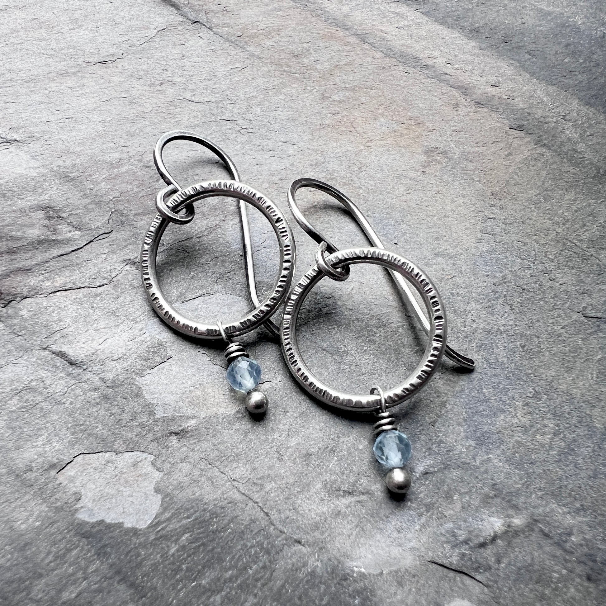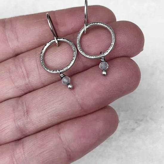 These customizable birthstone dangle hoop earrings are handmade from sterling silver and genuine gemstones. Two tiny birthstones are wrapped in sterling silver. The natural gems dangle below circular rings which I have formed, soldered, and hammered by hand. The earrings can be personalized with the birthstone of your choice. The hoops hang from handmade sterling silver earwires.