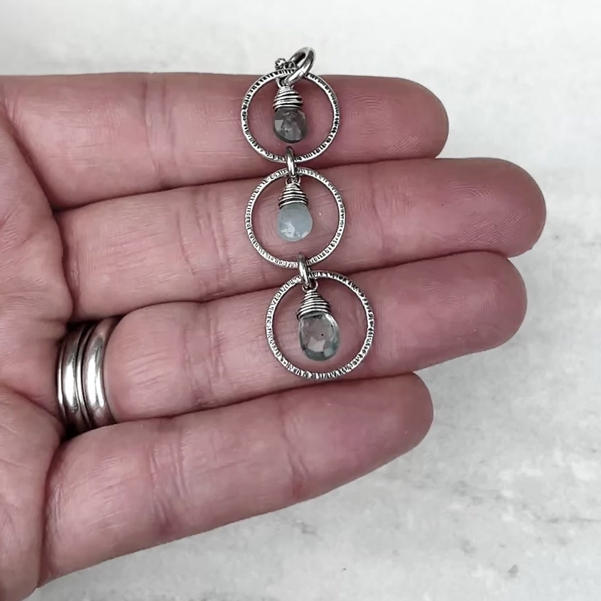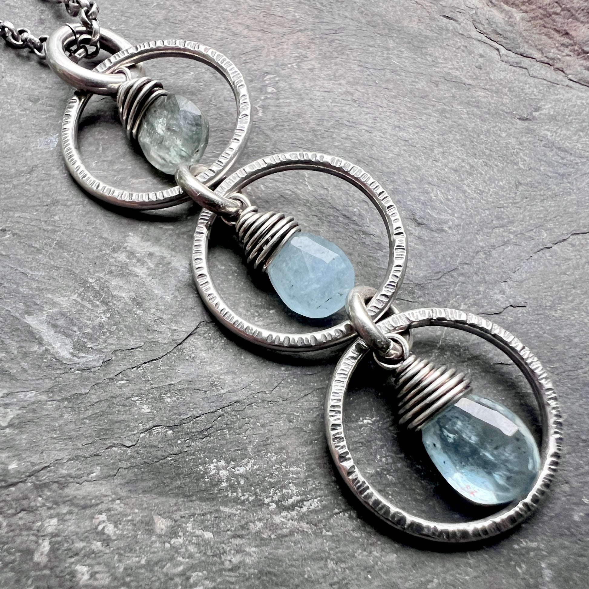 This pendant necklace is handmade from a set of genuine aquamarine stones and sterling silver. The natural aquamarine gems have been wrapped in sterling silver. Each of the teardrops is a unique variety of aquamarine. Green moss aquamarine is on the top, milky pale blue aquamarine is in the middle, and translucent aquamarine is on the bottom. Surrounding each stone is a silver ring which I have formed, soldered, and hammered by hand. The pendant hangs from a sterling silver chain which features a 3-inch extender allowing it to be slightly adjustable. The silver has been oxidized and polished to create a patina finish.