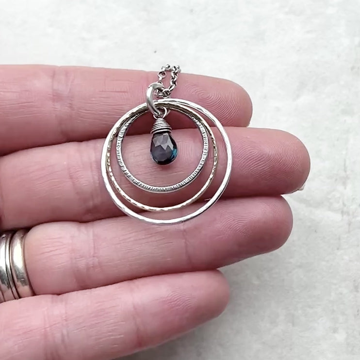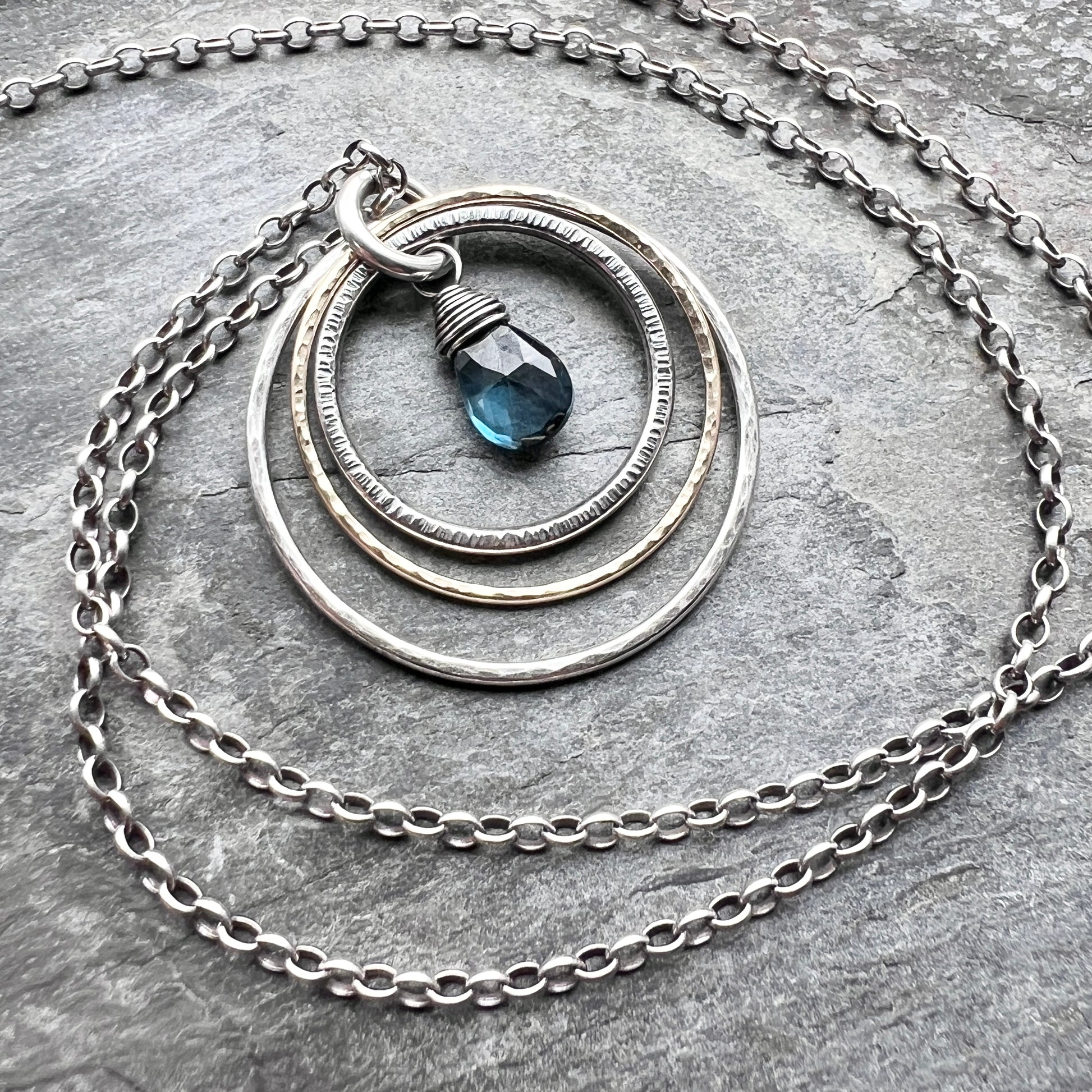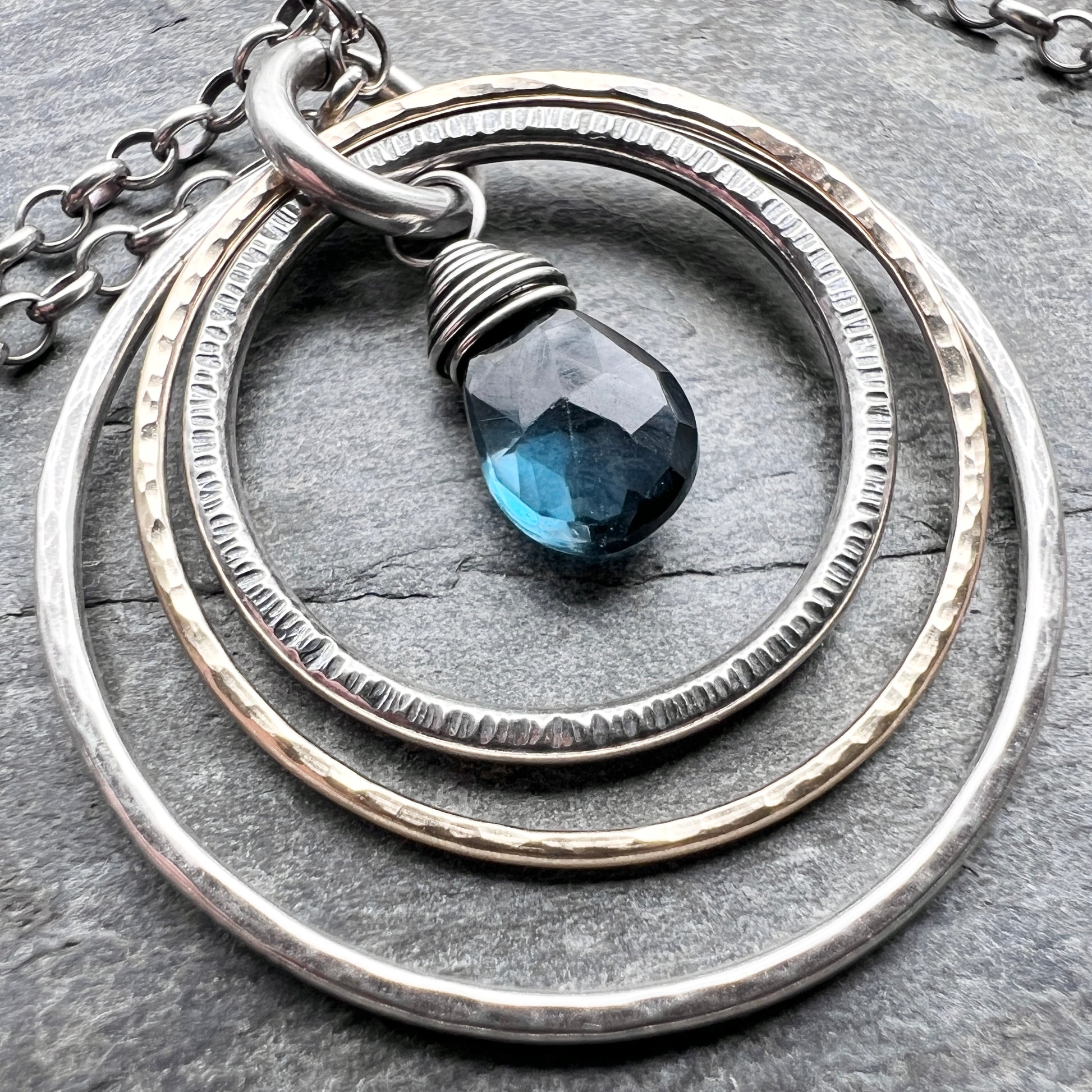 This pendant necklace is handmade from genuine London blue topaz, 14k goldfill, and sterling silver. I have wrapped the small natural stone in silver wire. The blue teardrop is framed by a set of sterling silver and gold filled rings which I have formed, soldered, and hammered by hand. The pendant hangs from a sterling silver chain which features a 3-inch extender allowing it to be slightly adjustable. The silver has been oxidized and polished to create a patina finish.