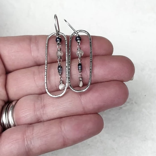 Framing the gems is a pair of elongated ovals which I have formed, soldered, and hammered by hand. The earrings dangle from handmade sterling silver earwires. The silver has been oxidized and polished to create a patina finish.