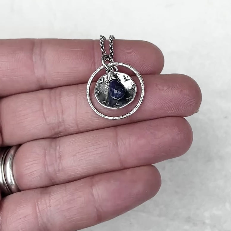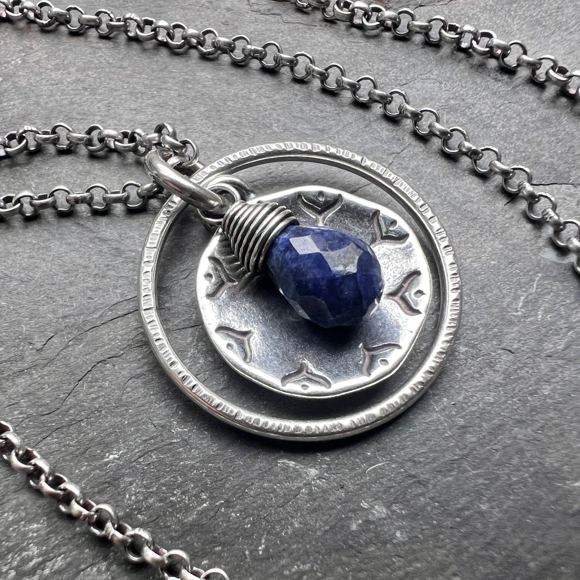 This pendant necklace is handmade from genuine sapphire and sterling silver. I have wire-wrapped the natural stone in silver wire. The dark blue teardrop hangs inside a stamped silver circle and is framed by a hammered silver ring. The silver has been oxidized and polished to create a patina finish.