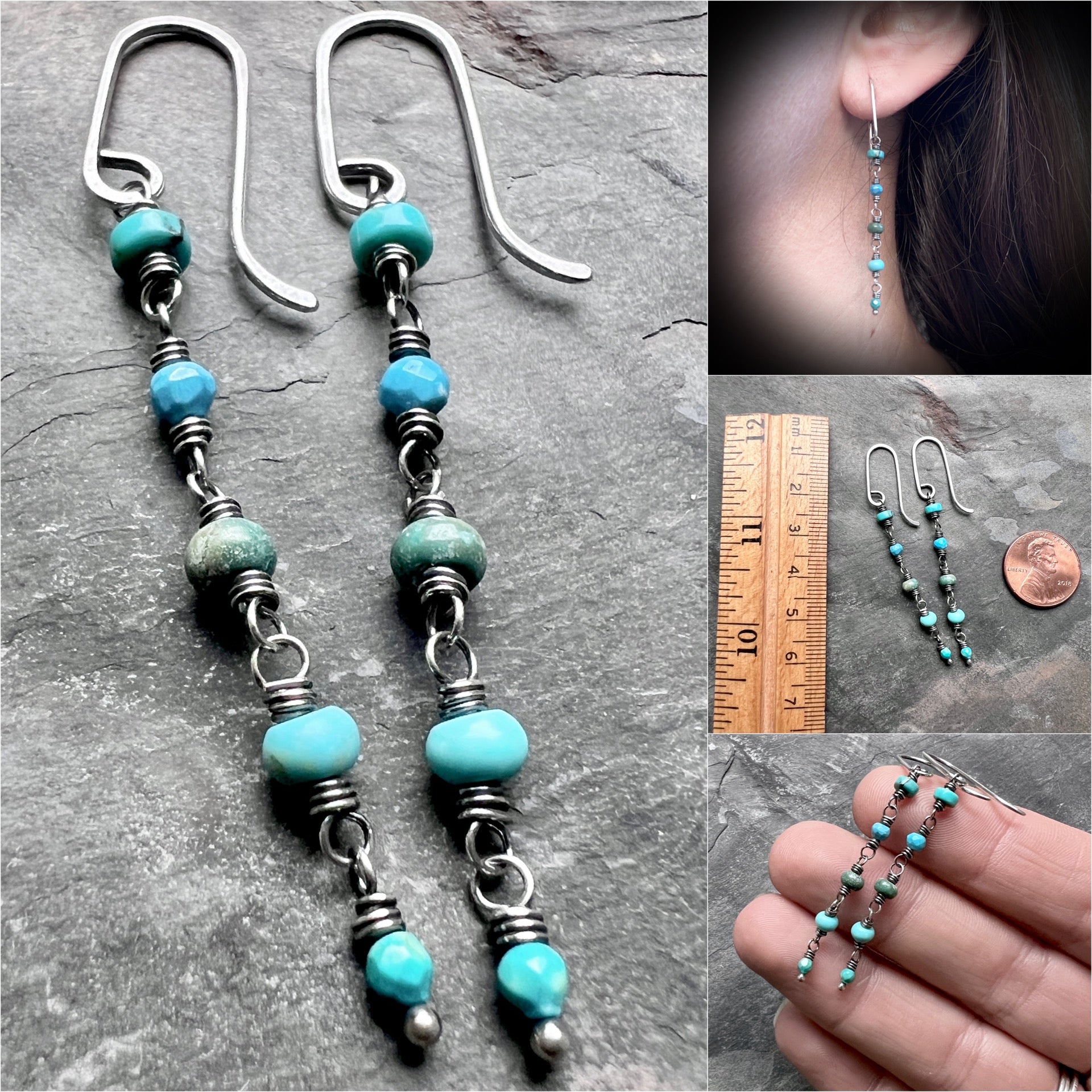 Genuine Turquoise Sterling Silver Earrings | Mixed Natural Stone Long Dangle Earrings