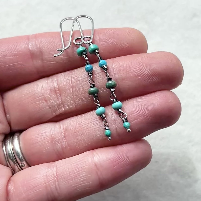 These lightweight wire-wrapped dangle earrings are handmade from genuine turquoise and sterling silver. I have carefully wrapped a variety of different turquoise stones in sterling silver wire. The earrings hang from handmade sterling silver earwires. The silver has been oxidized and polished to create an patina finish.