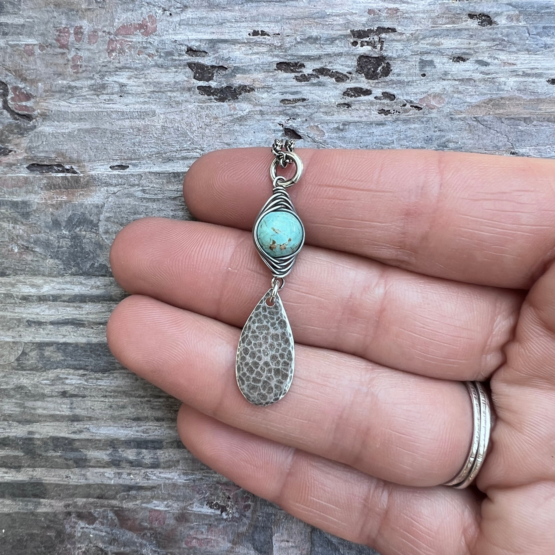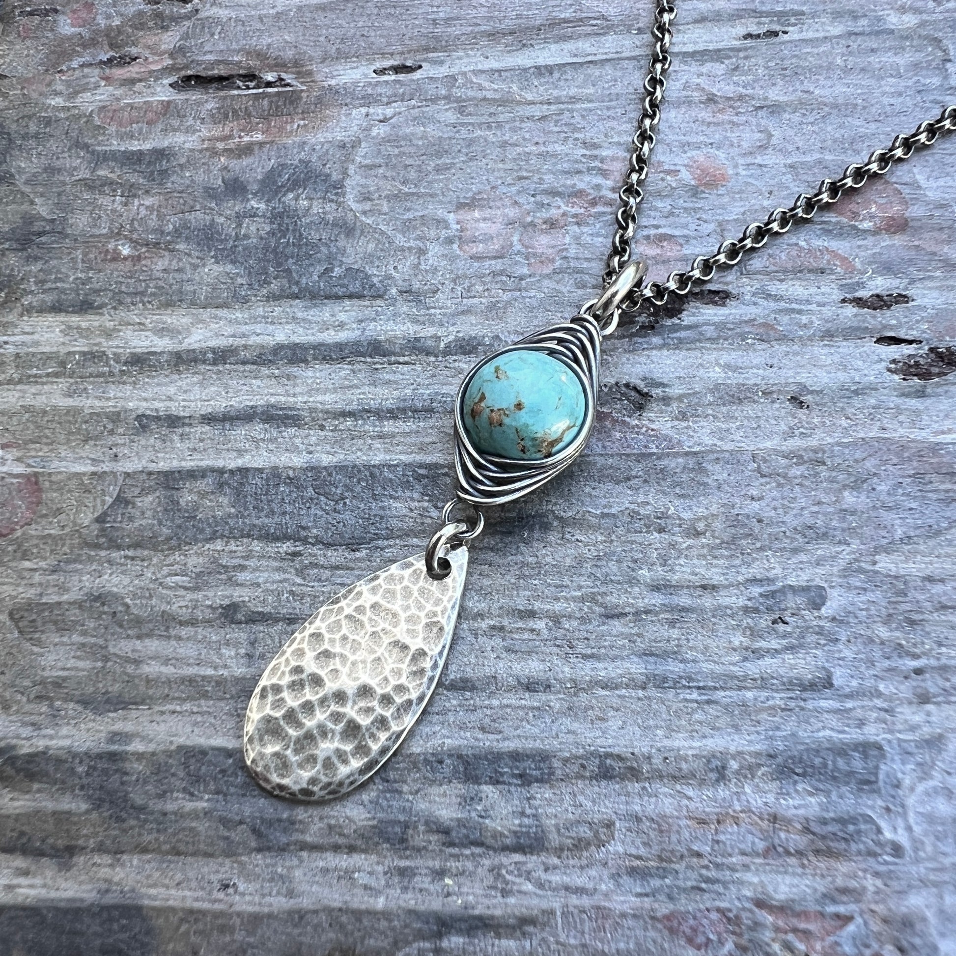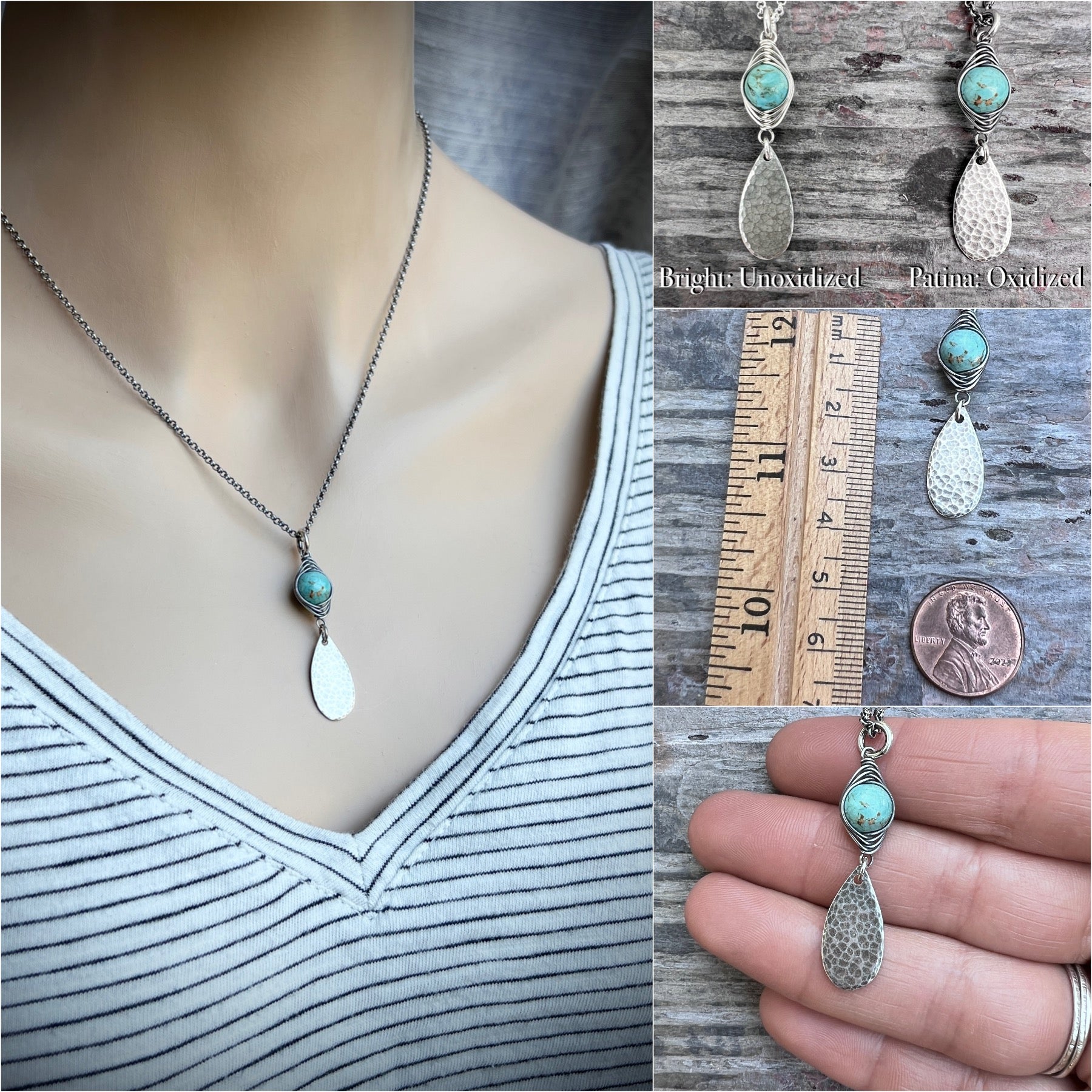 Genuine Turquoise Sterling Silver Necklace | Wire-wrapped Natural Stone and Hammered Teardrop Pendant