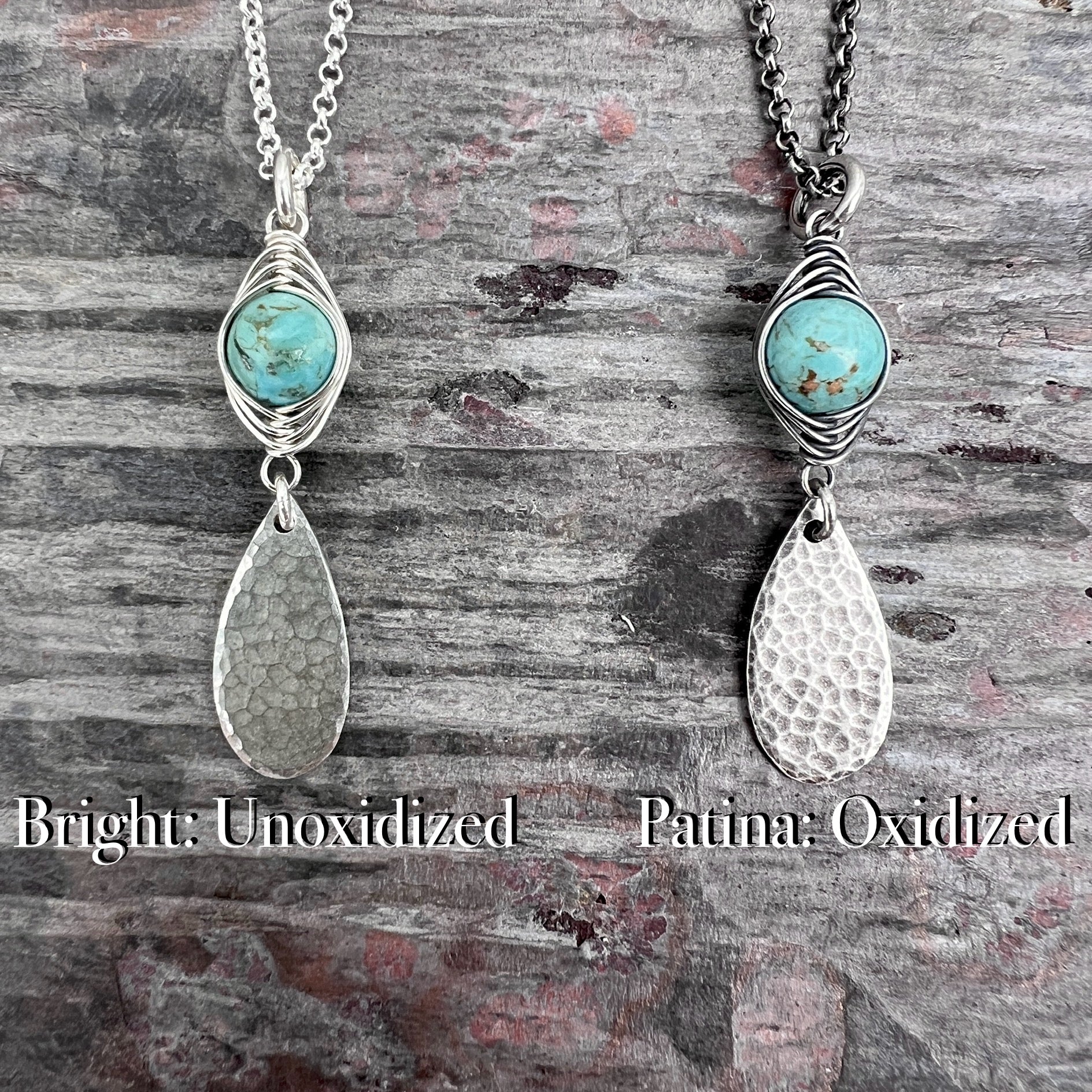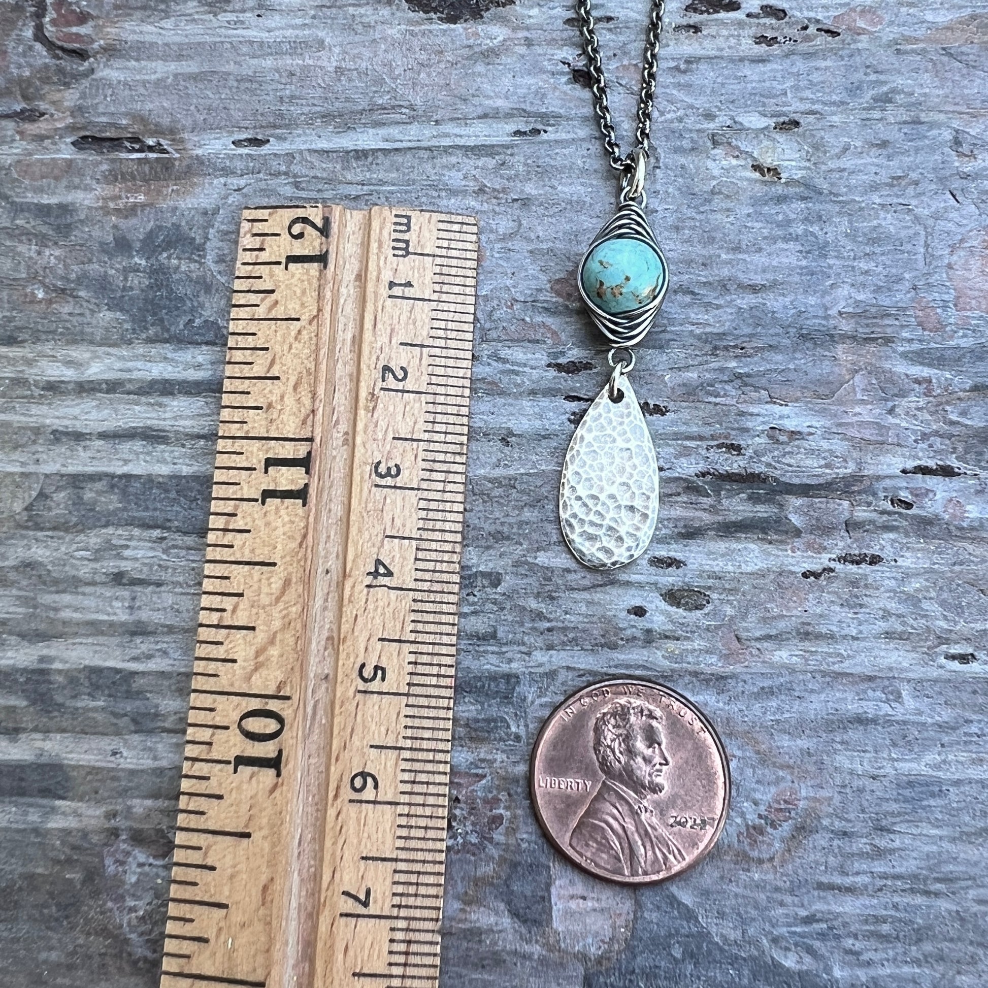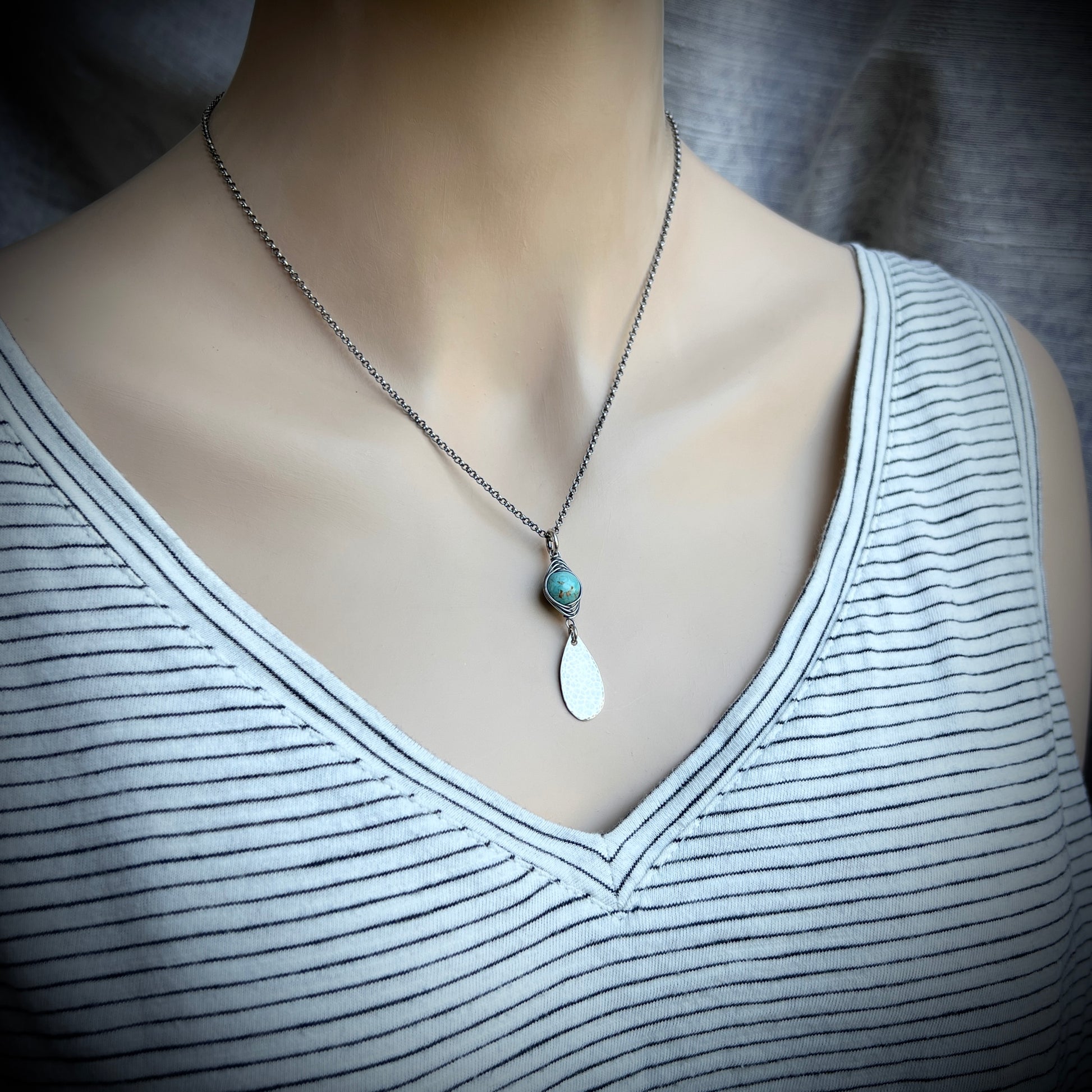 Genuine Turquoise Sterling Silver Necklace | Wire-wrapped Natural Stone and Hammered Teardrop Pendant
