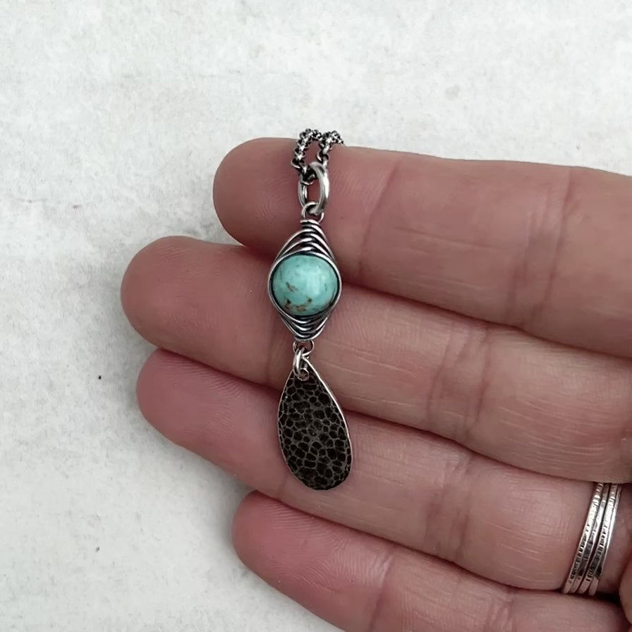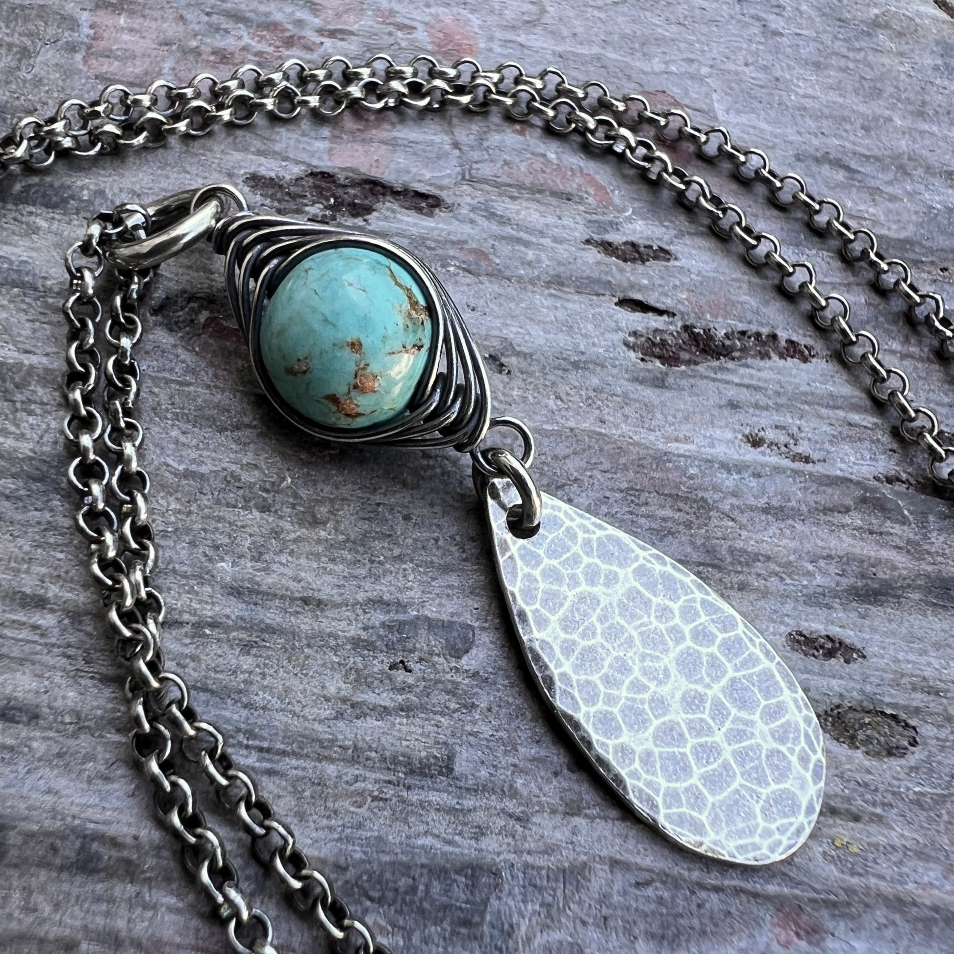 This pendant necklace is handmade from genuine turquoise and sterling silver. The round natural stone is framed in sterling silver wire which I have carefully wrapped around the stone to create the woven design. Below the turquoise stone dangles a hammered sterling silver teardrop which I have cut and hammered by hand. The pendant hangs from a sterling silver chain.