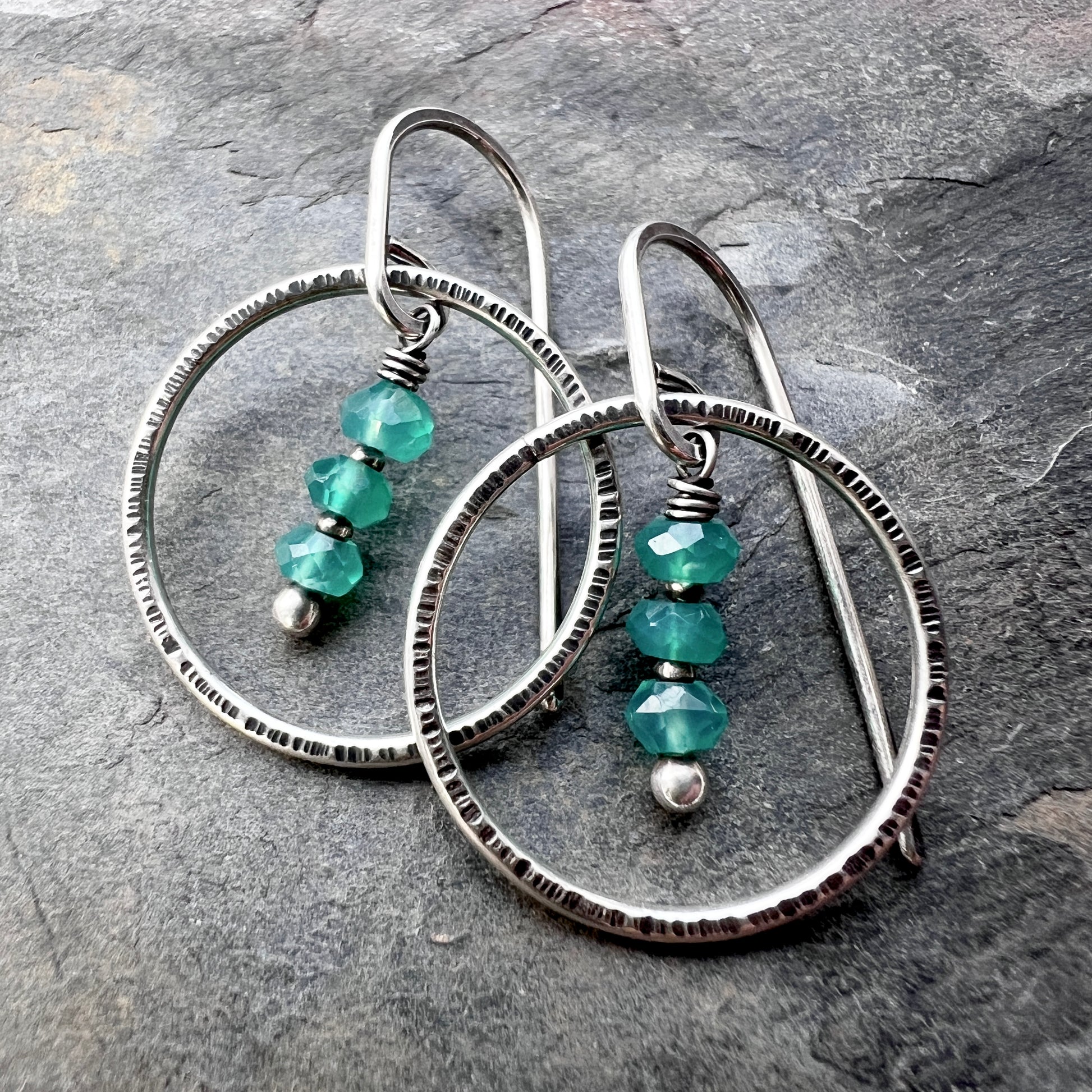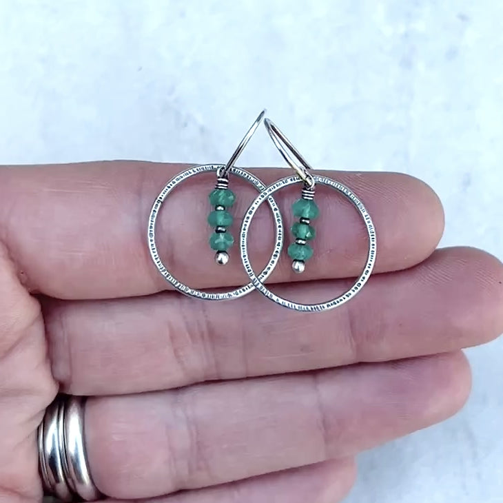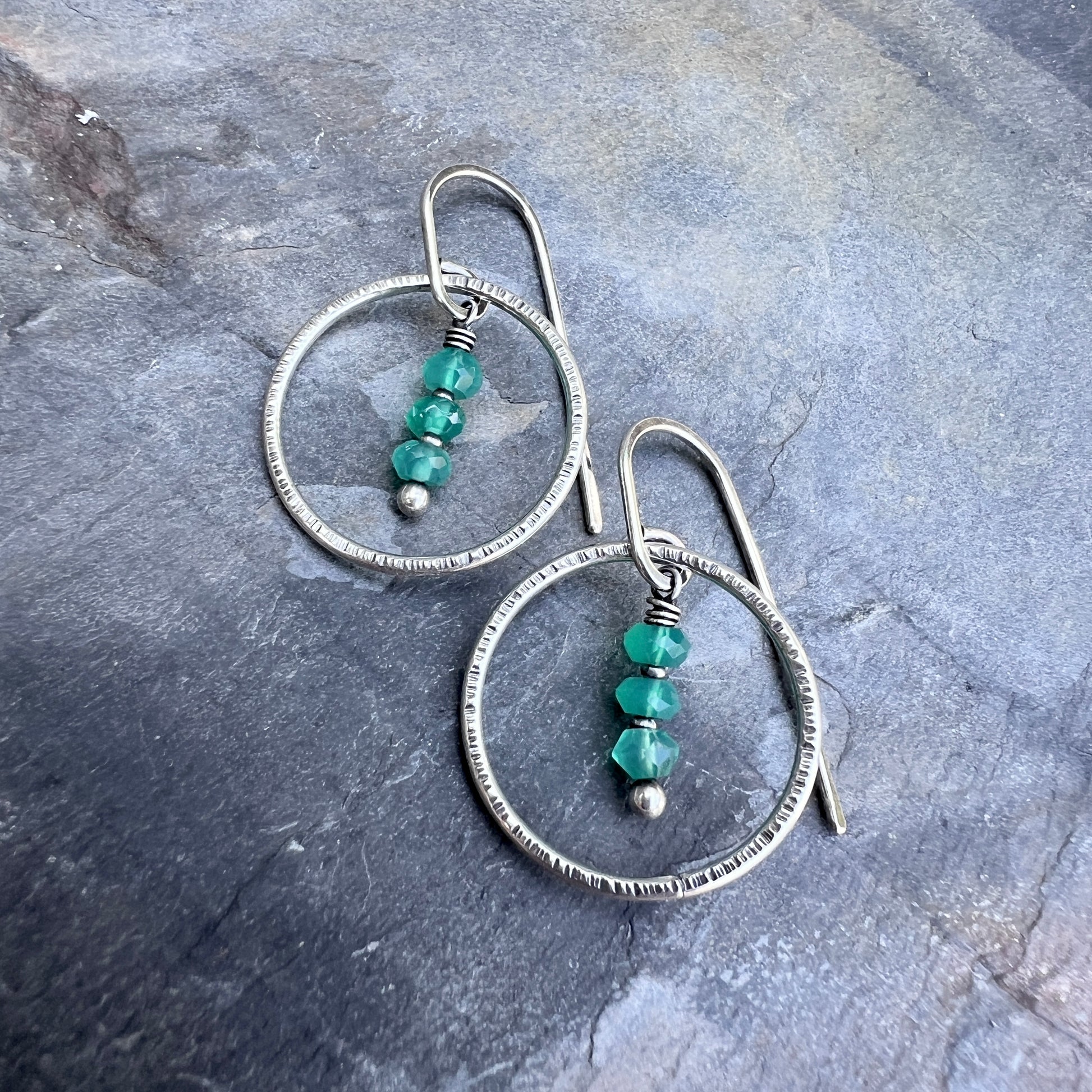 These dangle hoop earrings are handmade from sterling silver and green onyx. Six small emerald green gems are wrapped in sterling silver. The natural stones are framed by circular rings which I have formed, soldered, and hammered by hand. The hoops dangle from handmade sterling silver earwires. The silver has been oxidized and polished to create a patina finish.