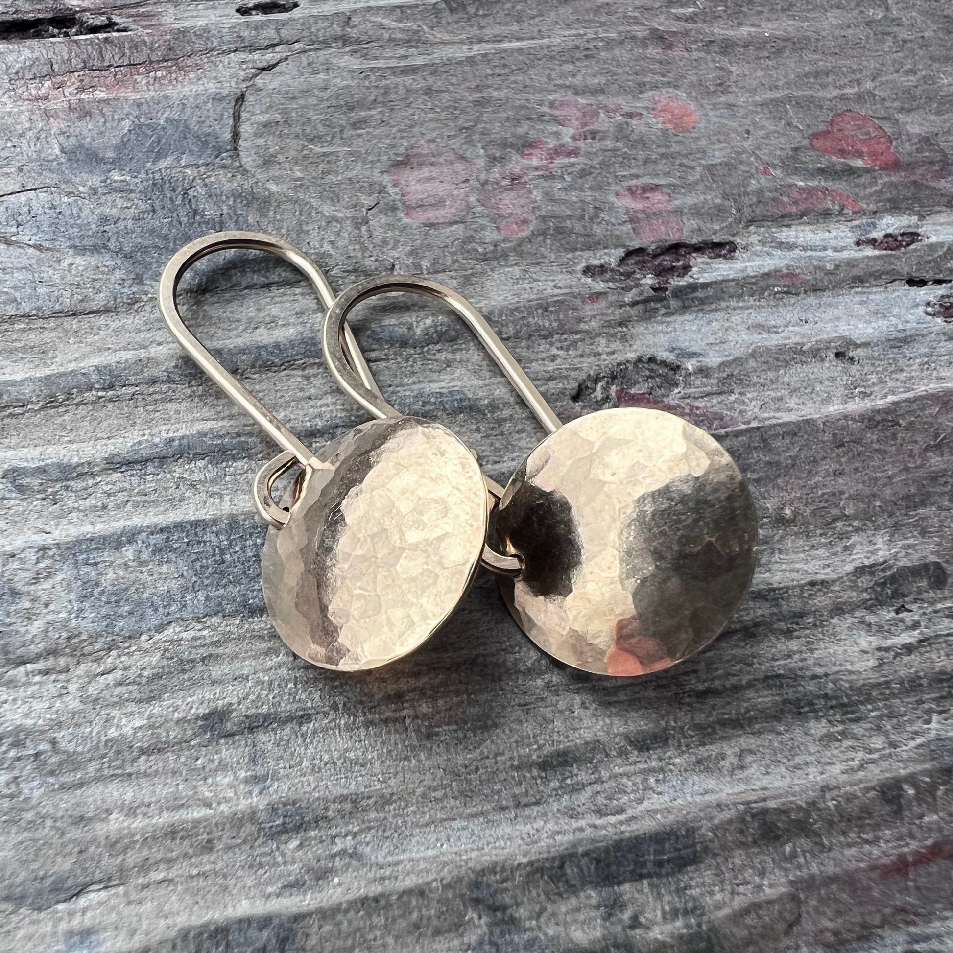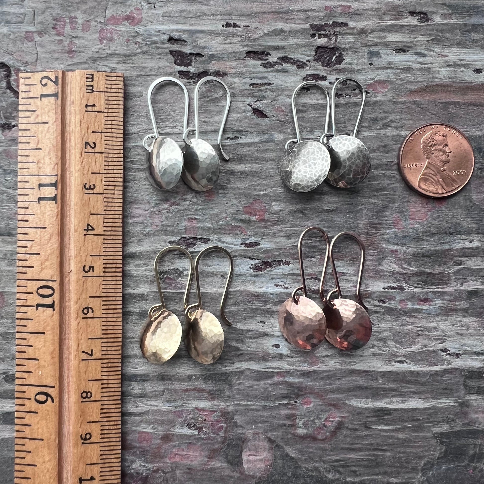 These dangle earrings are made entirely by hand and are available in sterling silver, 14k yellow goldfill, or 14k rose goldfill. I create this style by carefully cutting two circular discs from a sheet of silver or goldfill. I then dome and hammer the metal to create the texture. These minimalist drops dangle from handmade earwires made from sterling silver or 14k goldfill.