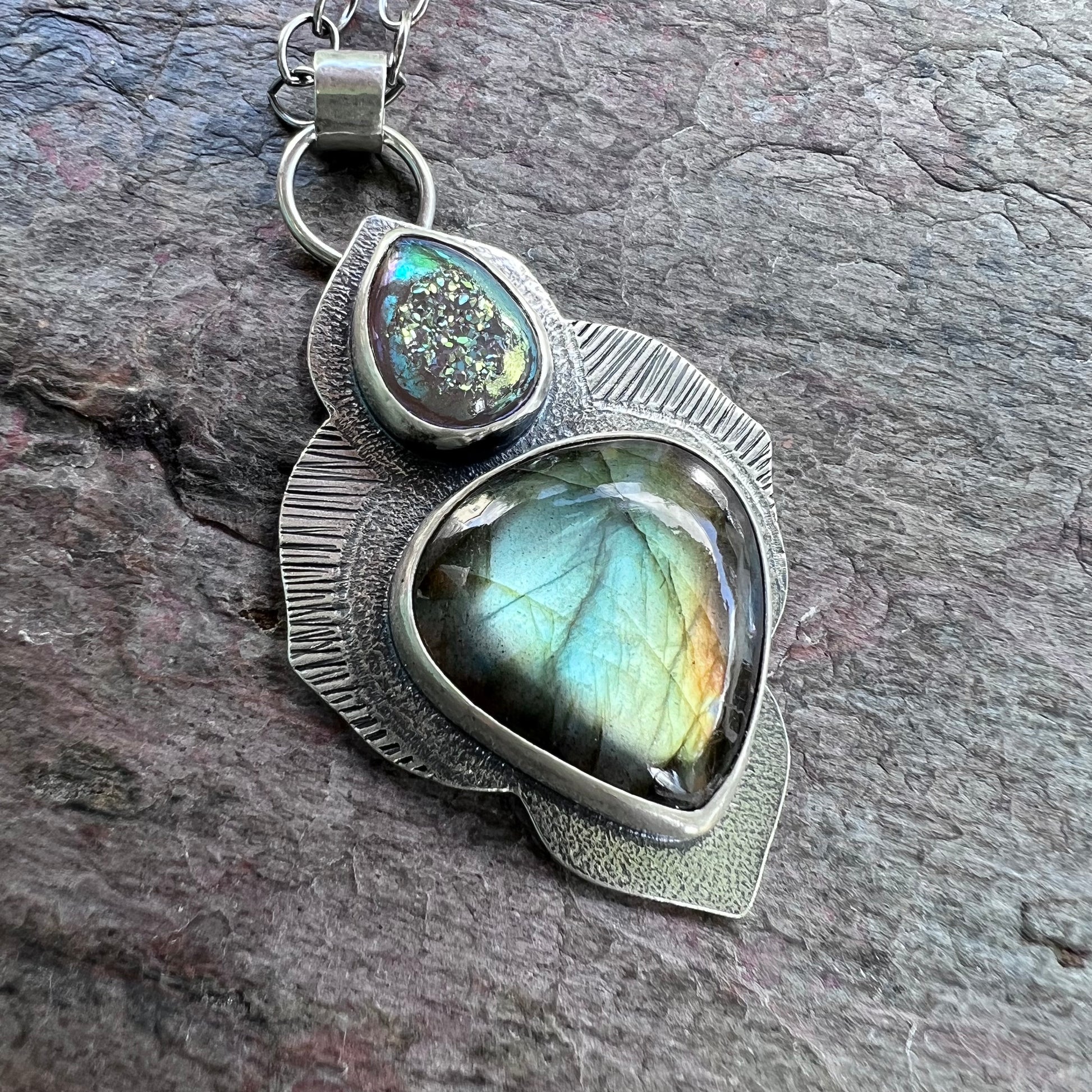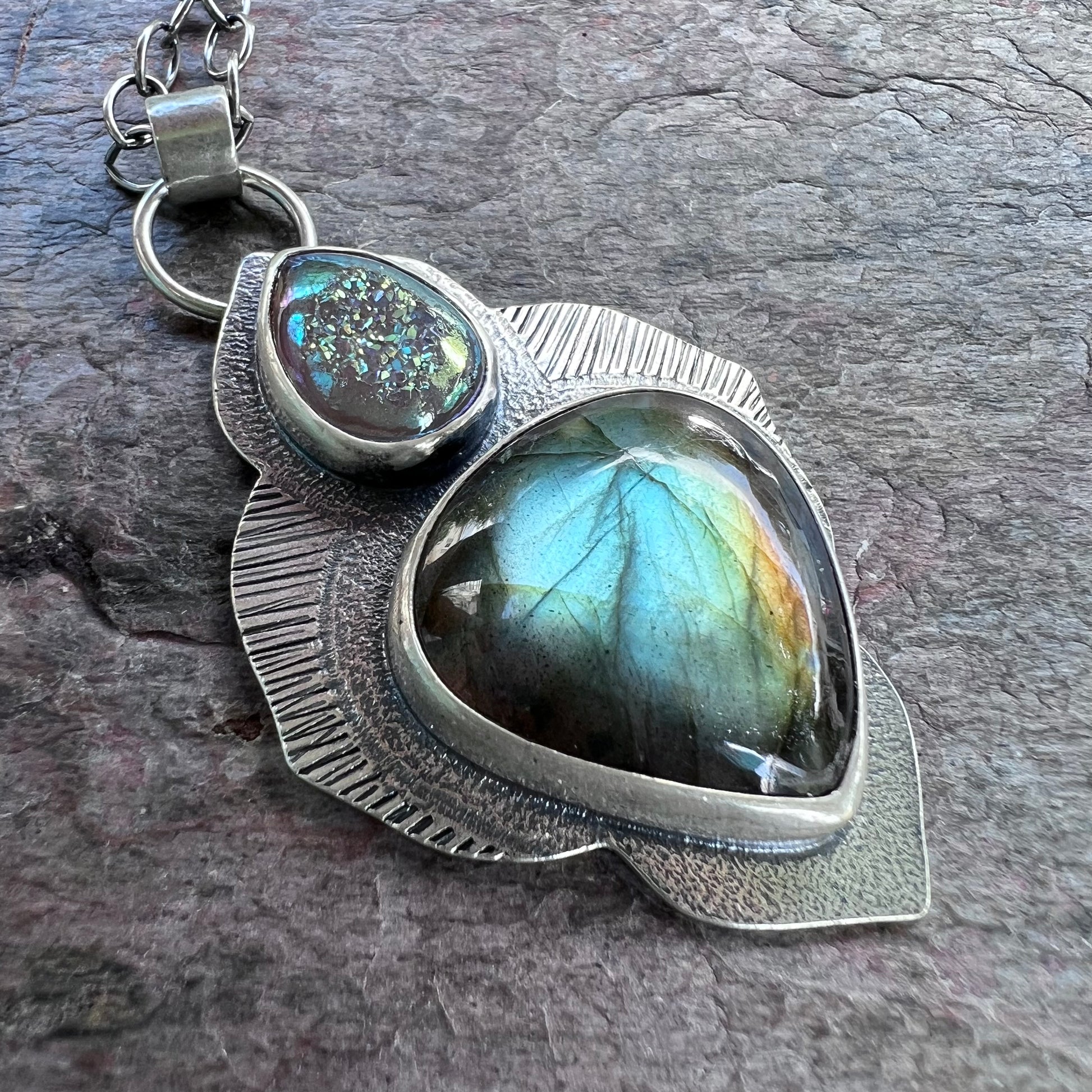 Sterling Silver Labradorite Necklace - Handmade Artisan One of a Kind Druzy and Labradorite Pendant