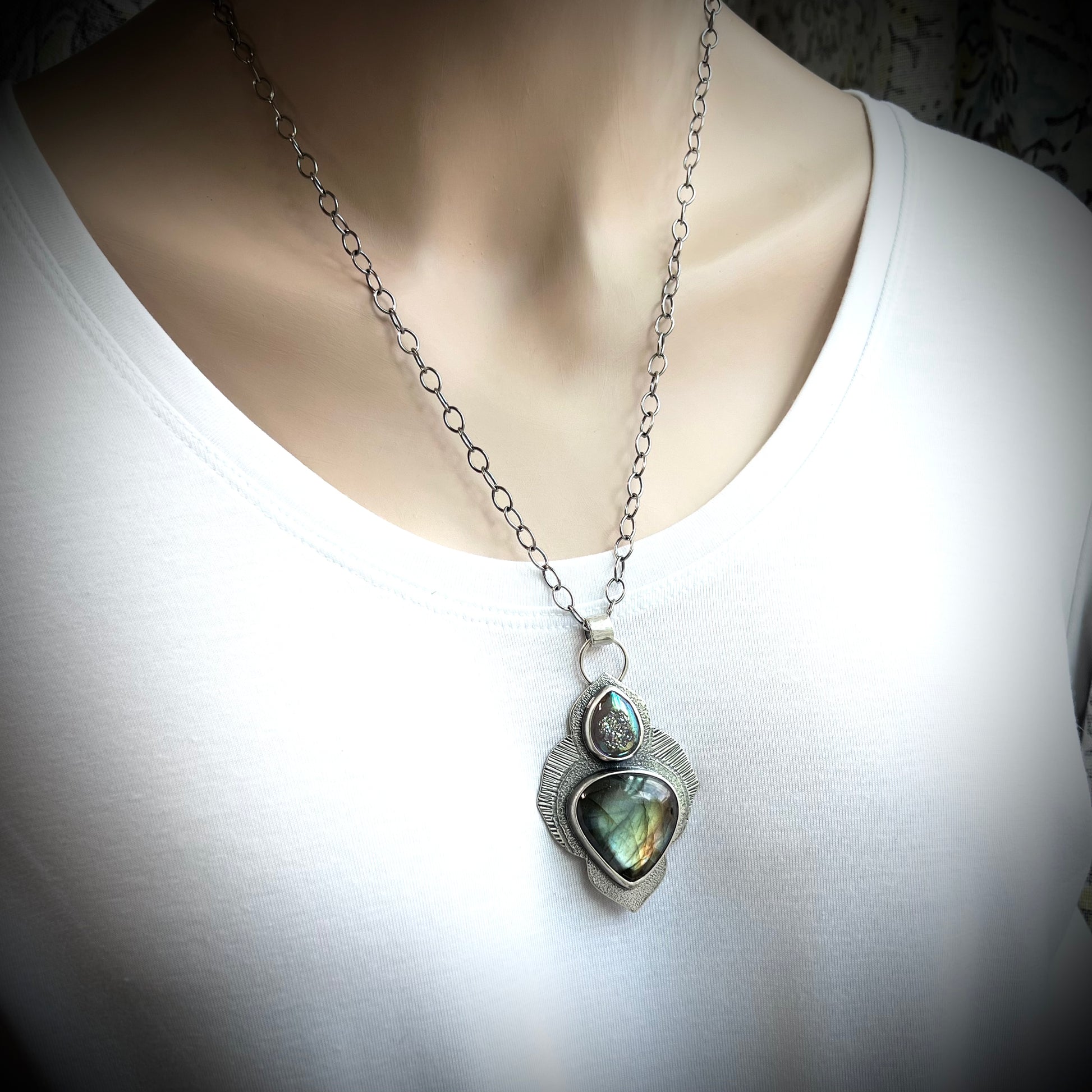 Labradorite and agate druzy cabochons have been set in sterling and fine silver. I have made this one-of-a-kind necklace by sawing, soldering, texturing, and finishing the design entirely by hand. The pendant hangs from a sterling silver chain featuring a 4-inch extender allowing it to be worn from between 20-24 inches. The silver has been oxidized and polished to create a patina finish.
