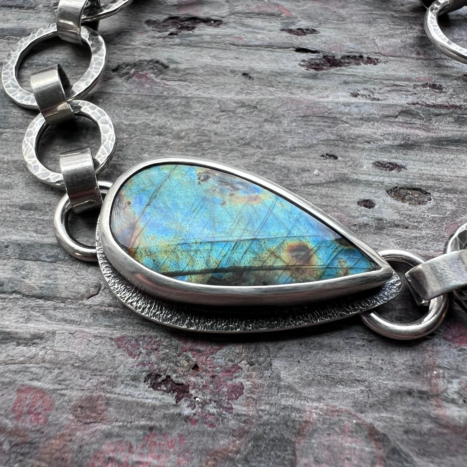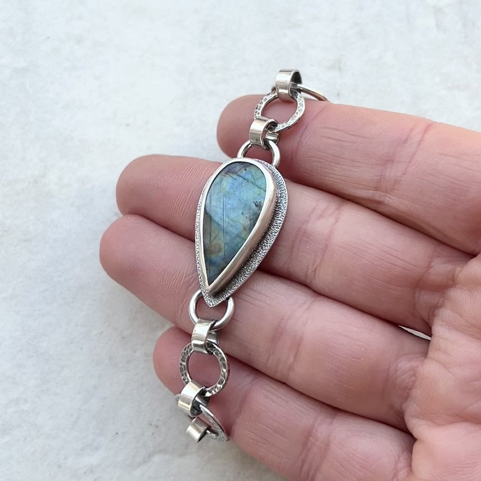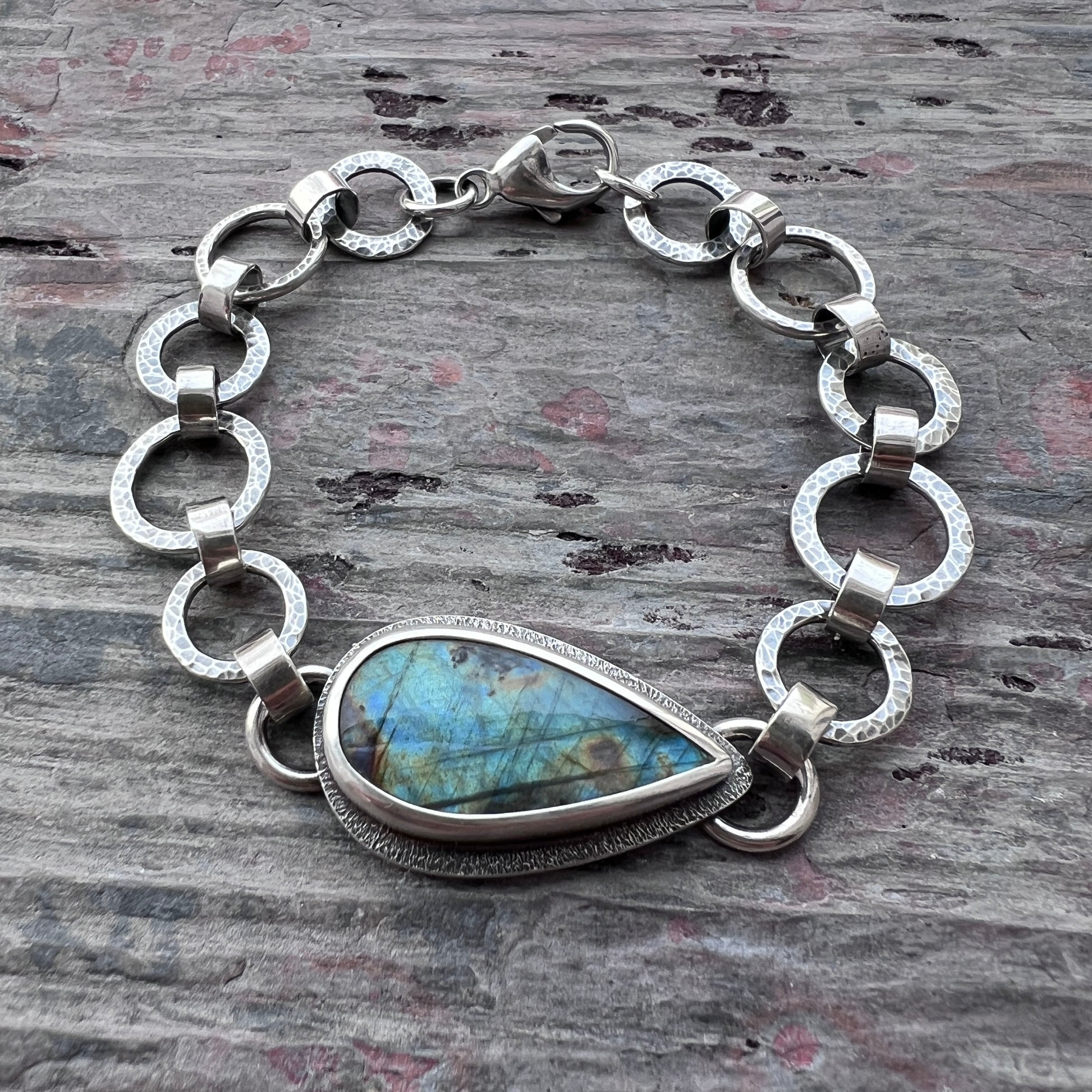 This bracelet is handmade from a labradorite teardrop cabochon and sterling silver. The natural stone has been bezel set and has a textured silver border. It is framed by a set of hammered silver links. I have made this one-of-a-kind bracelet by sawing, soldering, texturing, and finishing the design entirely by hand. The silver has been oxidized and polished to create an antique patina finish. Bracelet features a lobster claw clasp and measures about 7.75 inches in total length from end to end.