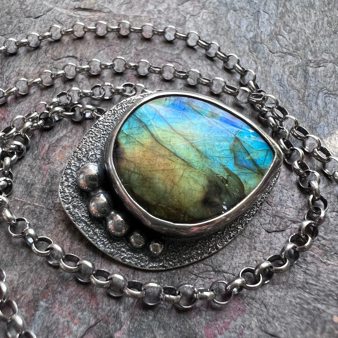 A glowing Labradorite cabochon is set in sterling and fine silver. The stone is accented by a set of shining silver granules contrasting against a textured surface. This one-of-a-kind pendant was created entirely by hand. The pendant features a hidden tube bail and slides along an 18-inch sterling silver chain. The Labradorite stone has a deep brown internal body with flashes of gold, aqua, and blue as light is reflected along its surface.