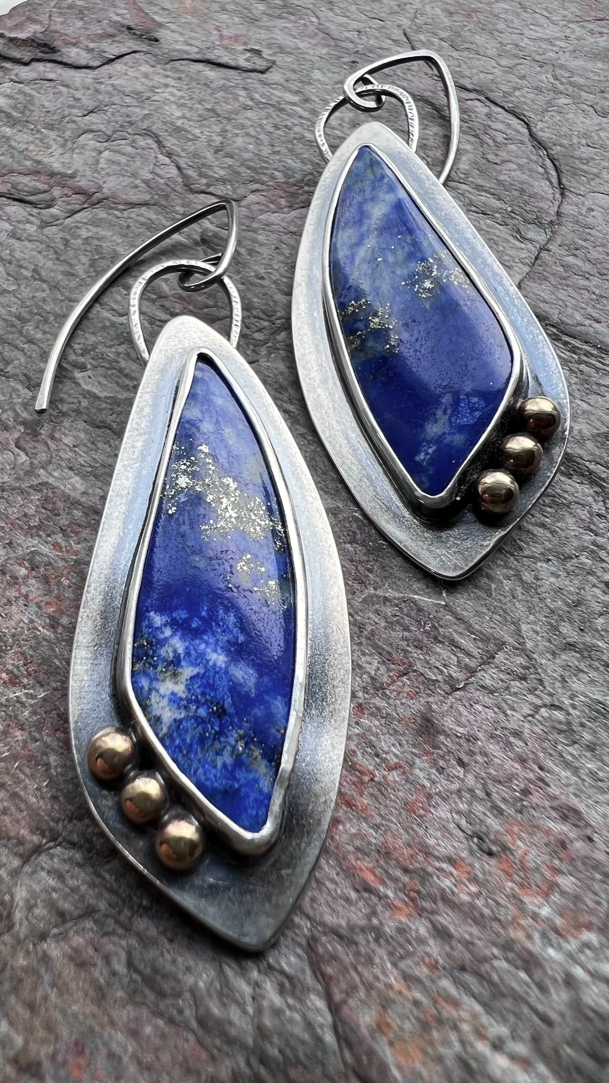 Lapis lazuli cabochons have been set in sterling and fine silver. The unique stones are accented by a set of golden granules made from jeweler's grade brass. I have made these one-of-a-kind earrings by sawing, soldering, texturing, and finishing the design entirely by hand. Earrings dangle from handformed sterling silver earwires. The silver has been oxidized and polished to create a light patina finish.