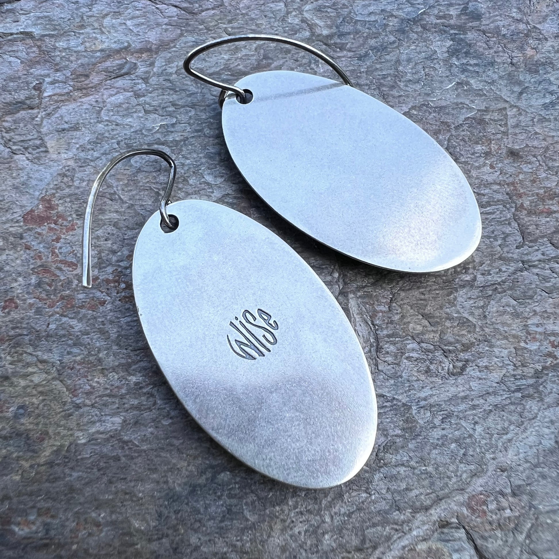 A pair of lapis lazuli cabochons have been set in sterling and fine silver. I have made these one-of-a-kind earrings by sawing, soldering, texturing, and finishing the design entirely by hand. Earrings dangle from handformed sterling silver earwires. The silver has been oxidized and polished to create a patina finish.