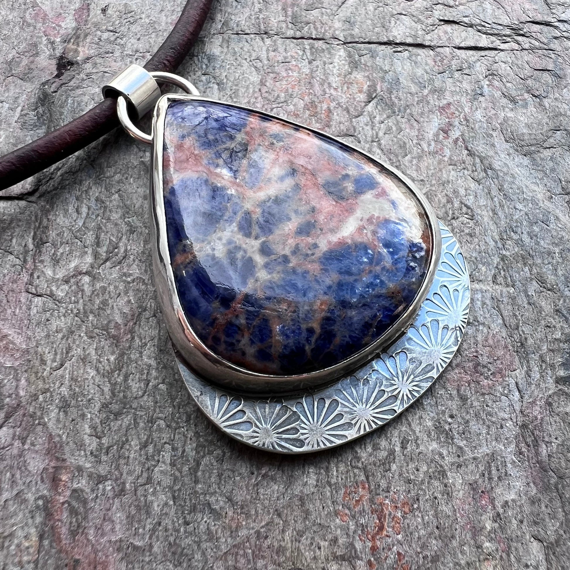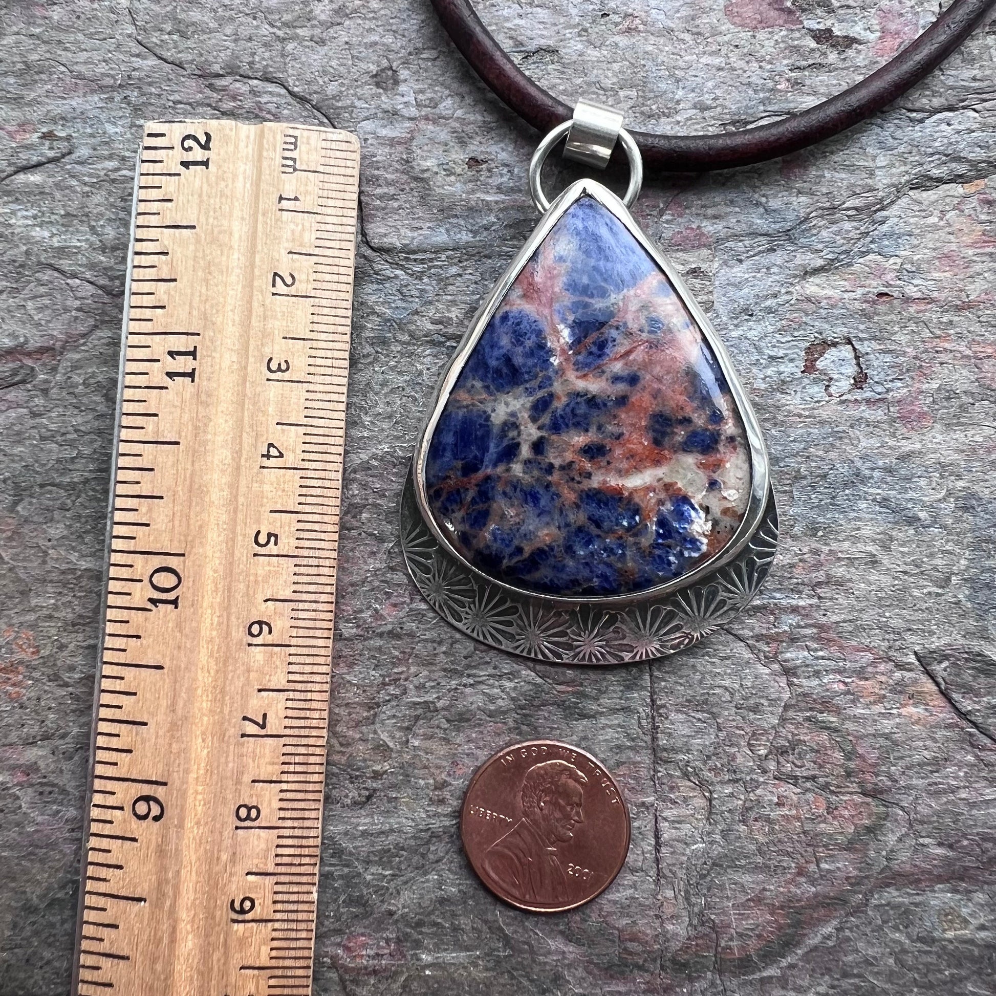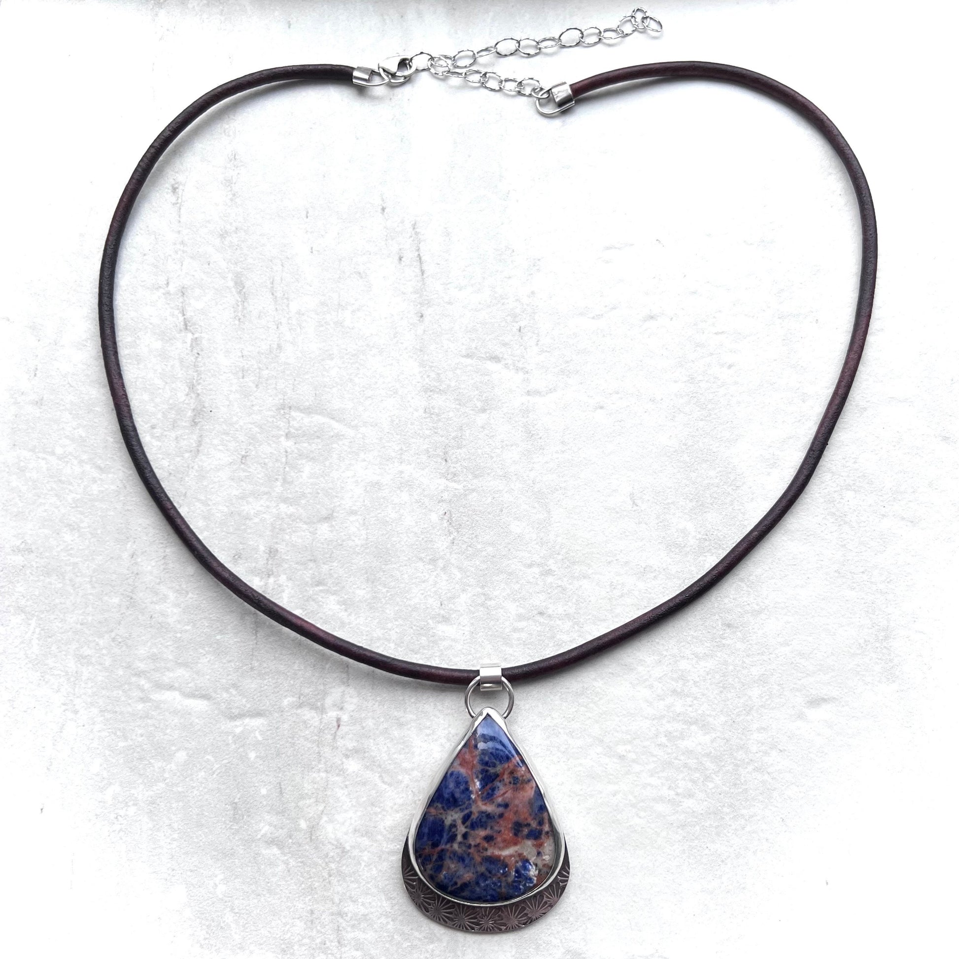 Large Sodalite and Sterling Silver Pendant Necklace - Handmade One-of-a-Kind Teardrop Pendant on Genuine Leather
