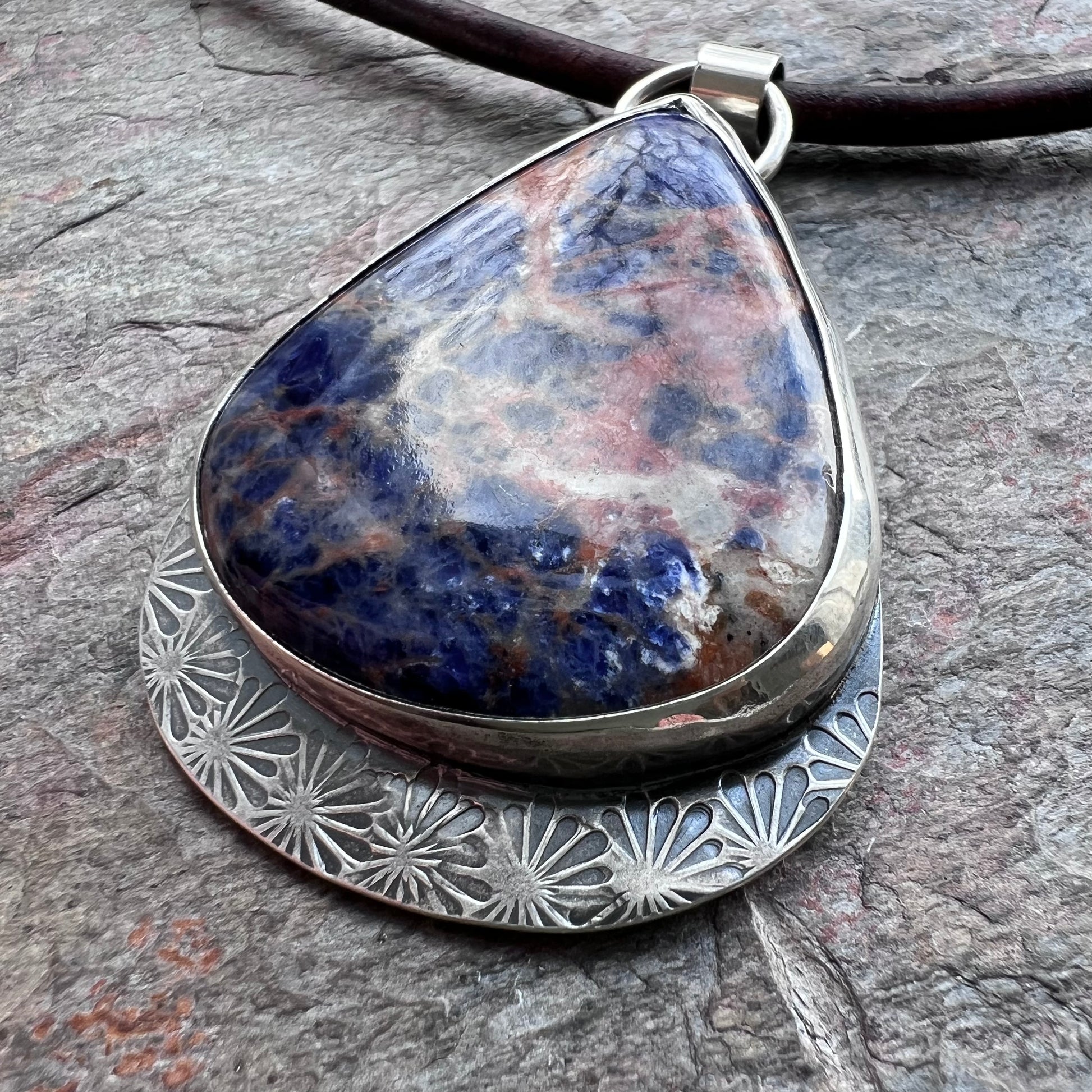I have set a large Sodalite cabochon in sterling and fine silver. The natural stone is accented by a hand stamped sterling silver backplate. The silver has been oxidized and polished to create its antiqued patina finish. This one-of-a-kind pendant hangs from a genuine leather cord. The end of the cord features a sterling silver clasp and a 5-inch extender chain allowing it to be worn from 25-30 inches.