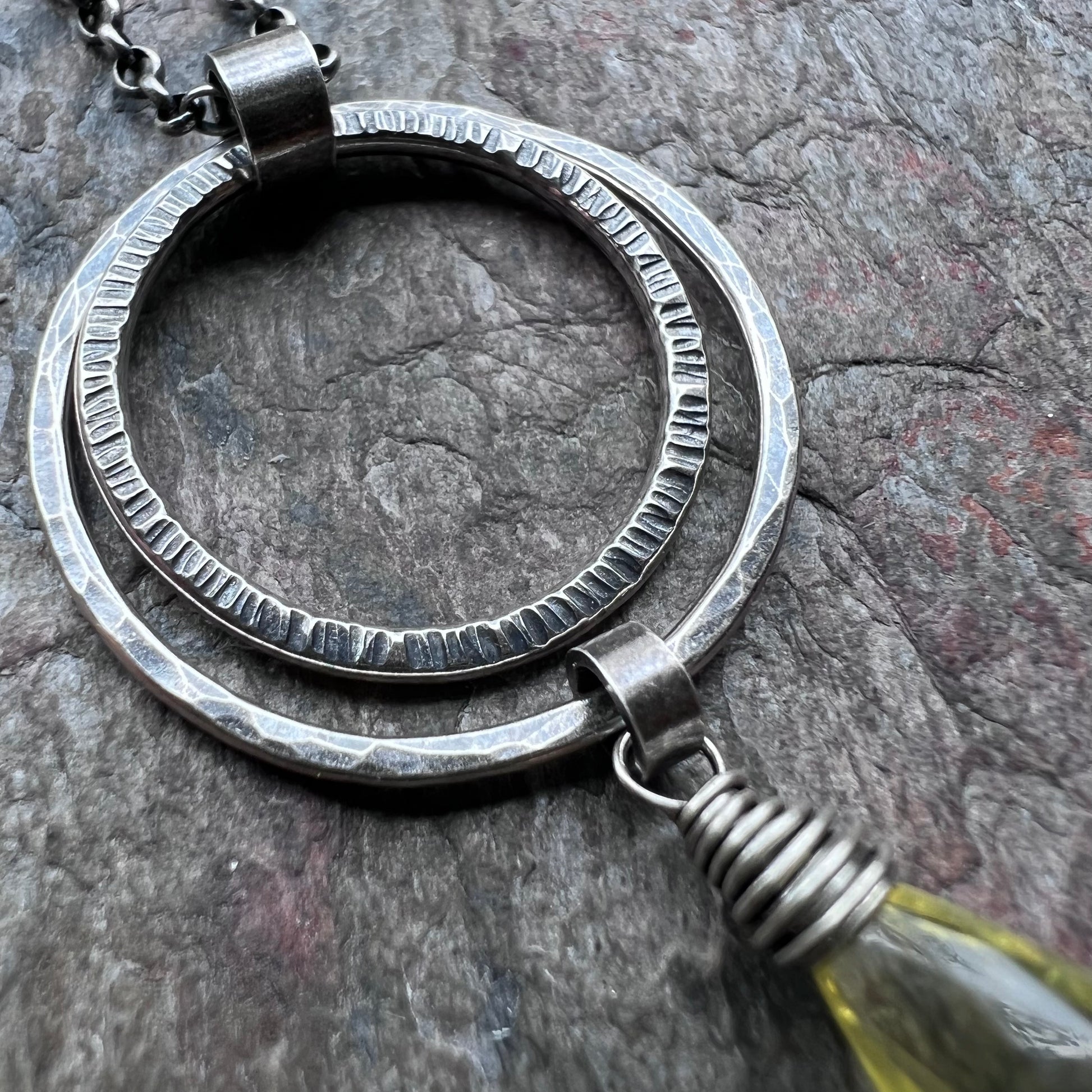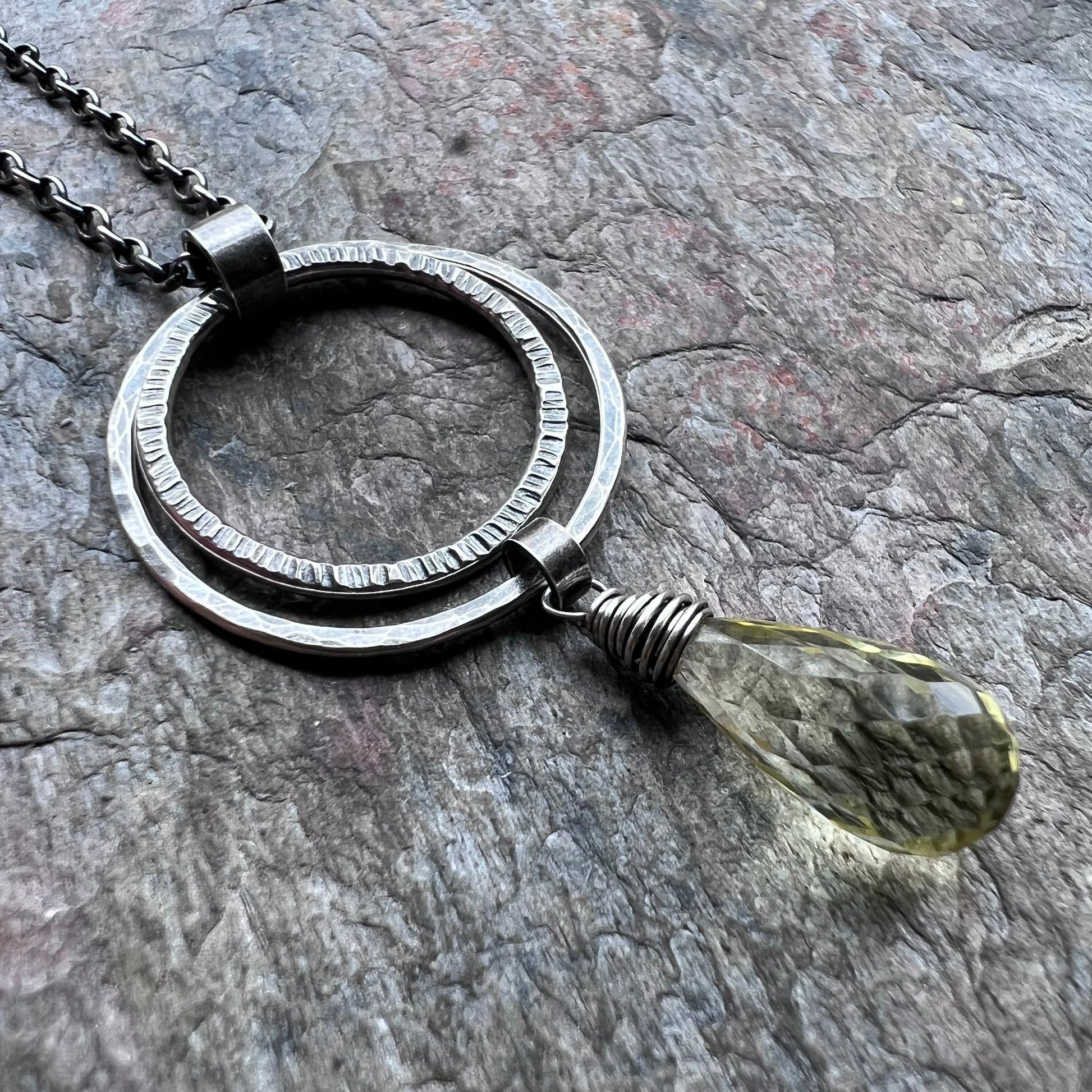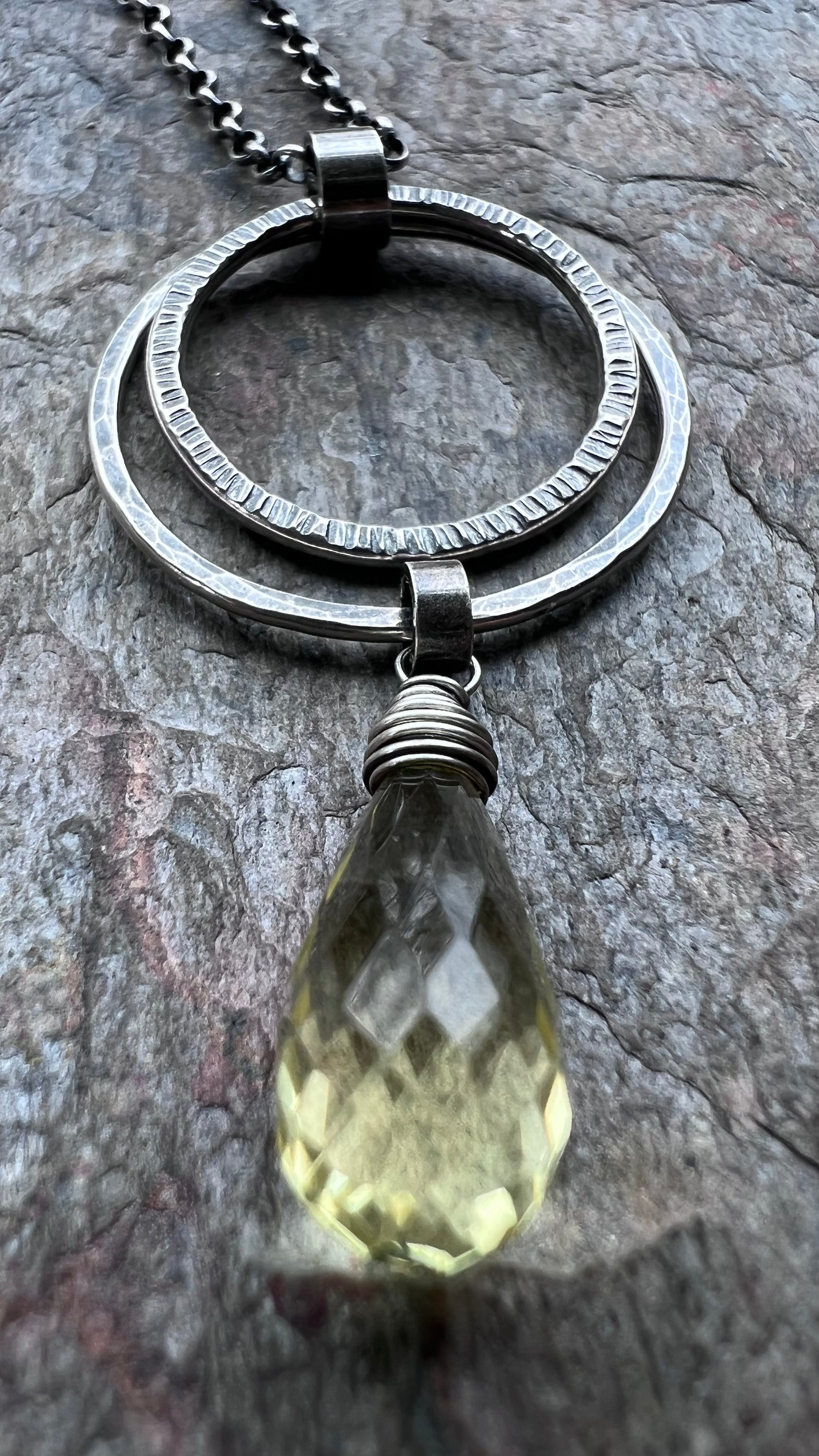 A genuine Lemon Topaz teardrop is wrapped in sterling silver wire. The facted natural stone dangles below two sterling silver circles I have formed, soldered, and hammered by hand. The pendant hangs from a Sterling Silver chain. The silver has been oxidized and polished to create an antique patina finish.