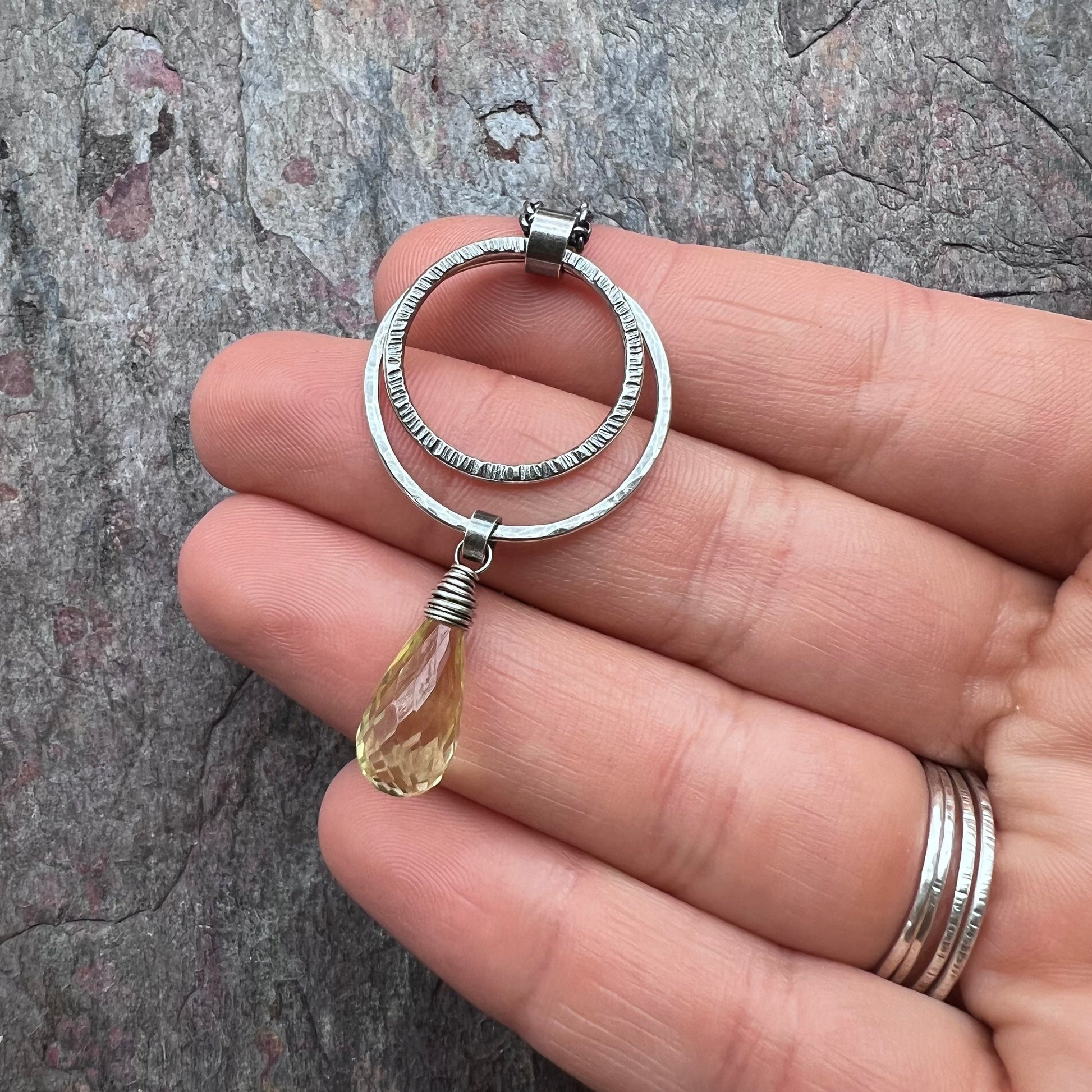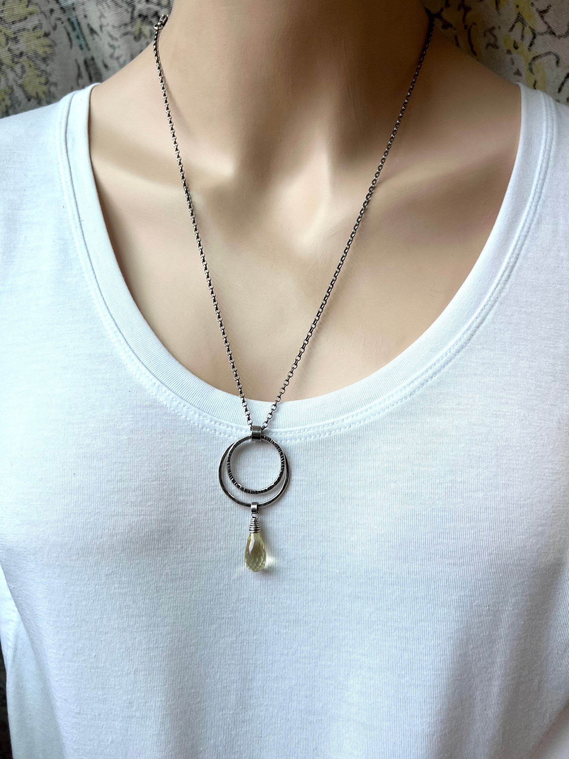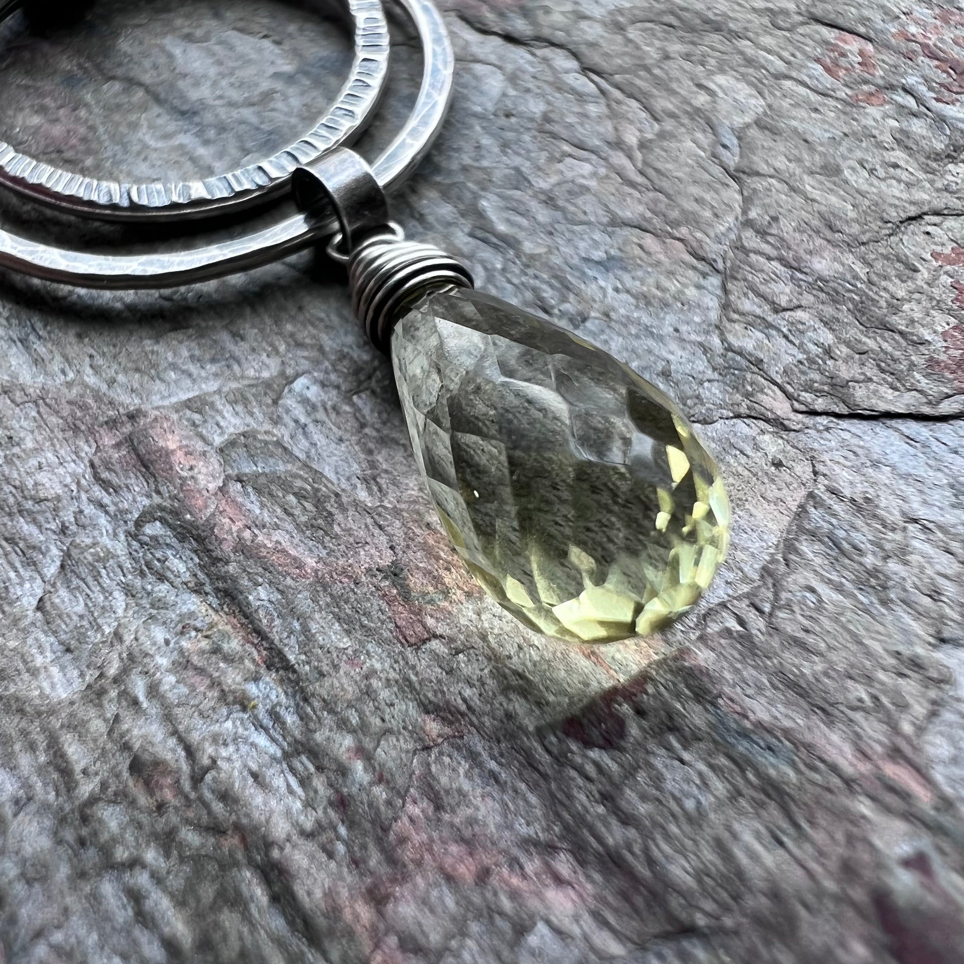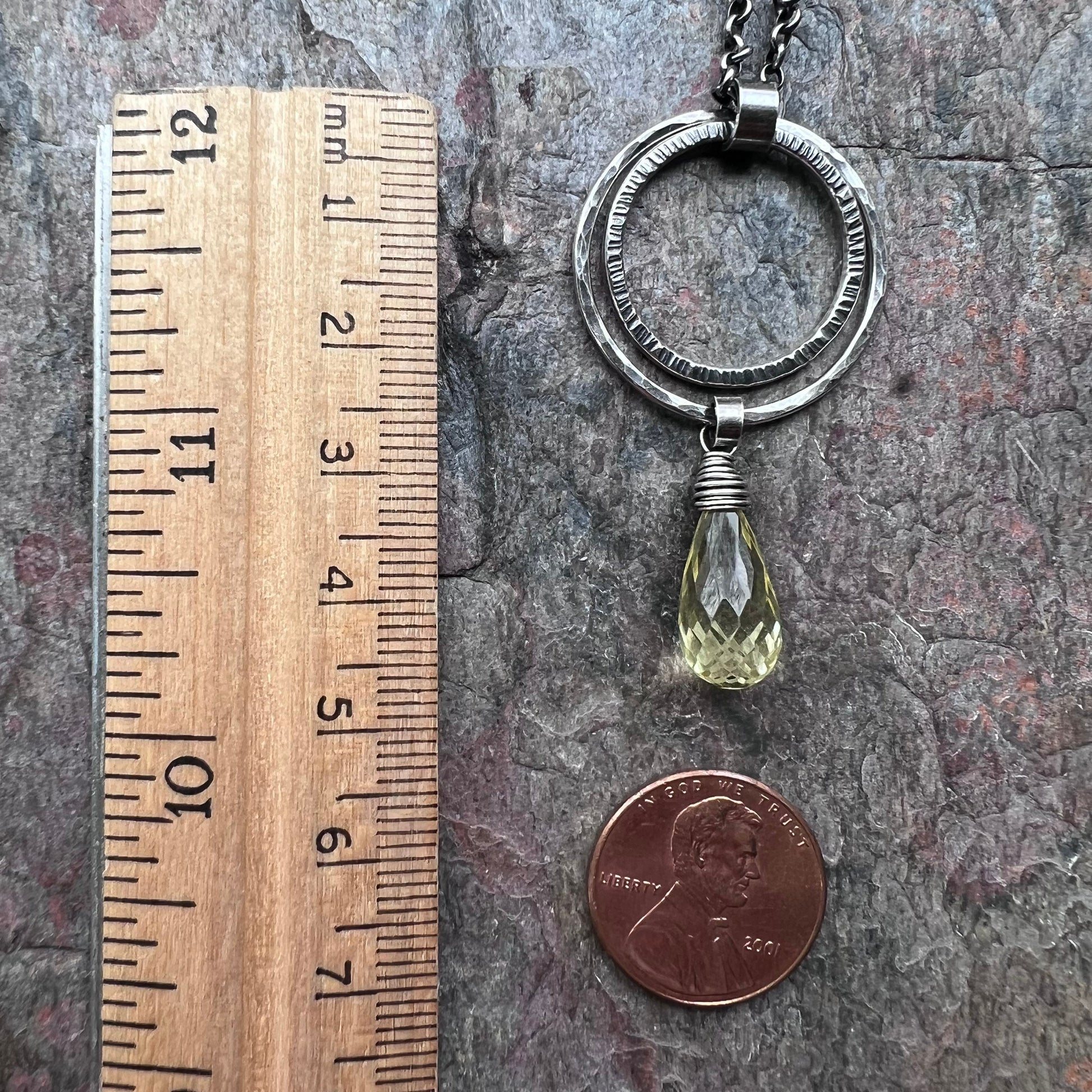 A genuine Lemon Topaz teardrop is wrapped in sterling silver wire. The facted natural stone dangles below two sterling silver circles I have formed, soldered, and hammered by hand. The pendant hangs from a Sterling Silver chain. The silver has been oxidized and polished to create an antique patina finish.