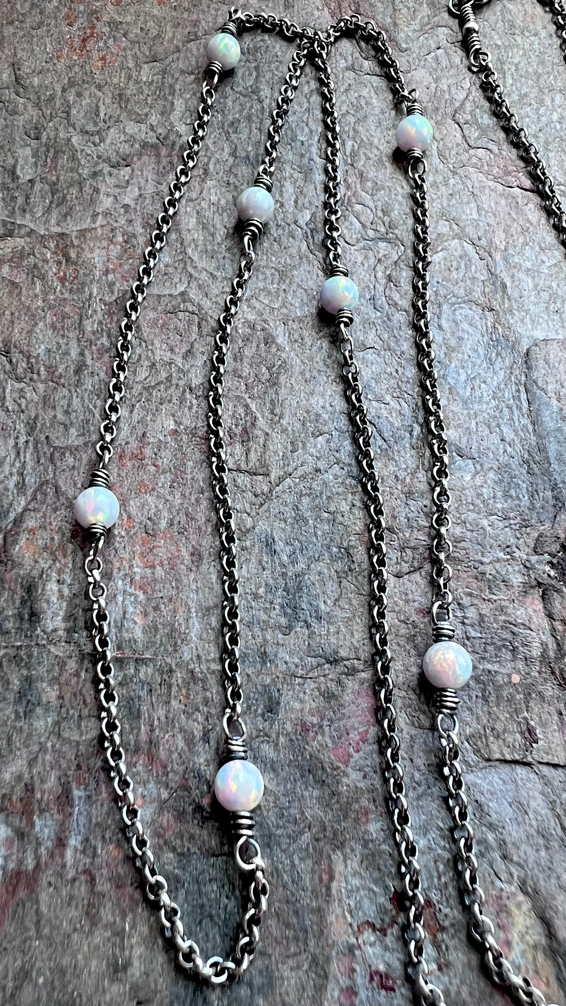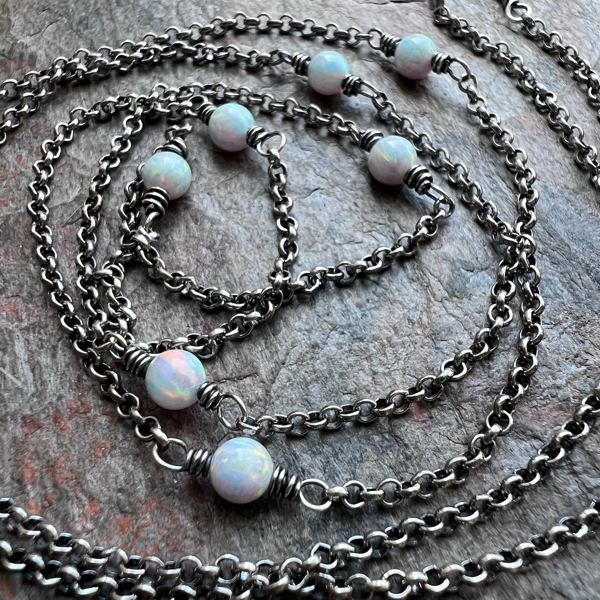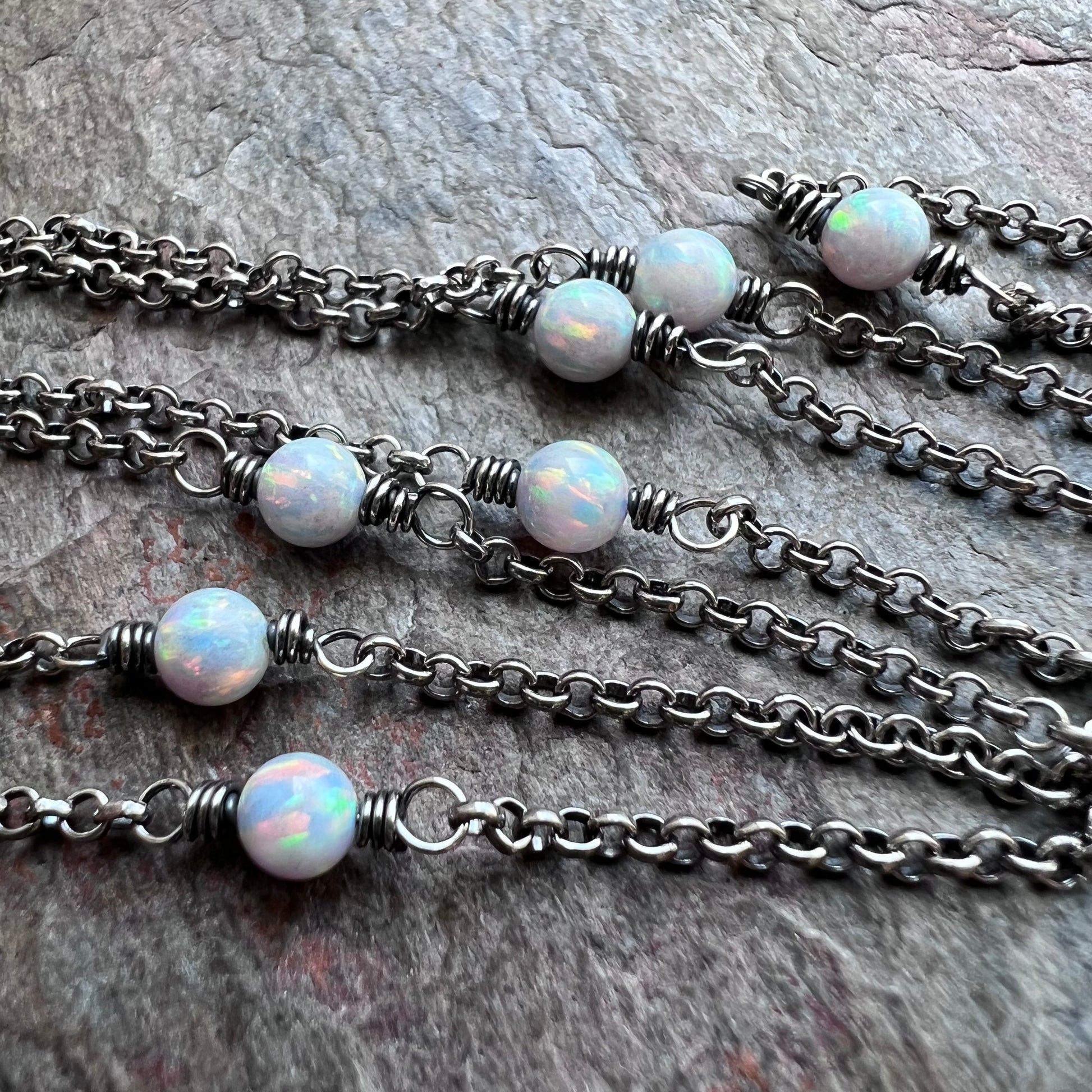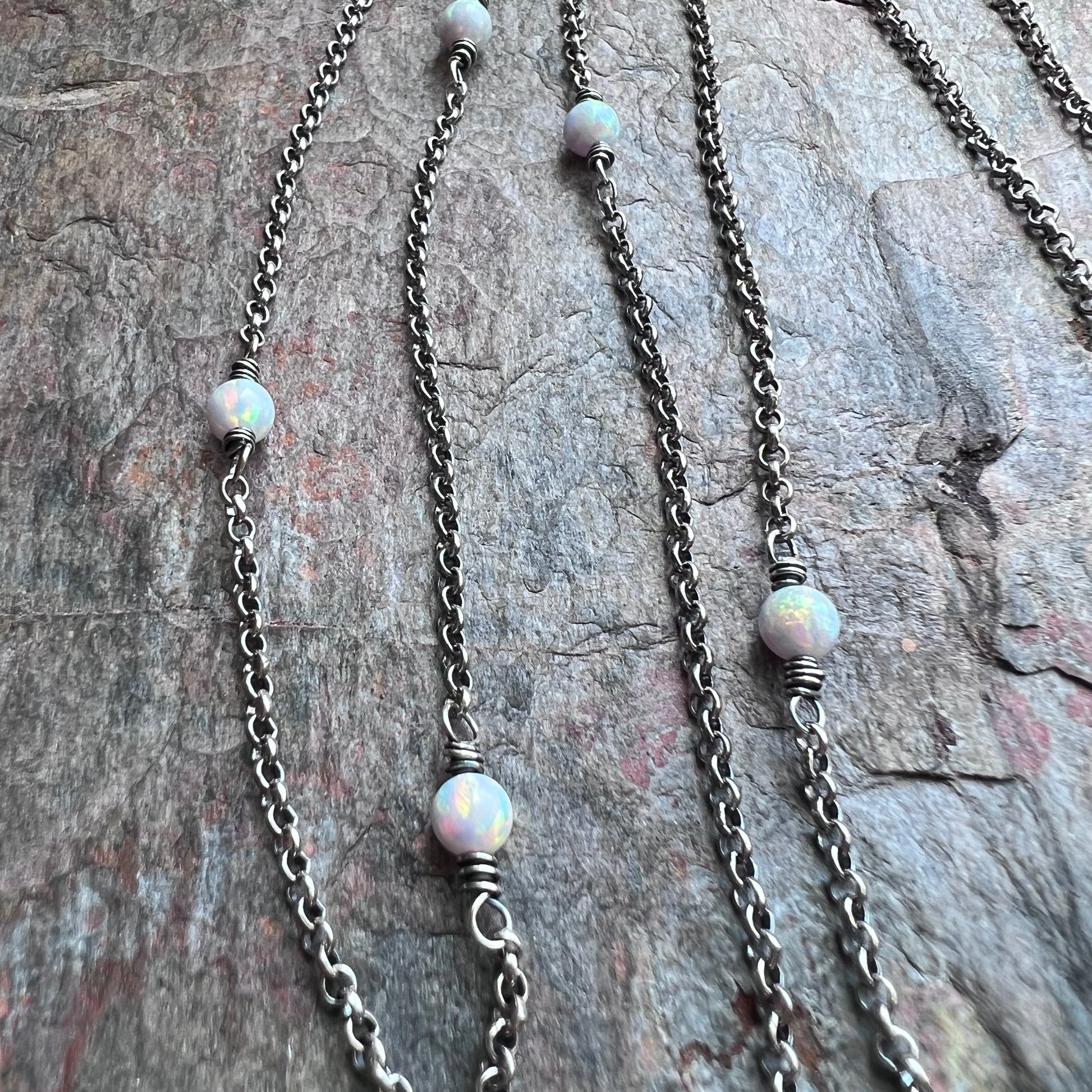 A set of seven simulated Opal round beads are wrapped sterling silver wire. The 4mm glowing beads are suspended along a sterling silver chain. The silver has been oxidized and polished to create an antiqued patina finish.