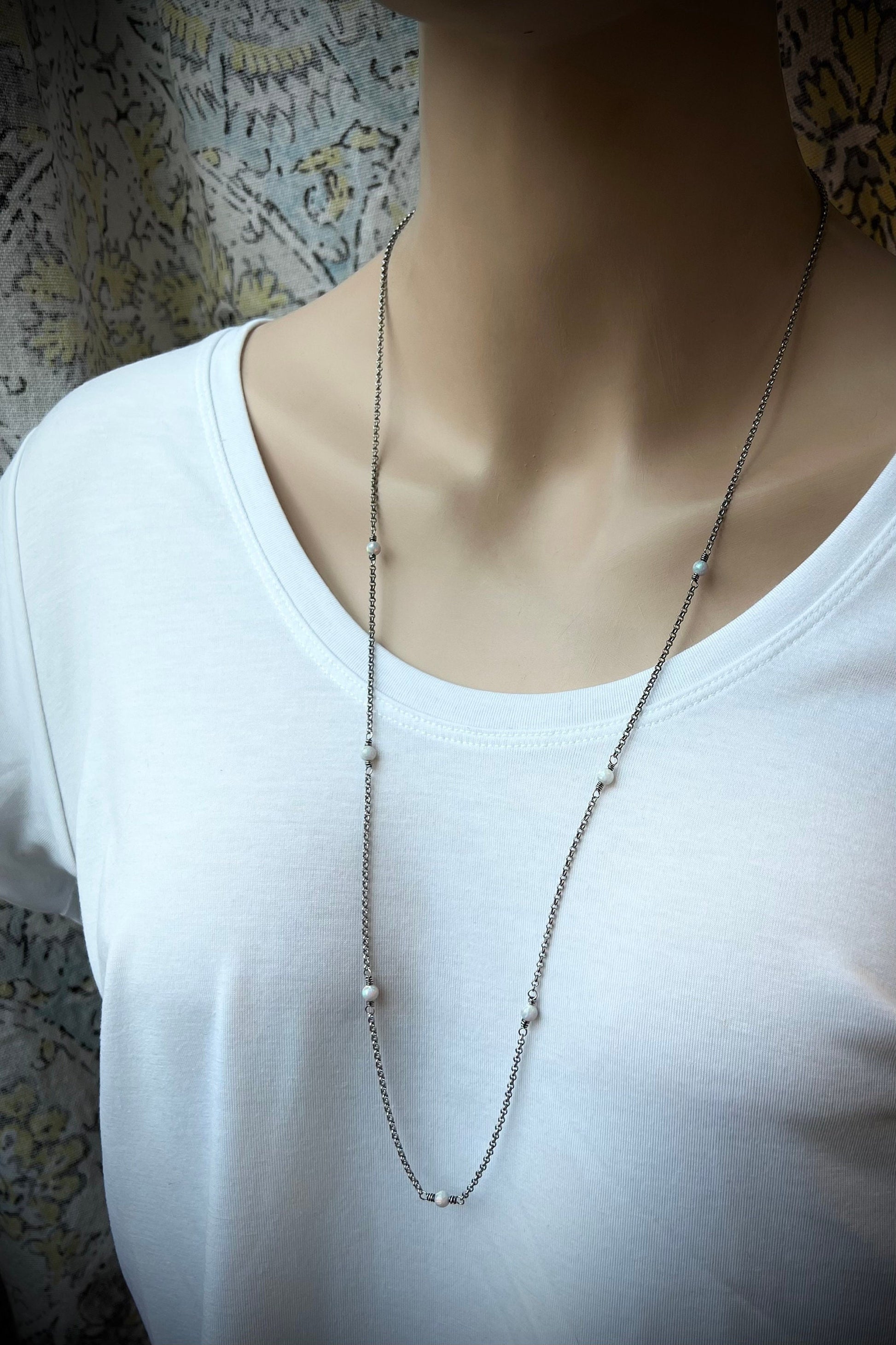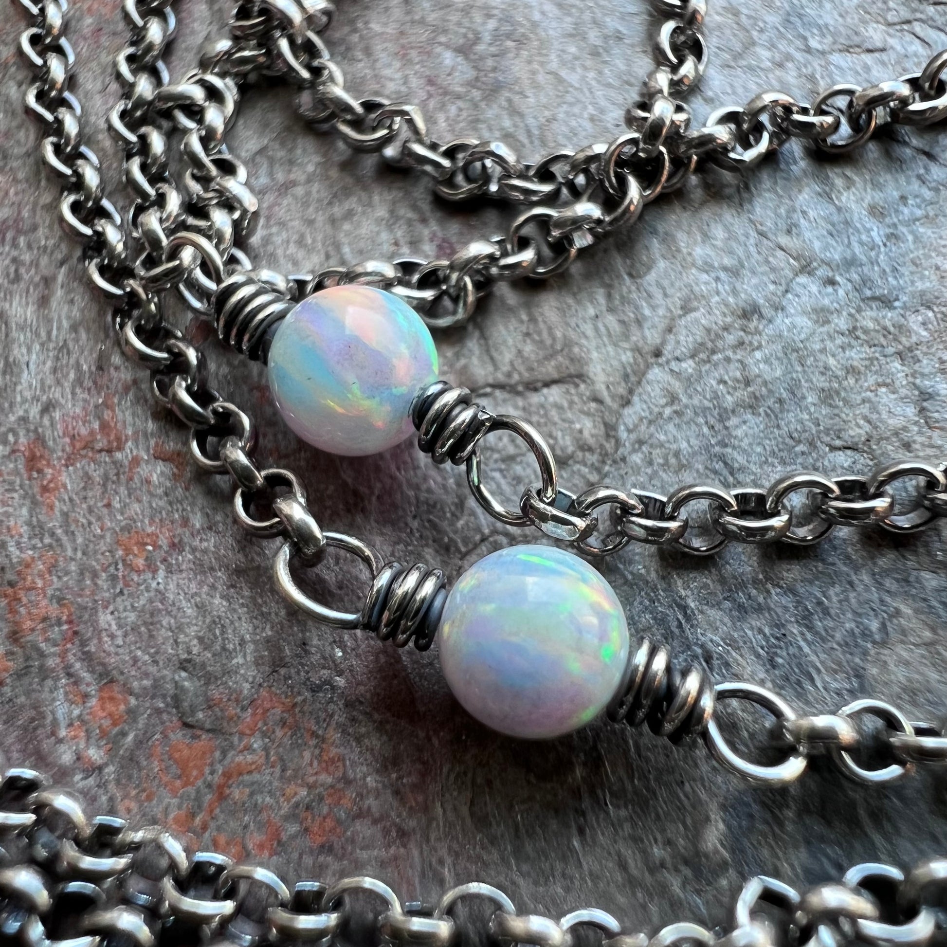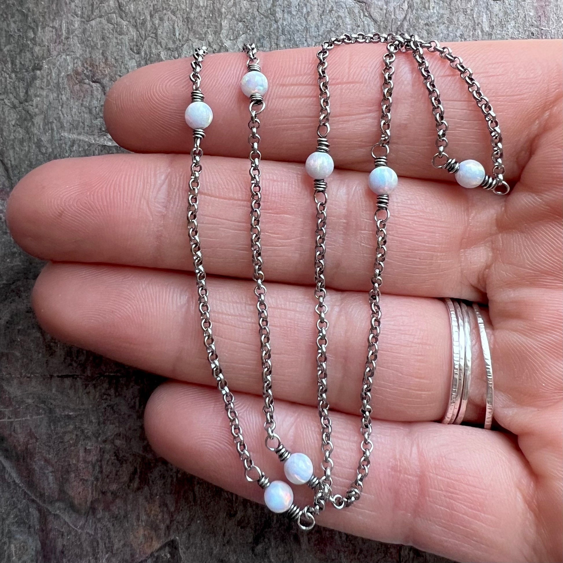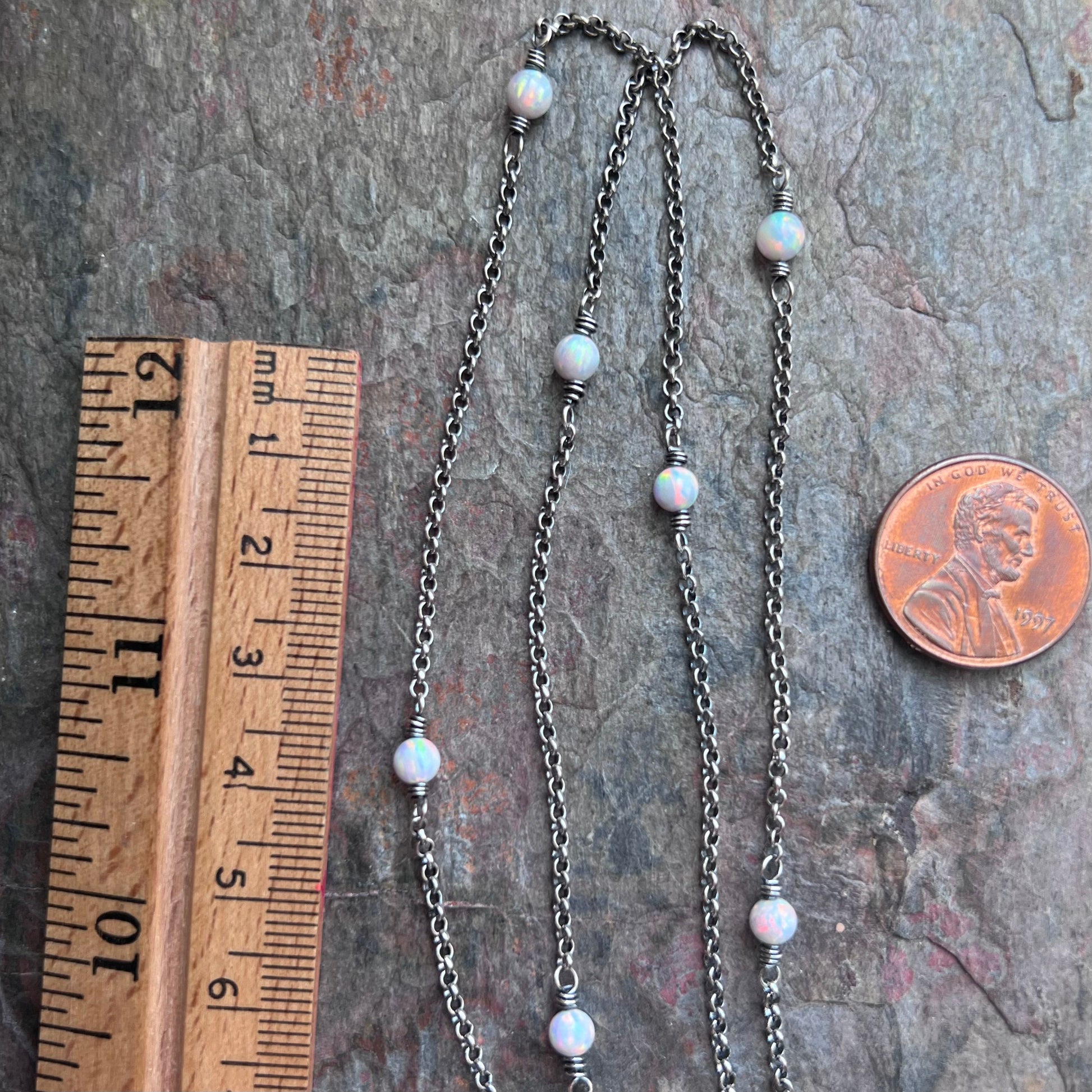 A set of seven simulated Opal round beads are wrapped sterling silver wire. The 4mm glowing beads are suspended along a sterling silver chain. The silver has been oxidized and polished to create an antiqued patina finish.