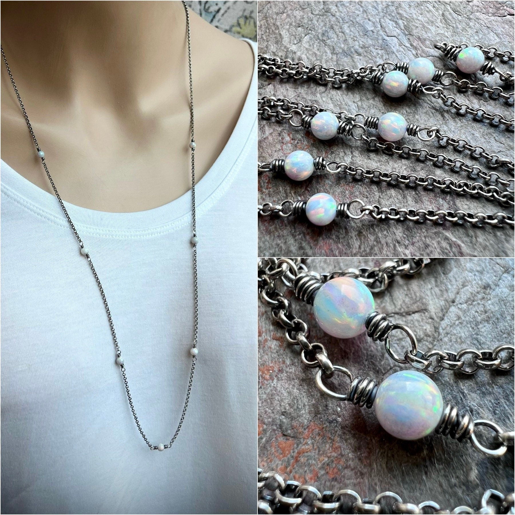 Long Sterling Silver Opal Necklace - Simulated Opal and Sterling Silver Chain Necklace