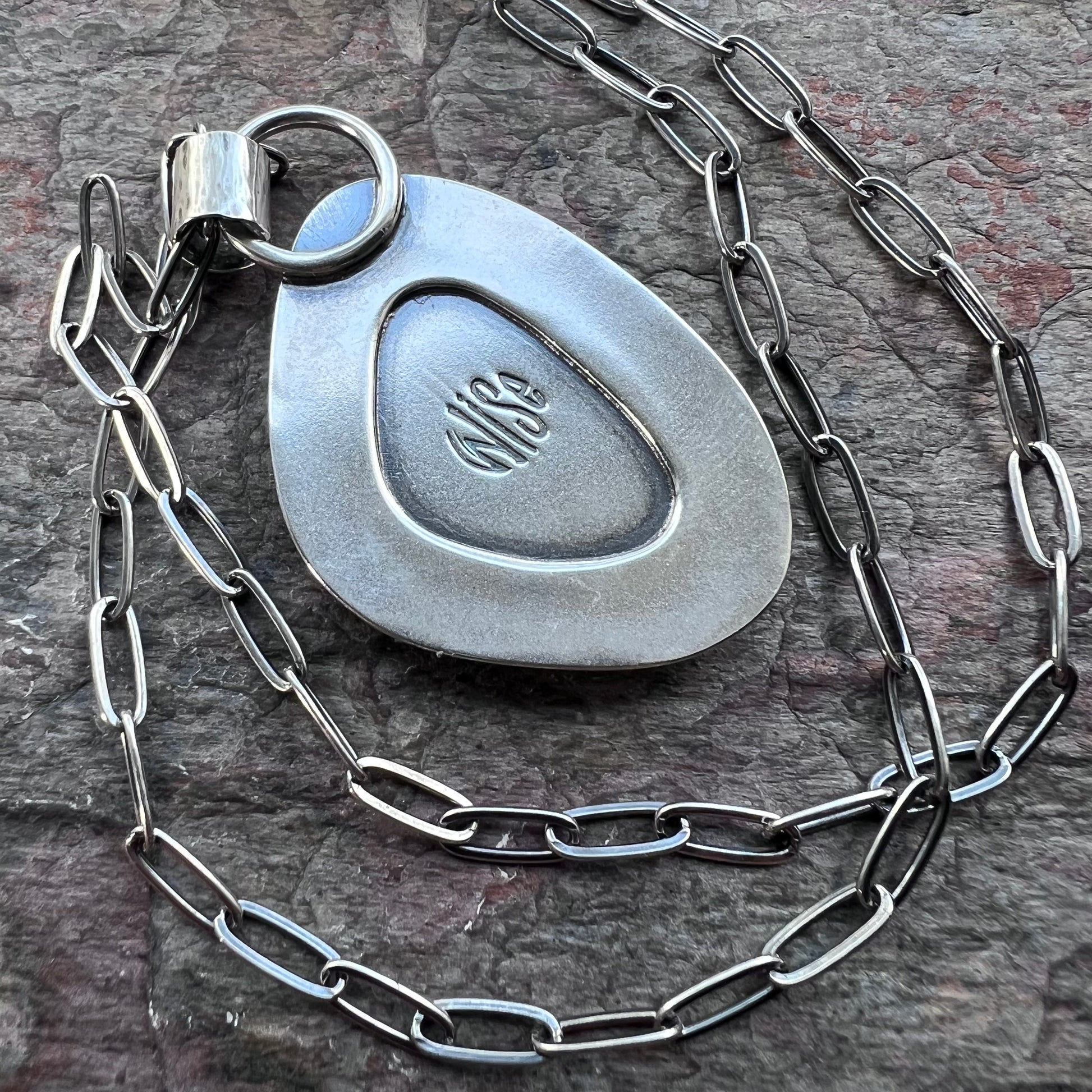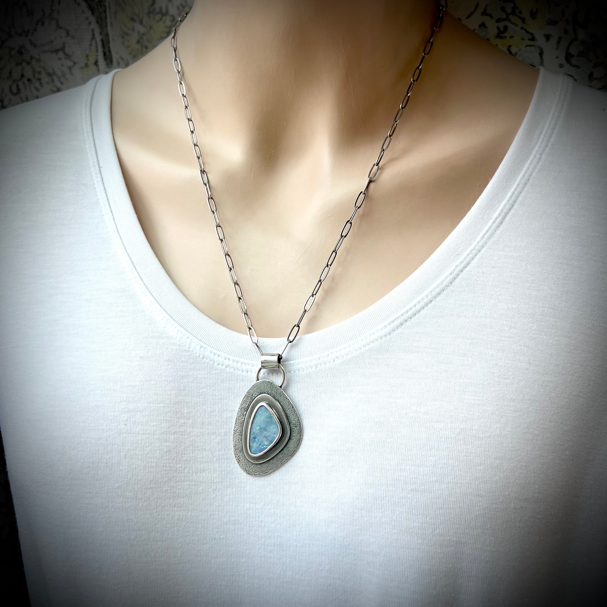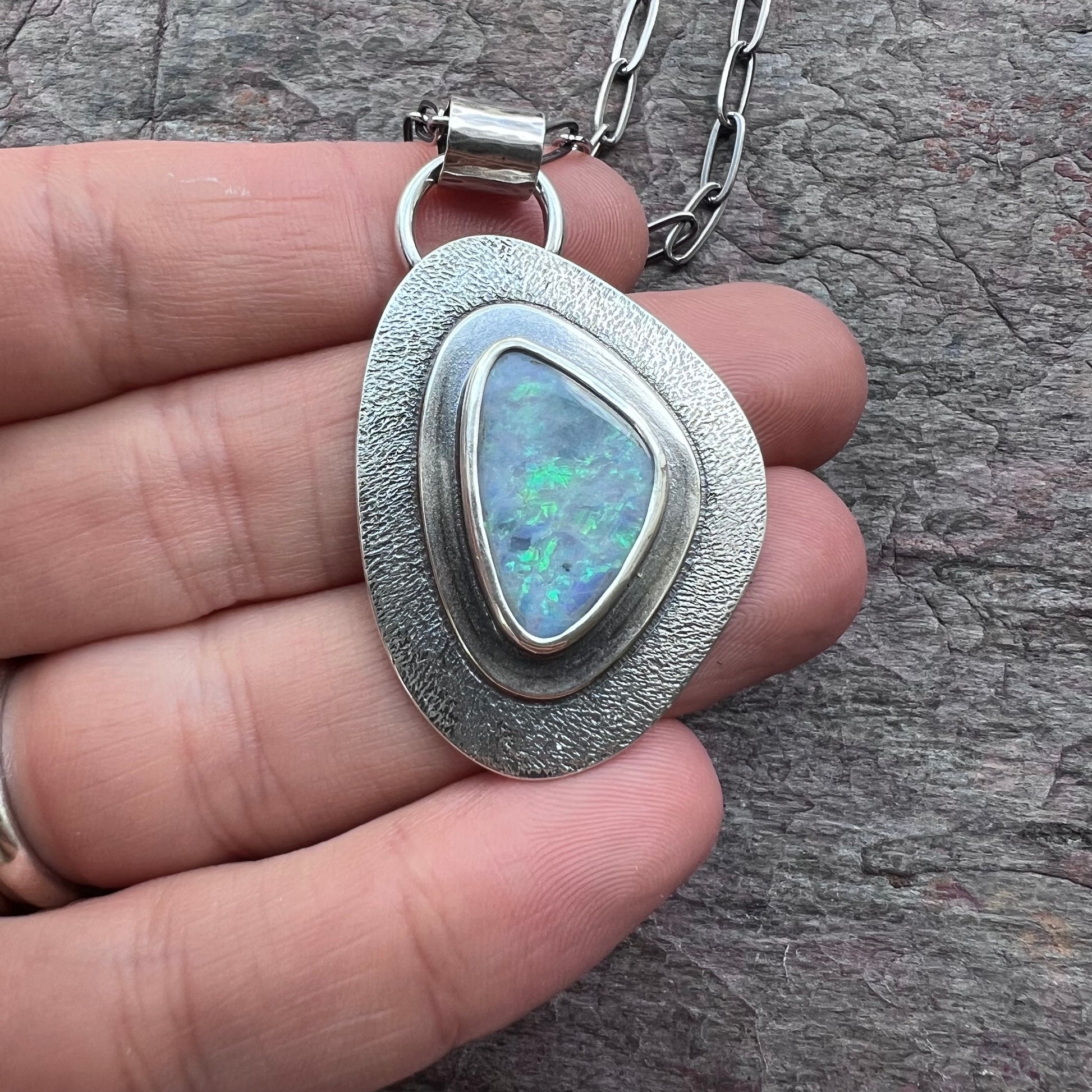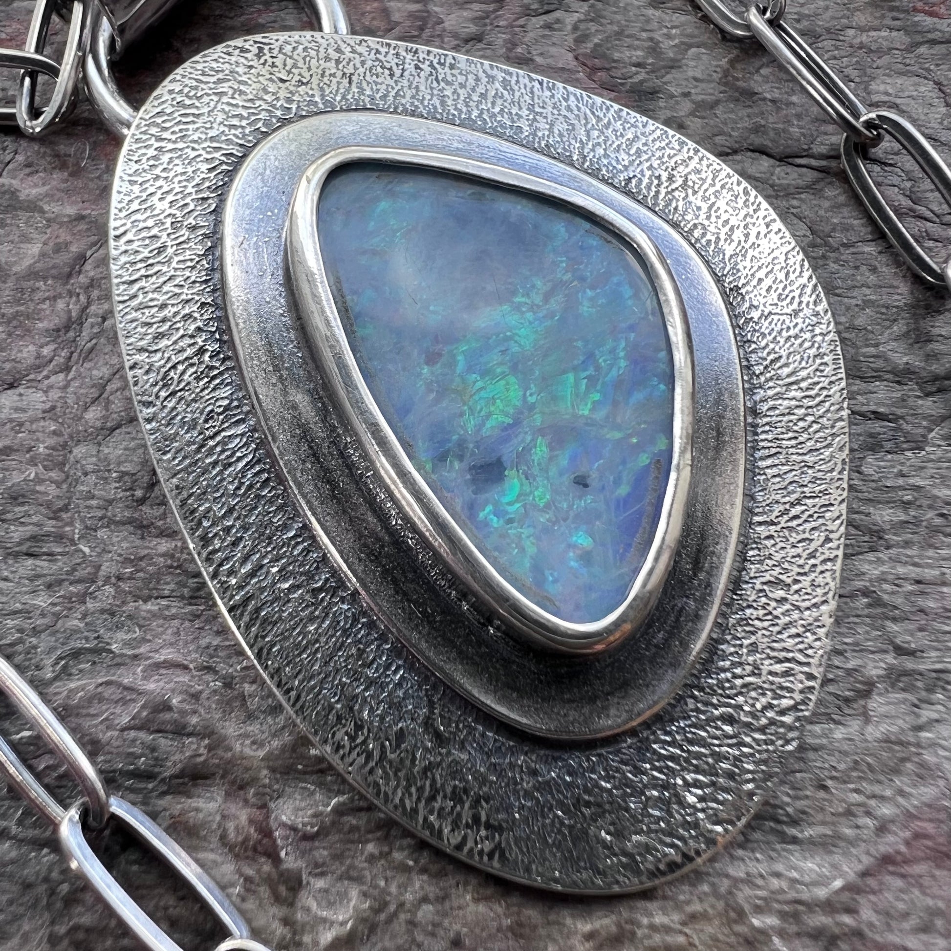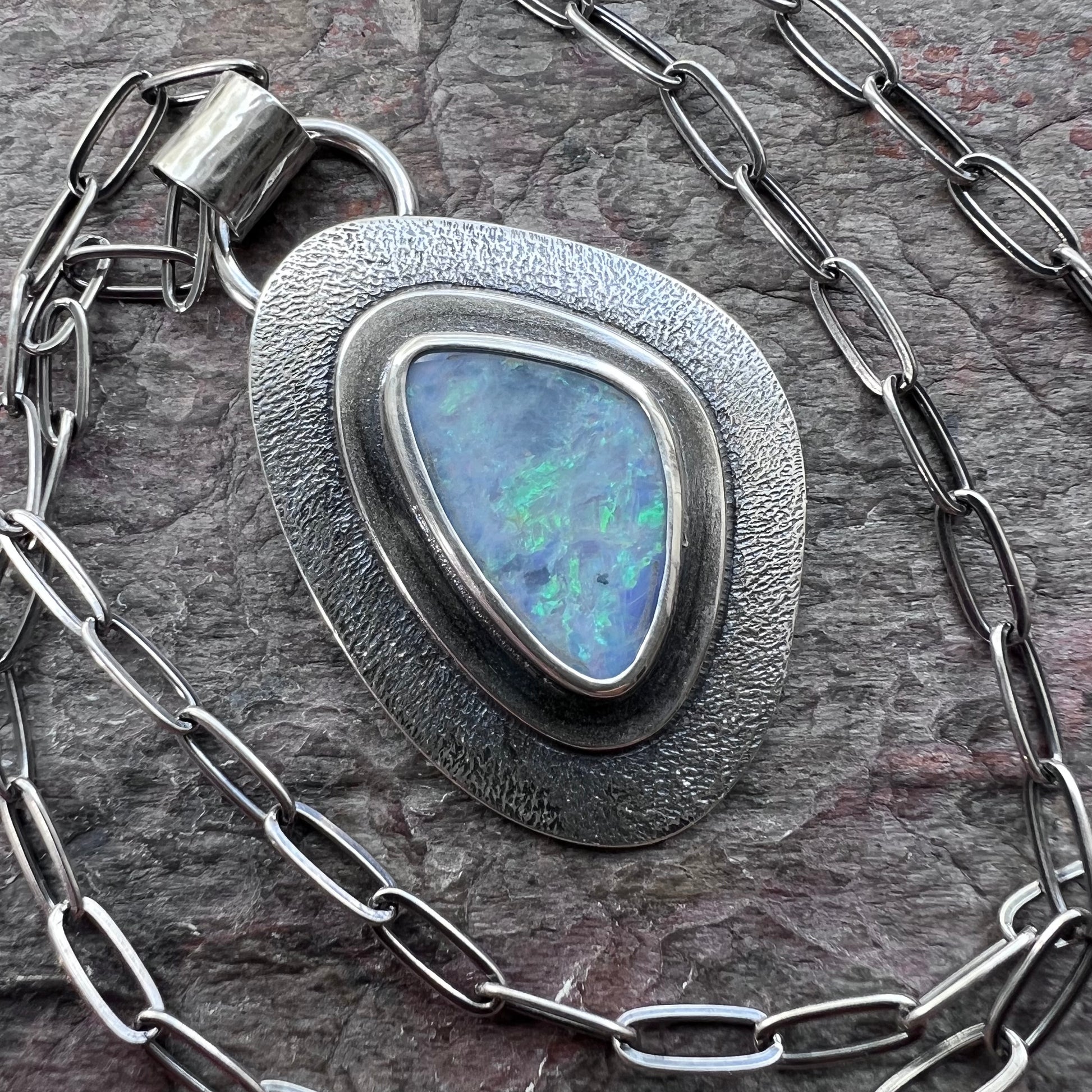 A genuine Australian opal doublet has been set in sterling and fine silver. I have made this one-of-a-kind necklace by sawing, soldering, texturing, and finishing the design entirely by hand. Pendant hangs from a sterling silver chain featuring a 3-inch extender allowing it to be worn between 22-25 inches in total length. The silver has been oxidized and polished to create a patina finish.