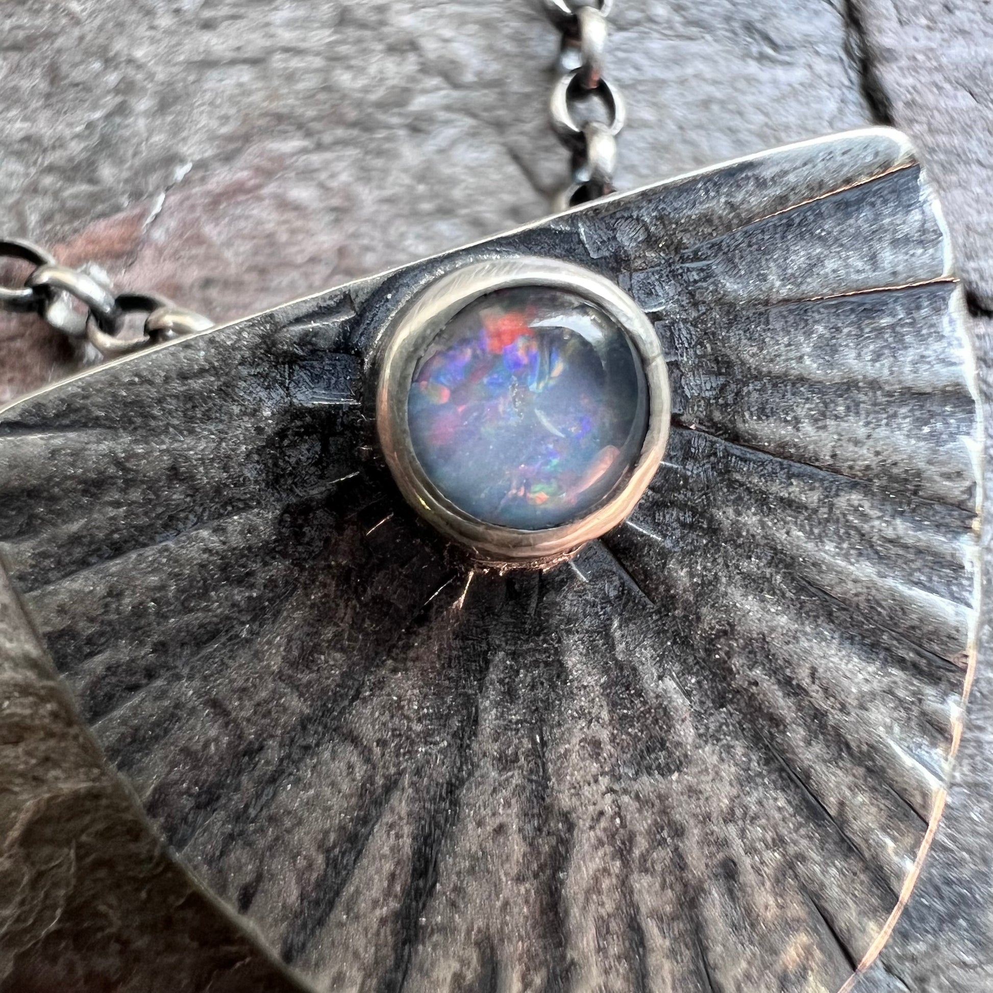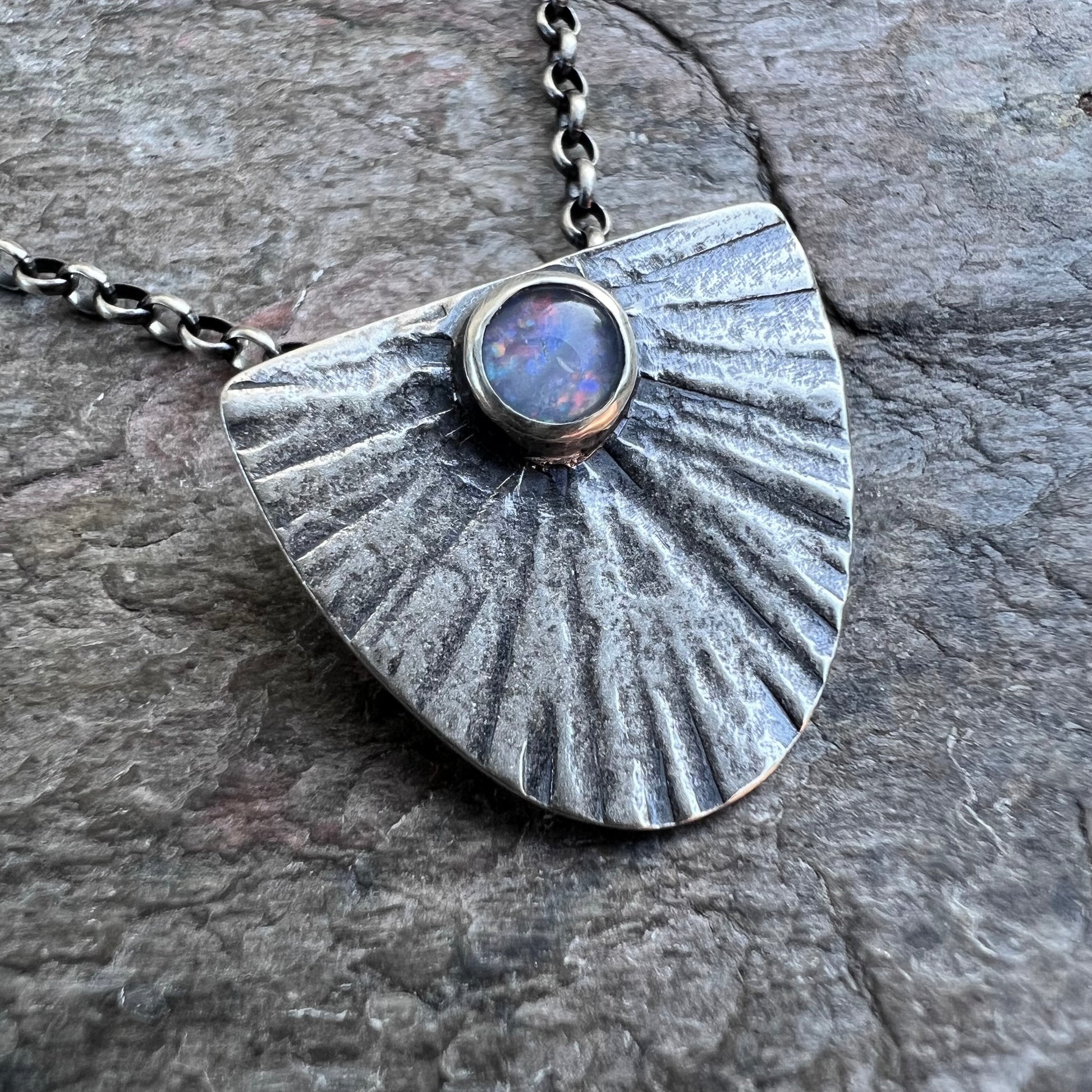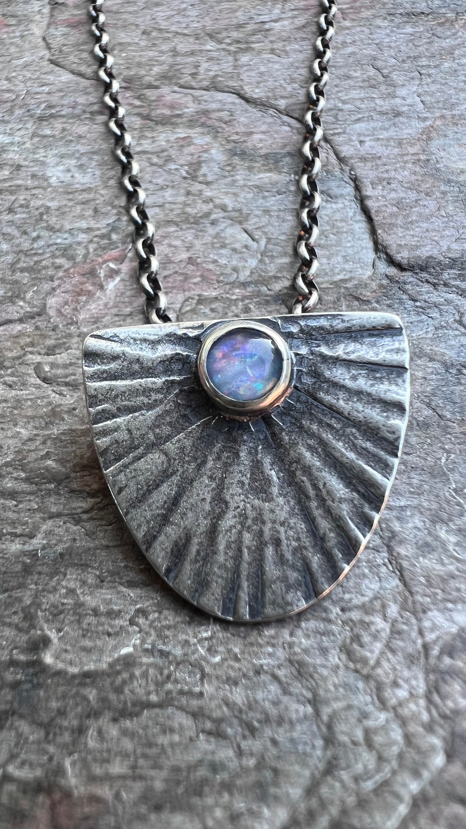 A small genuine Australian opal triplet has been set in sterling and fine silver. I have made this unique necklace by sawing, soldering, texturing, and finishing the design entirely by hand. Pendant hangs from a sterling silver chain featuring a 3-inch extender allowing it to be worn from 16 to 19 inches. The silver has been oxidized and polished to create a patina finish.