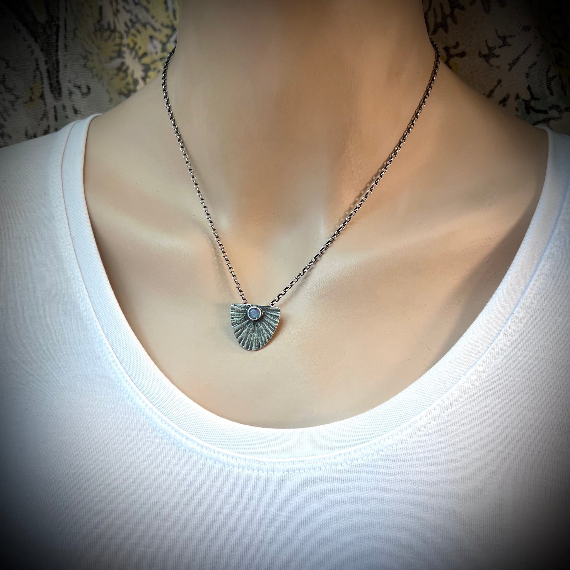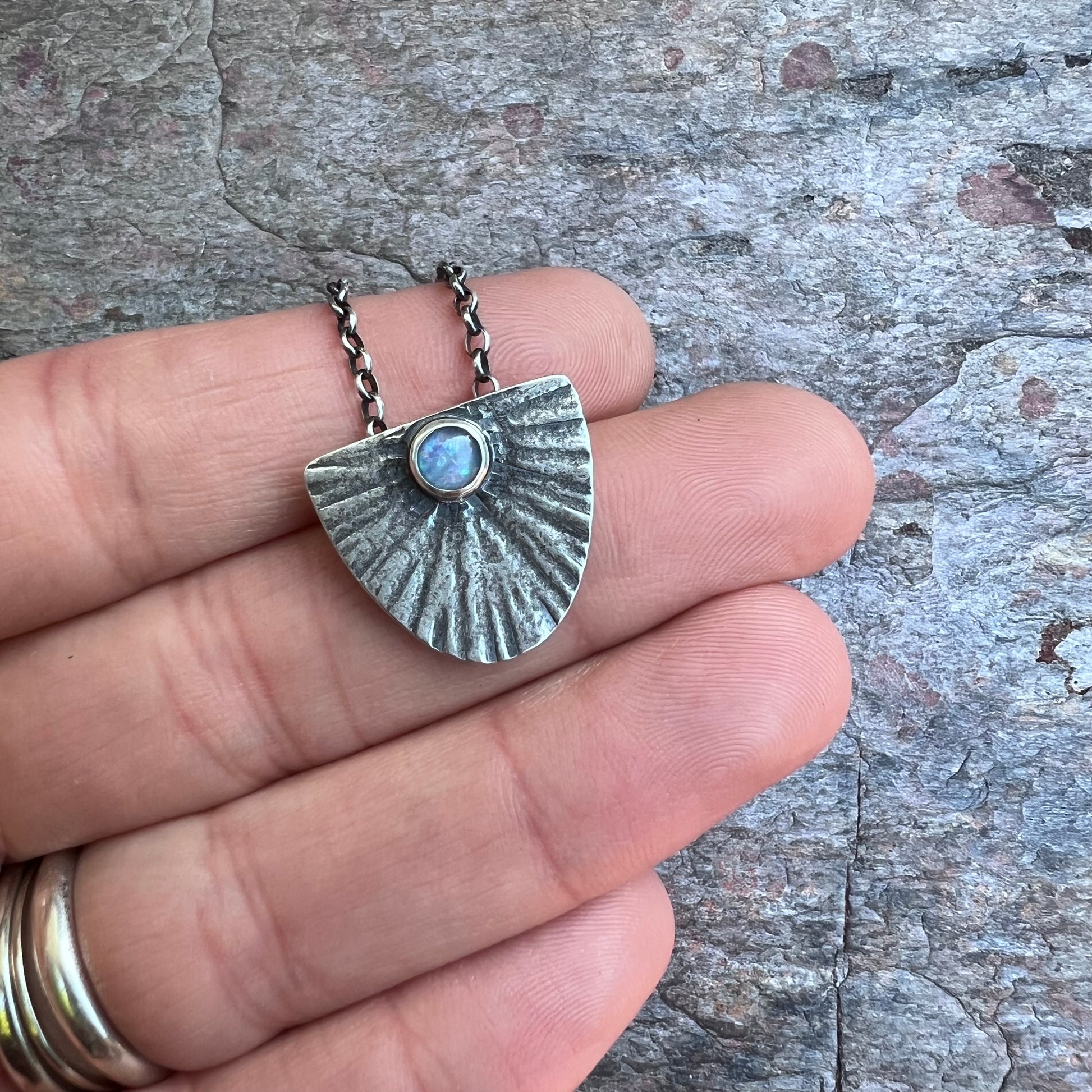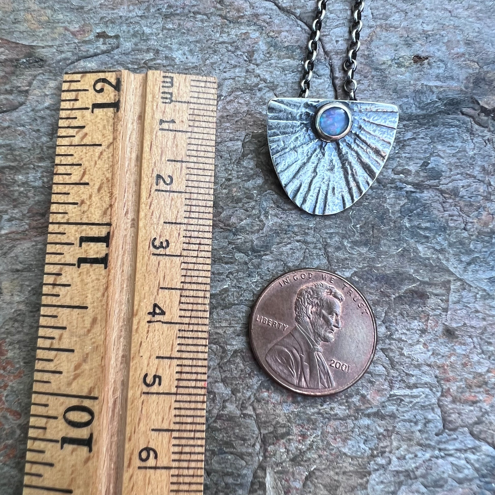A small genuine Australian opal triplet has been set in sterling and fine silver. I have made this unique necklace by sawing, soldering, texturing, and finishing the design entirely by hand. Pendant hangs from a sterling silver chain featuring a 3-inch extender allowing it to be worn from 16 to 19 inches. The silver has been oxidized and polished to create a patina finish.