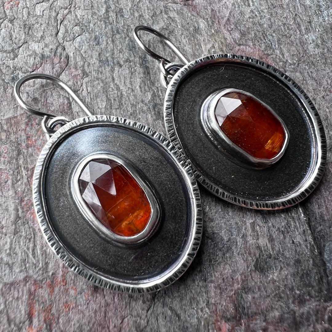 I have set two faceted orange Kyanite cabochons in sterling silver. The sparkling stones are framed by a textured sterling silver oval and a smooth silver blackplate. These one-of-a-kind earrings have been formed, soldered, and textured entirely by hand. The silver has been oxidized and polished to create a patina finish.