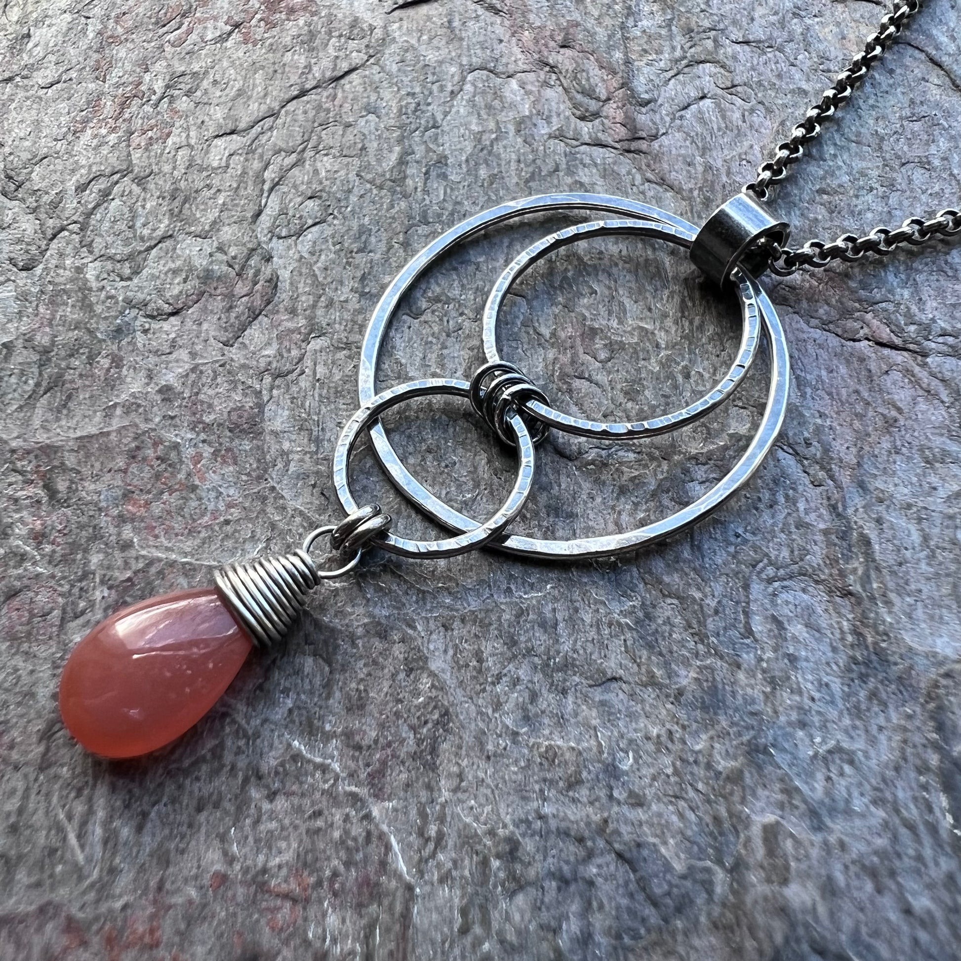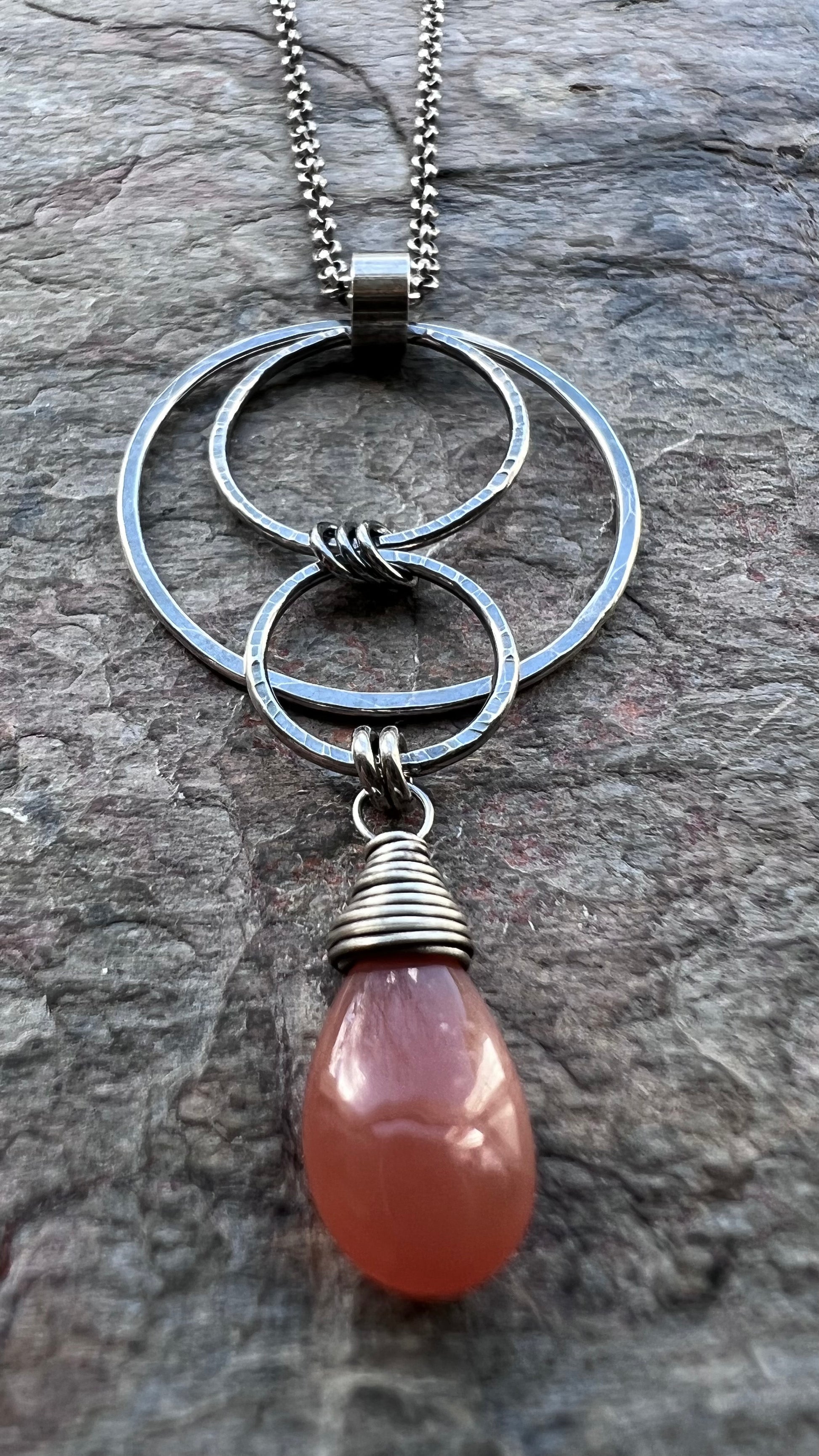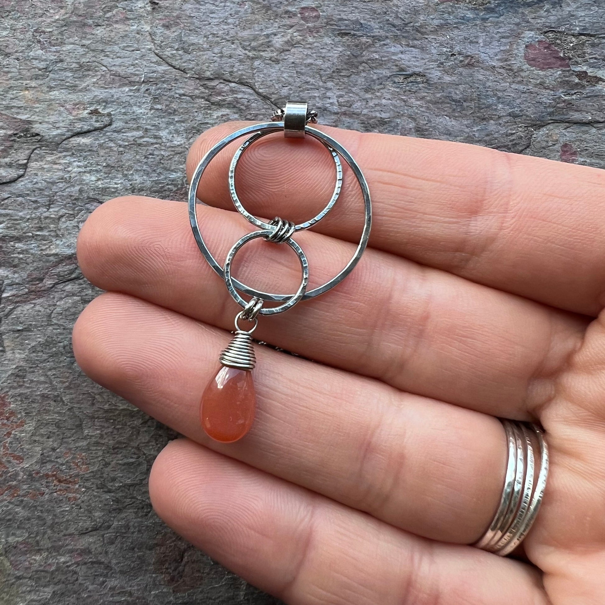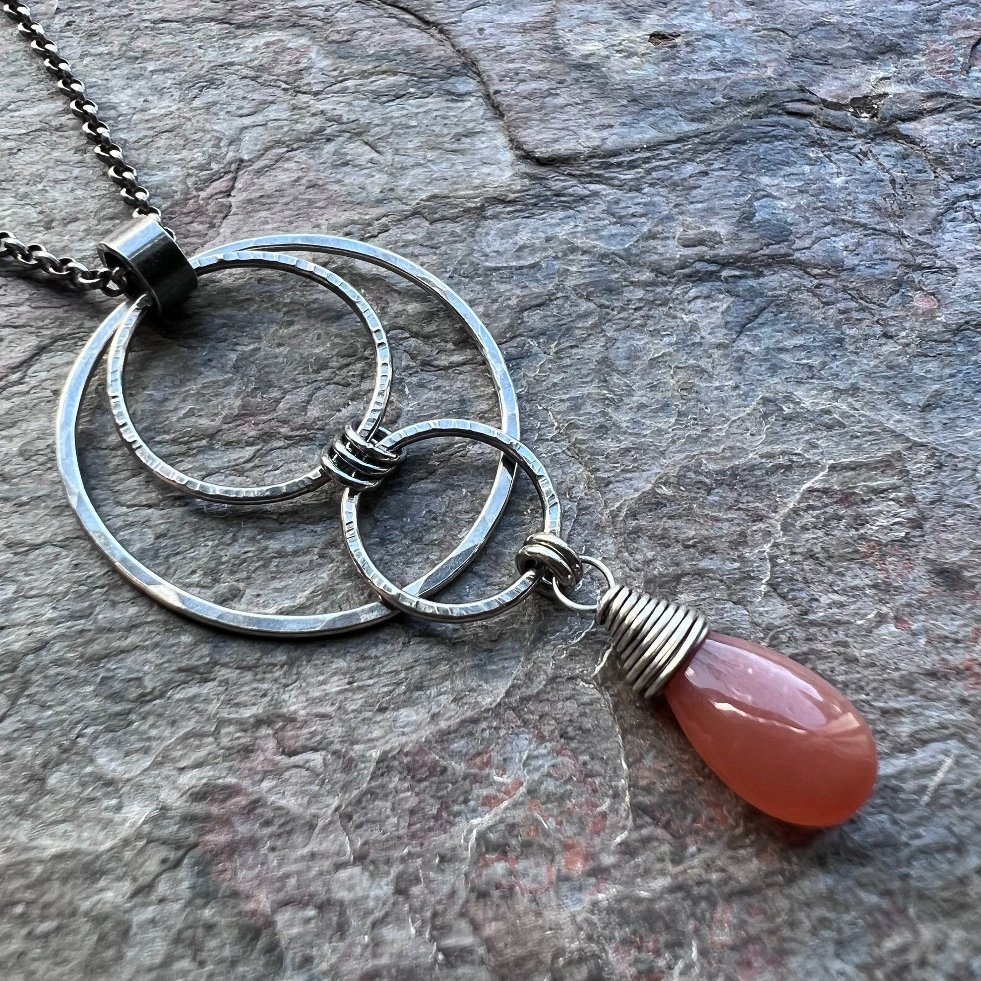 A natural Peach Moonstone teardrop has been wrapped in sterling silver wire. The stone dangles below a set of sterling silver circles I have formed, soldered, and textured by hand. Th pendant hangs from a sterling silver chain. The silver has been oxidized and polished to create a patina finish.