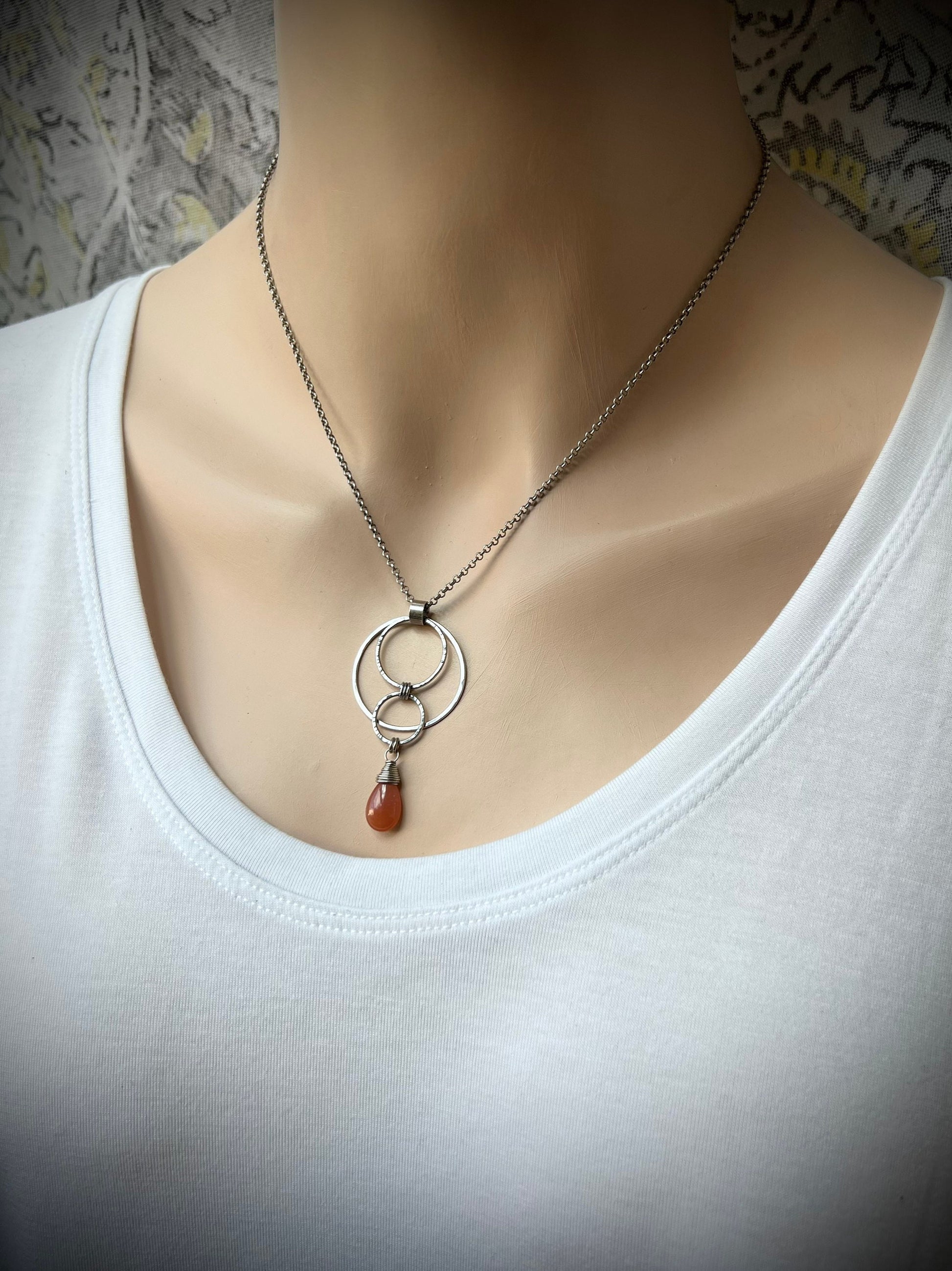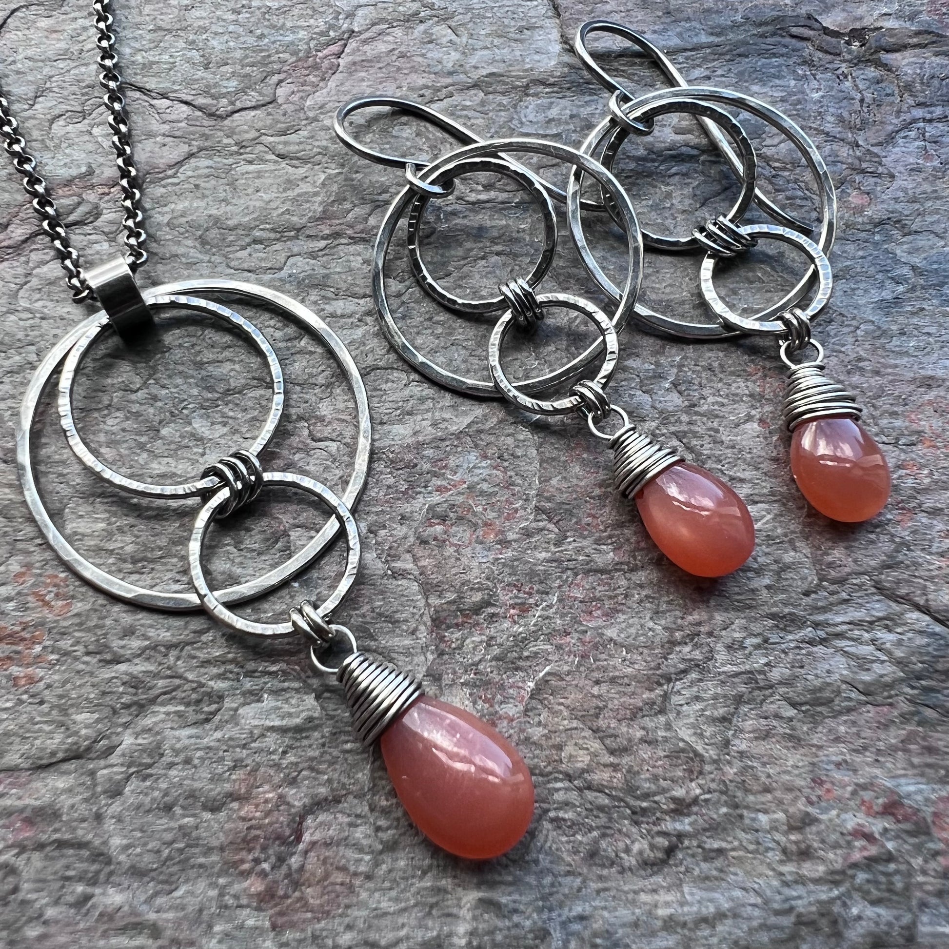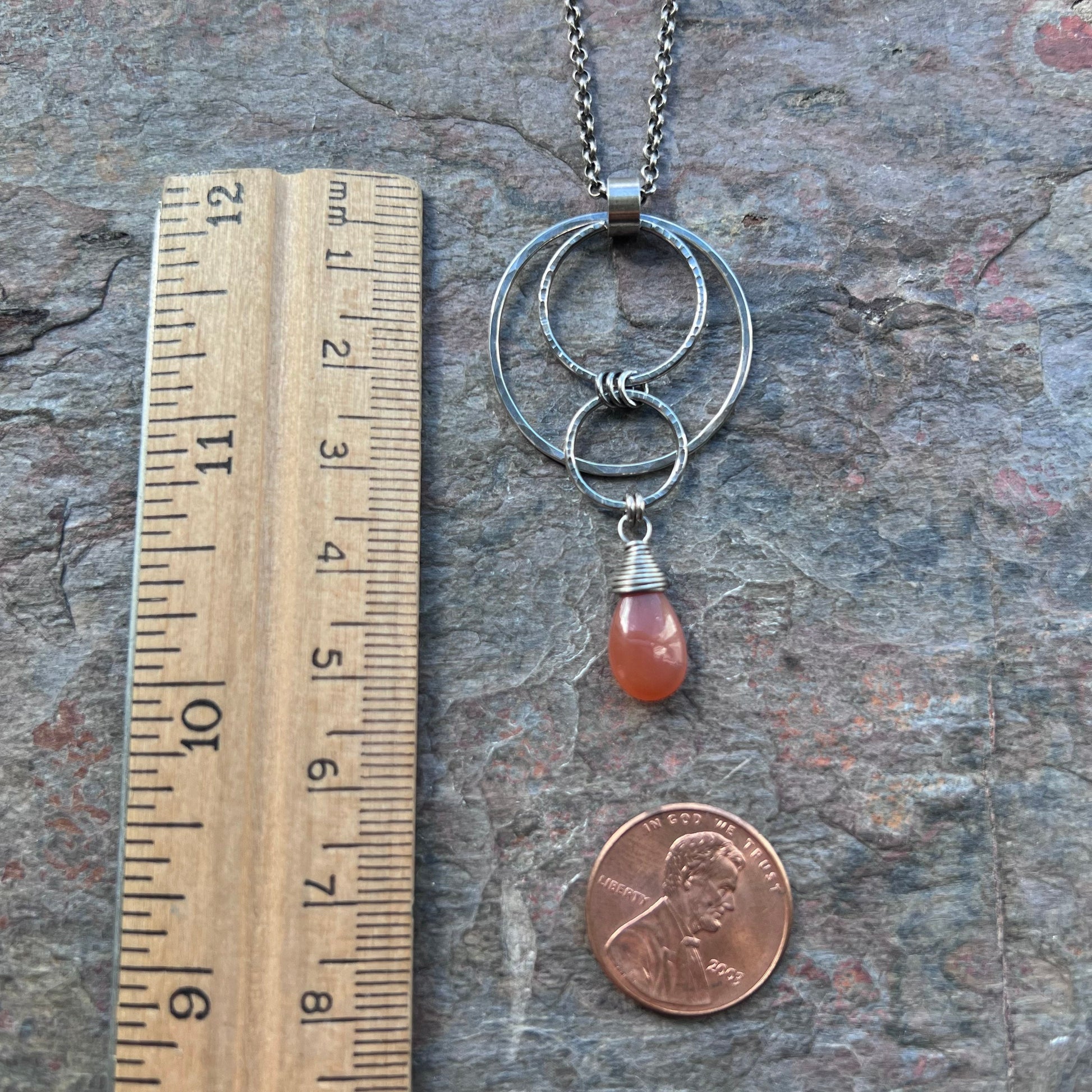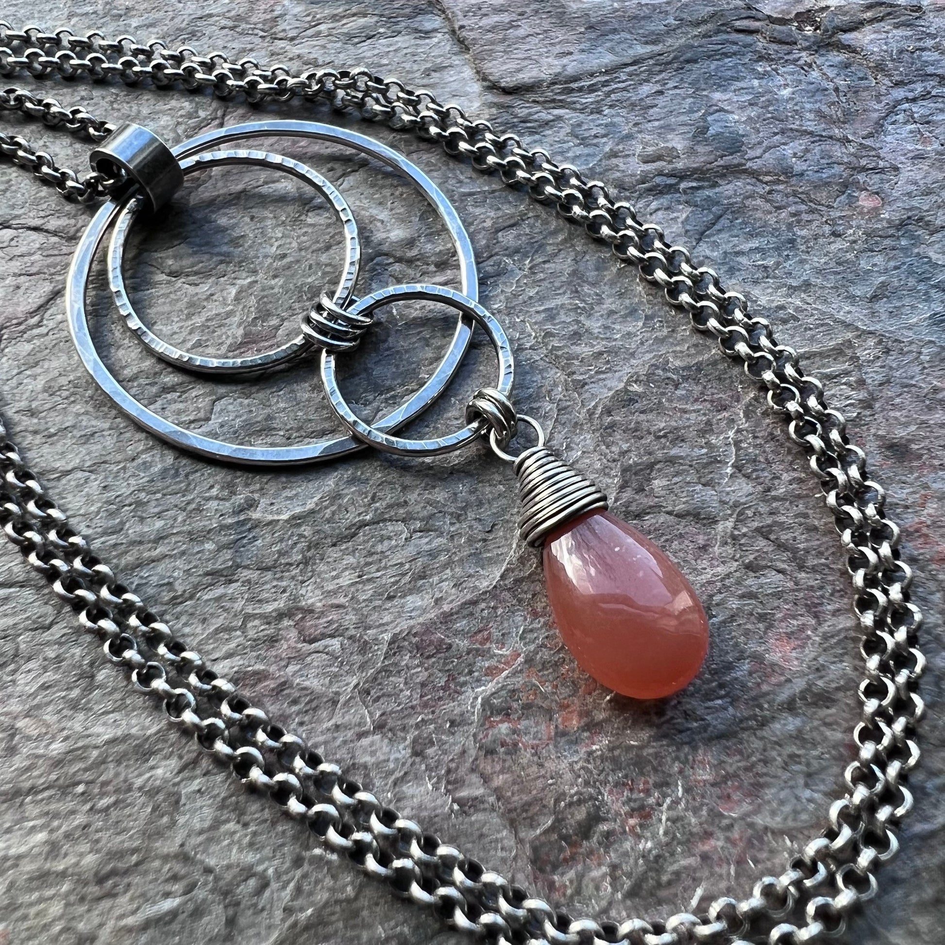 A natural Peach Moonstone teardrop has been wrapped in sterling silver wire. The stone dangles below a set of sterling silver circles I have formed, soldered, and textured by hand. Th pendant hangs from a sterling silver chain. The silver has been oxidized and polished to create a patina finish.