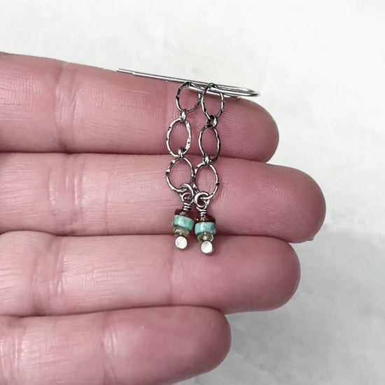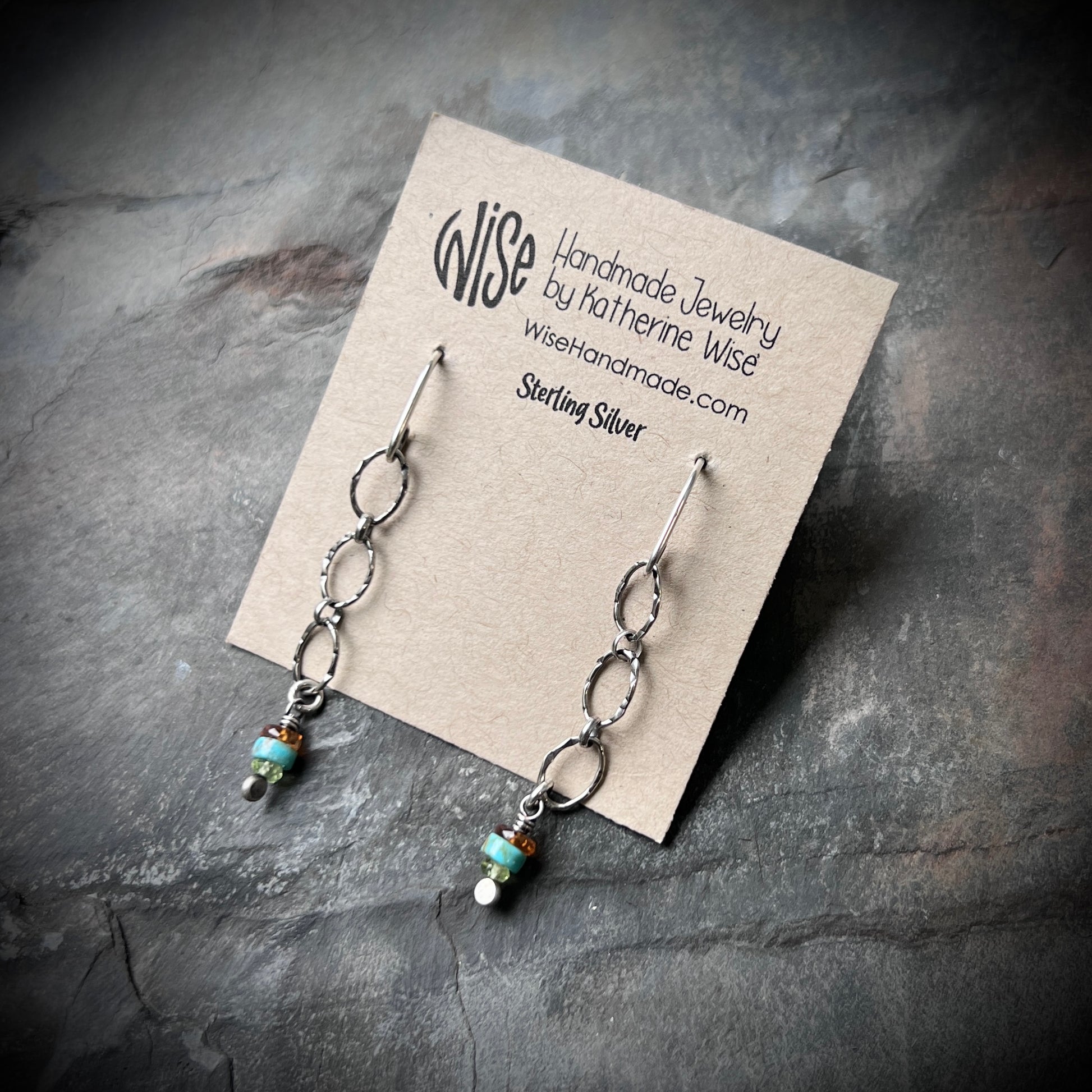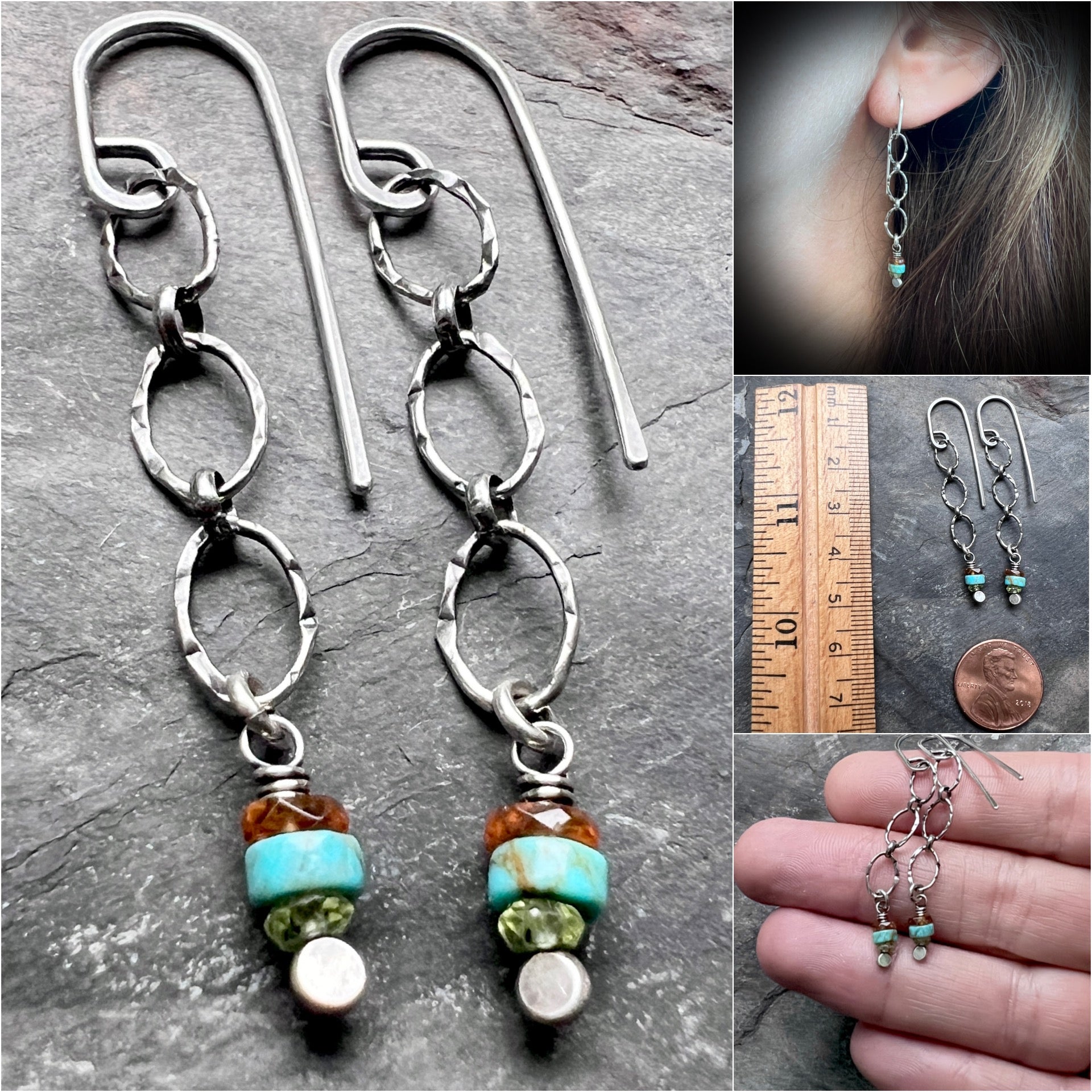 These lightweight dangle earrings are handmade from genuine peridot, turquoise, hessonite garnet, and sterling silver. I have carefully wrapped the set of tiny natural stones in sterling silver. The beads dangle from texture oval links.