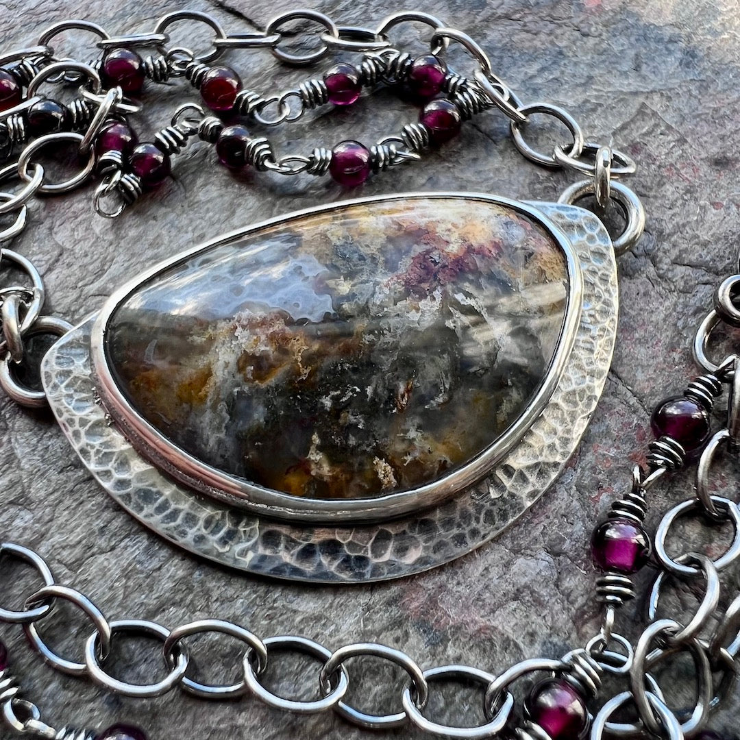I have set a Plume Agate cabochon in sterling silver. The stone is framed by a hammered sterling silver border and it is suspended along a sterling silver cable chain. Above the pendant is a handmade beaded chain I have created by carefully wrapping genuine Garnet gems in sterling silver wire. The two chains overlap to create a unique layered style. The back of the necklace features a 2-inch extender allowing it to be worn from about 18-20 inches for the Plume Agate chain and about 17-19 inches for the Garnet chain. The silver has been oxidized and polished to create a patina finish.