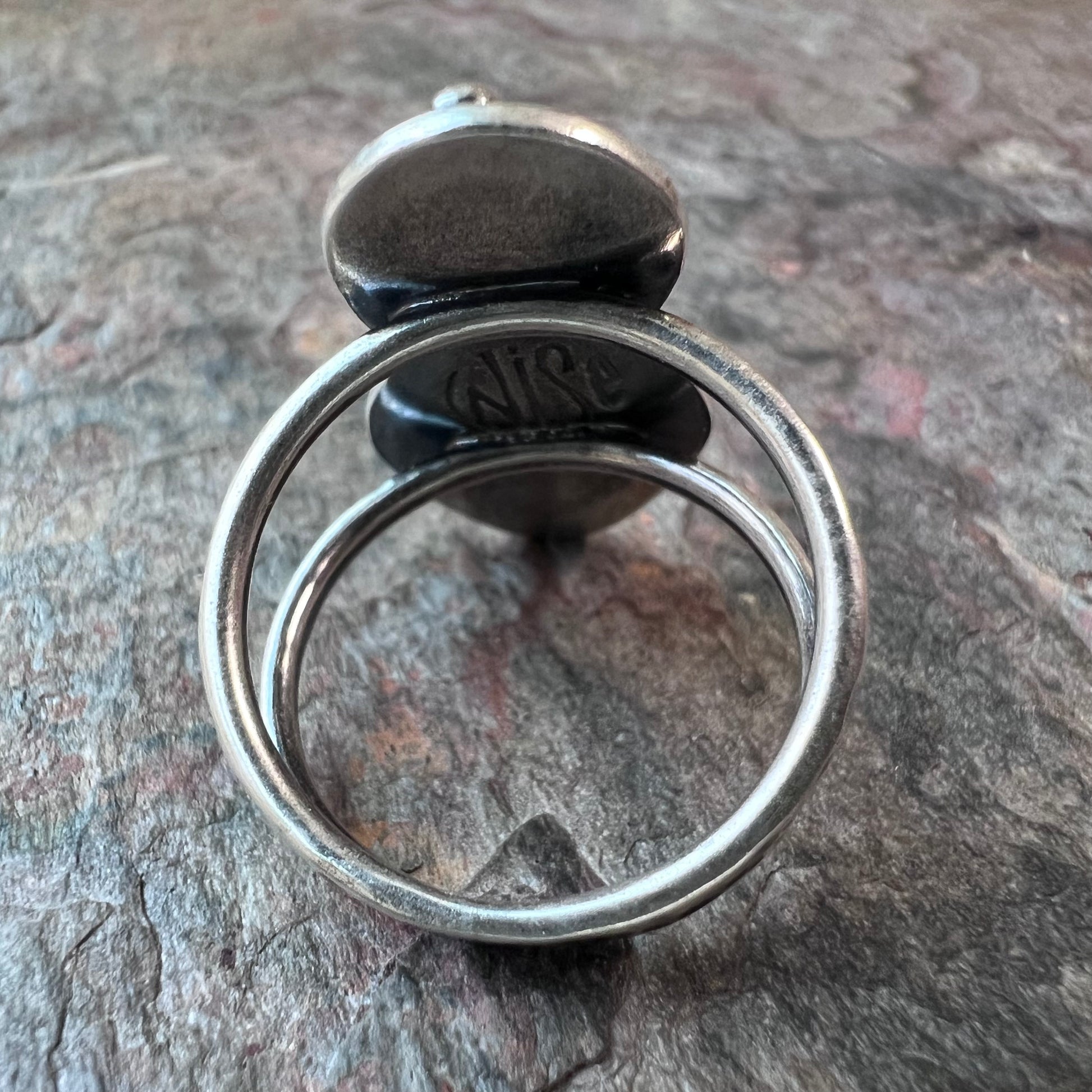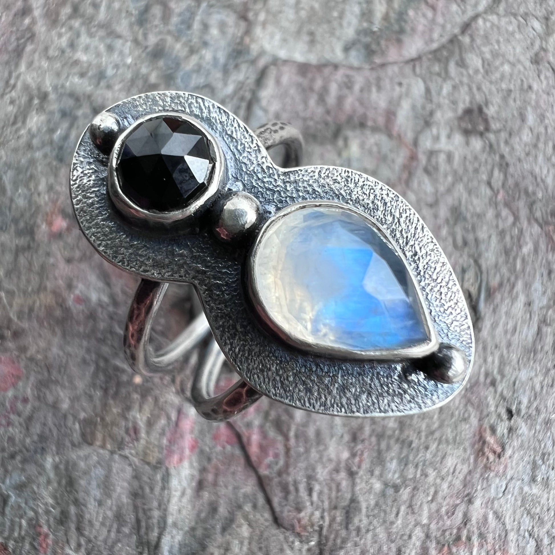 Rainbow moonstone and black spinel cabochons have been set in sterling and fine silver. I have made this one-of-a-kind ring by sawing, soldering, texturing, and finishing the design entirely by hand. The sterling silver band has an internal diameter of about 18mm and is sized at approximately US size 8. The silver has been oxidized and polished to create a patina finish.
