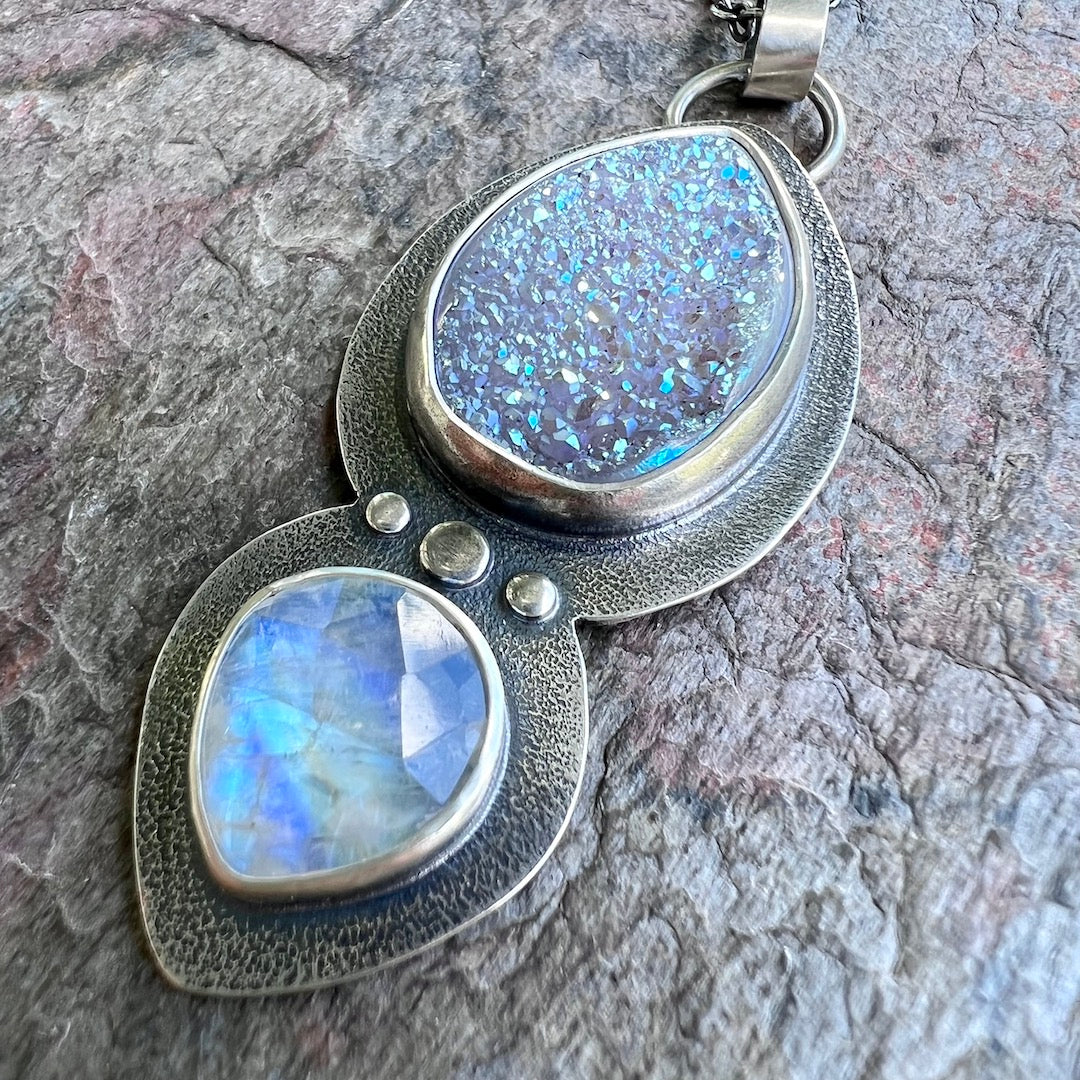 I have set a sparkling druzy stone in sterling and fine silver. Below the druzy is a glowing Rainbow Moonstone cabochon. The stones are framed by a textured sterling silver setting and accented by three small sterling silver circles. I have created this unique design by sawing, forming, soldering, and finishing the piece entirely by hand. The one-of-a-kind Rainbow Moonstone flashes beautiful hues as the light is reflected along its surface. The pendant hangs from a 25-inch sterling silver chain. The silver has been oxidized and polished to create the patina finish.
