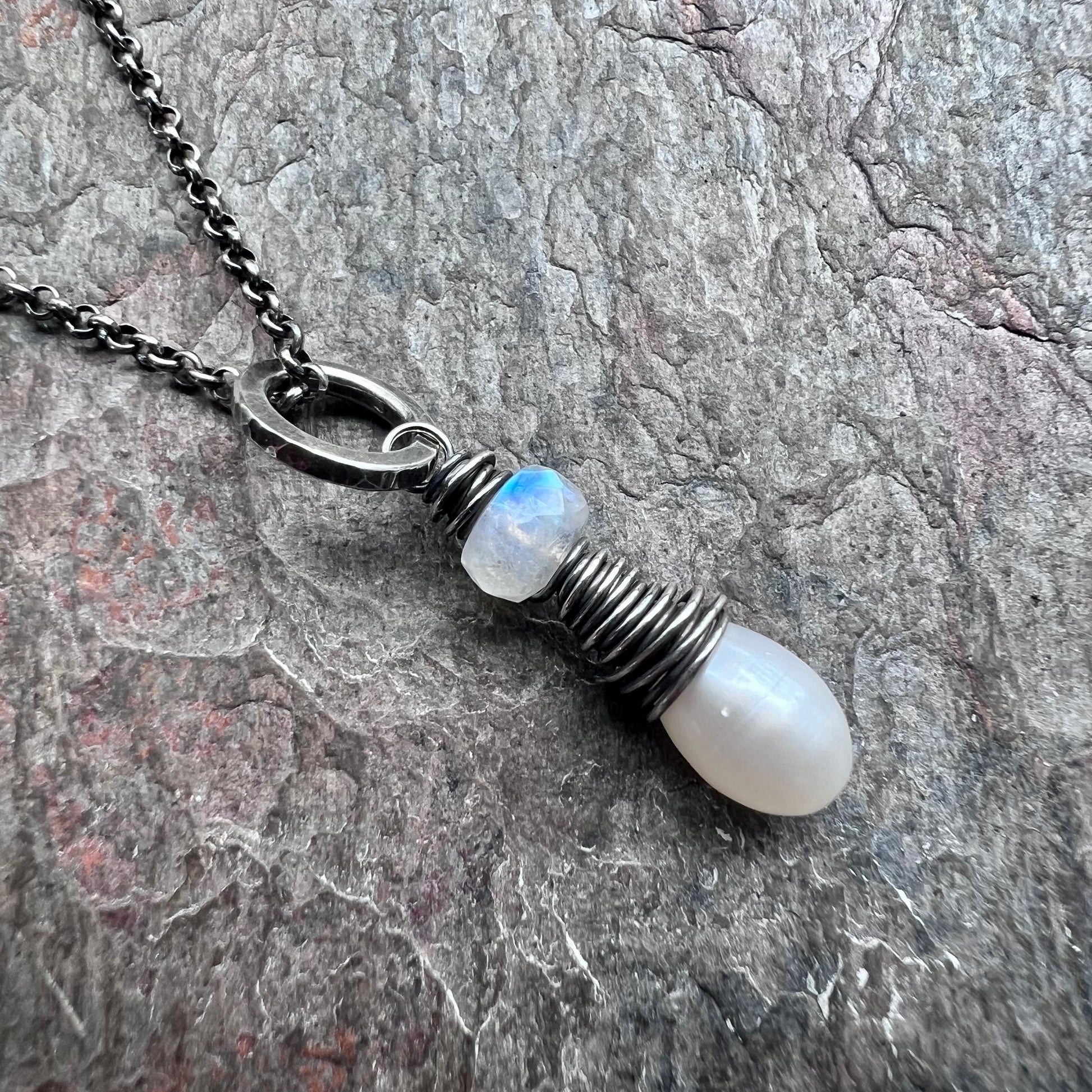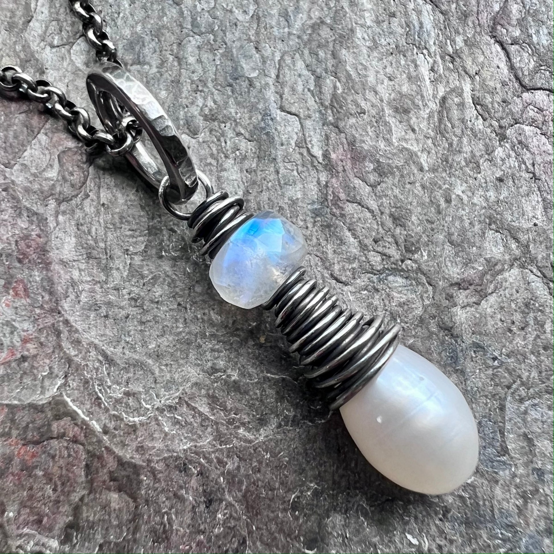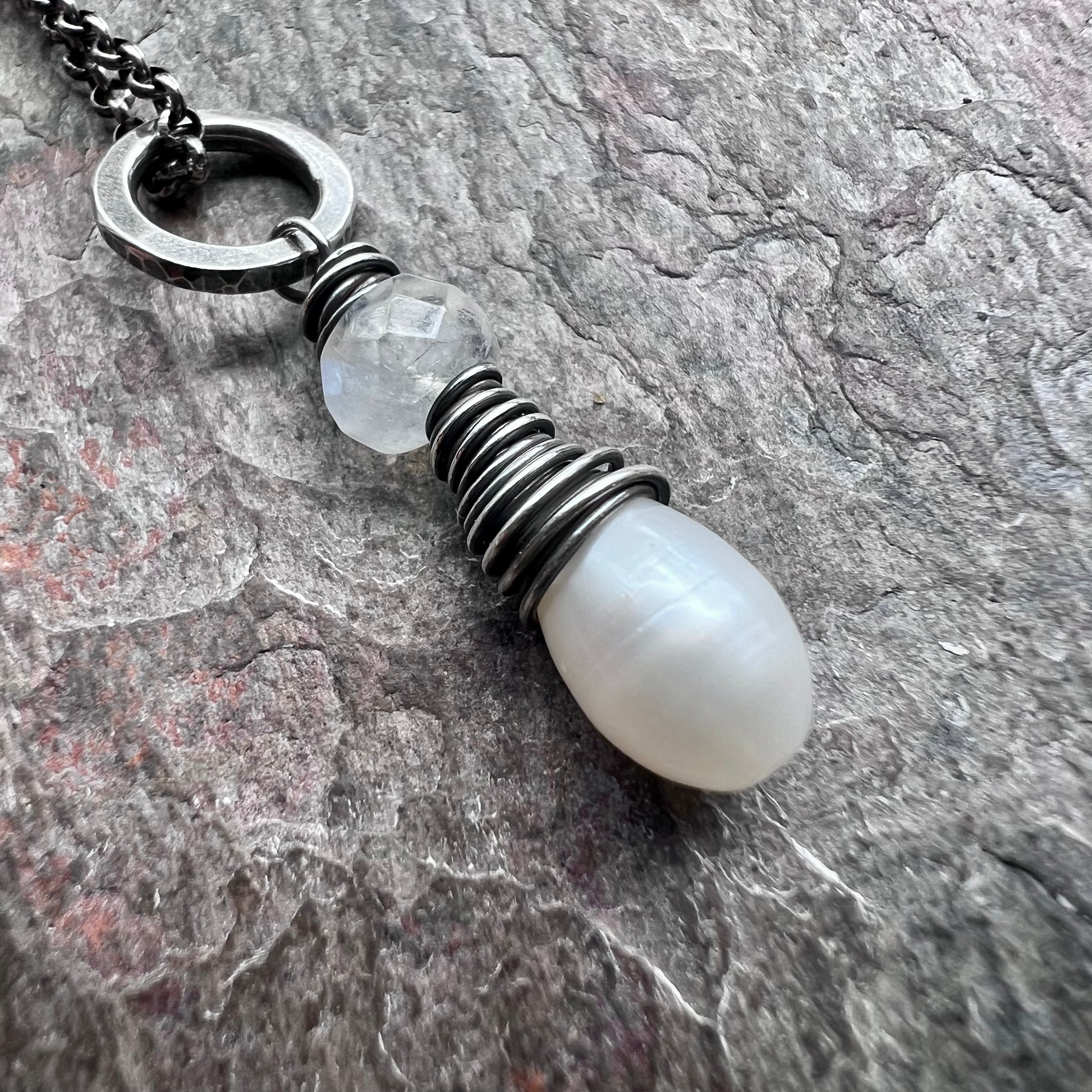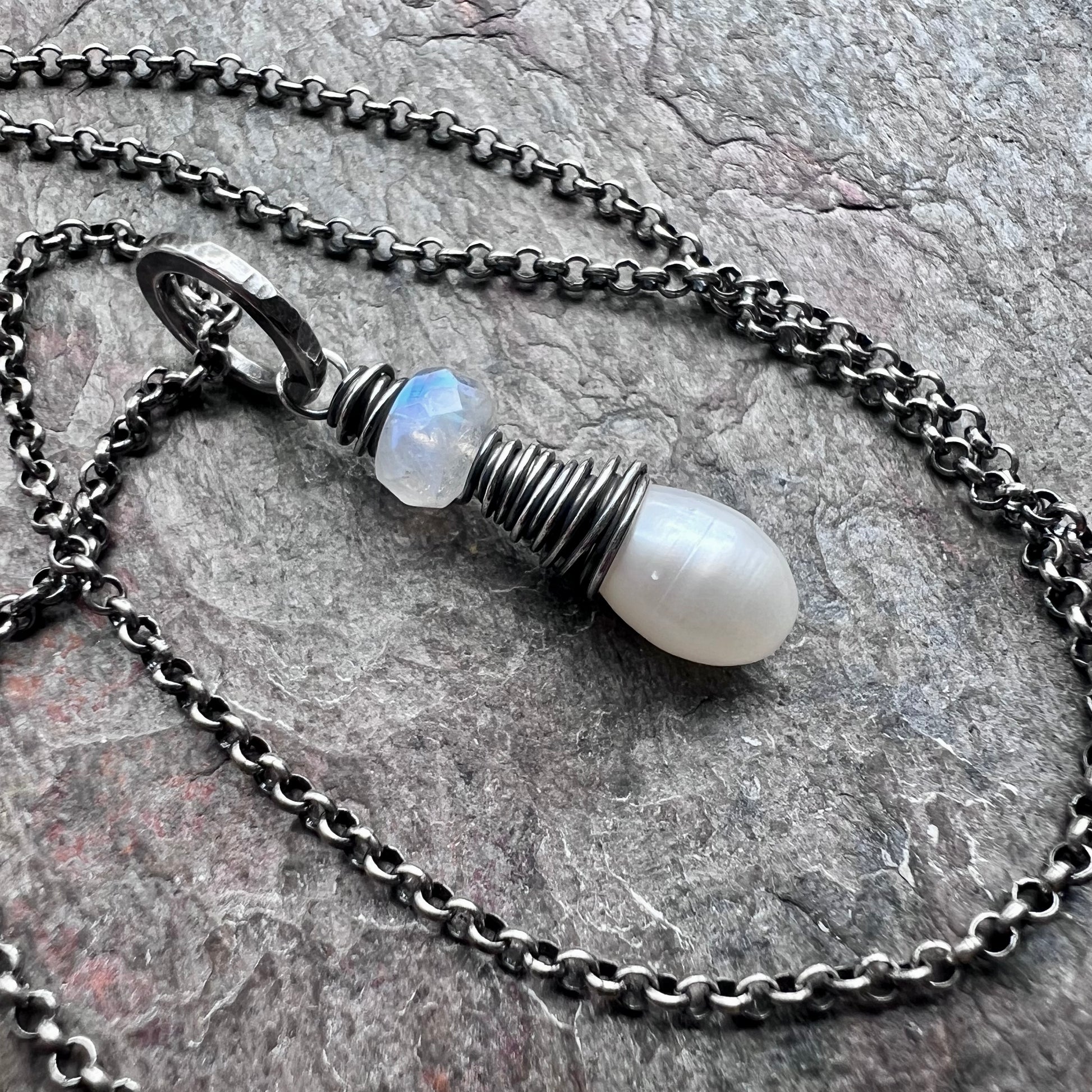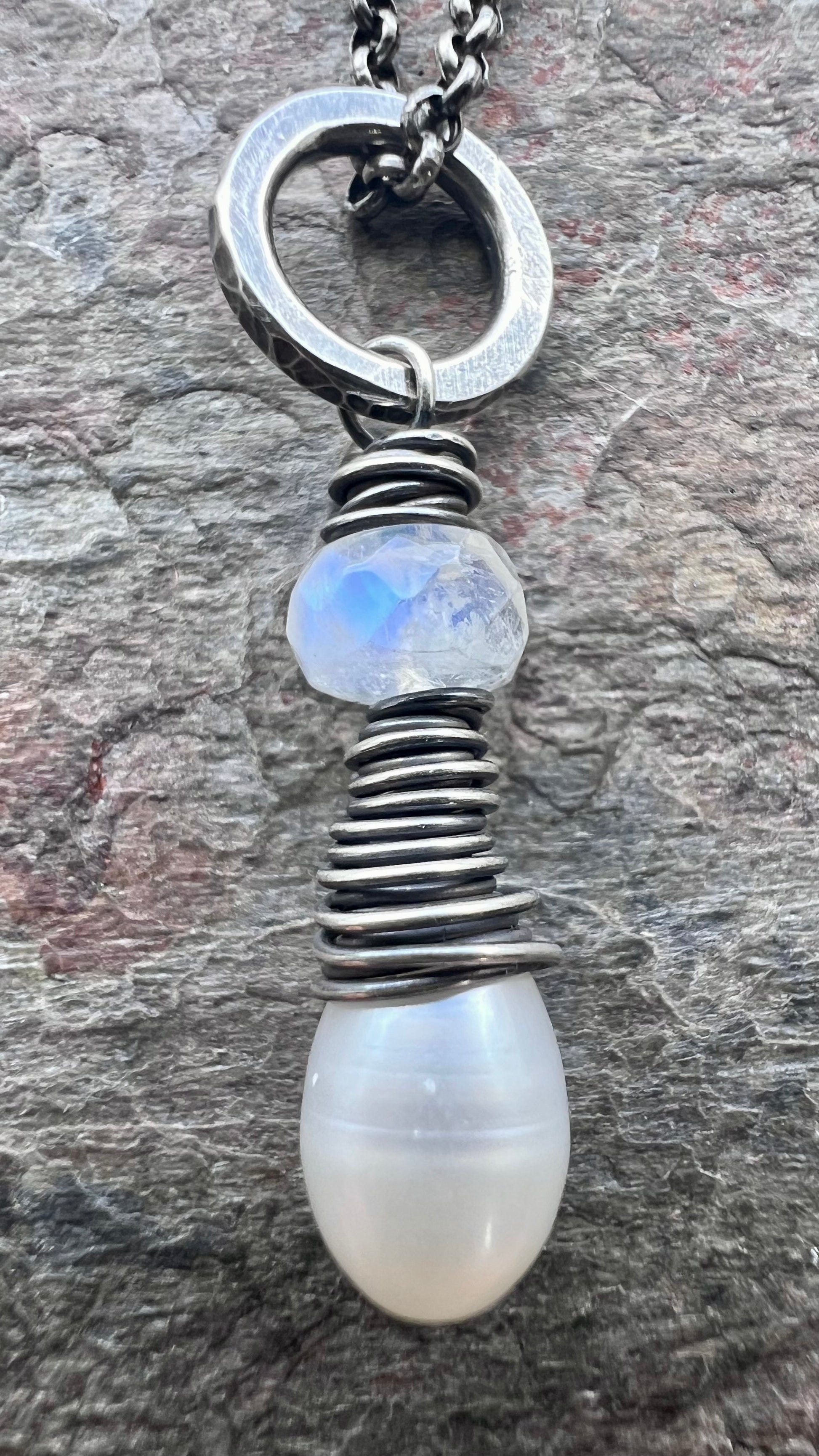 A genuine freshwater pearl has been wrapped in sterling silver. Above the pearl sits a small rainbow moonstone rondelle. The pendant dangles from a hammered sterling silver bail which has been formed, soldered, and textured by hand. The silver has been oxidized and polished to create an aged patina finish.