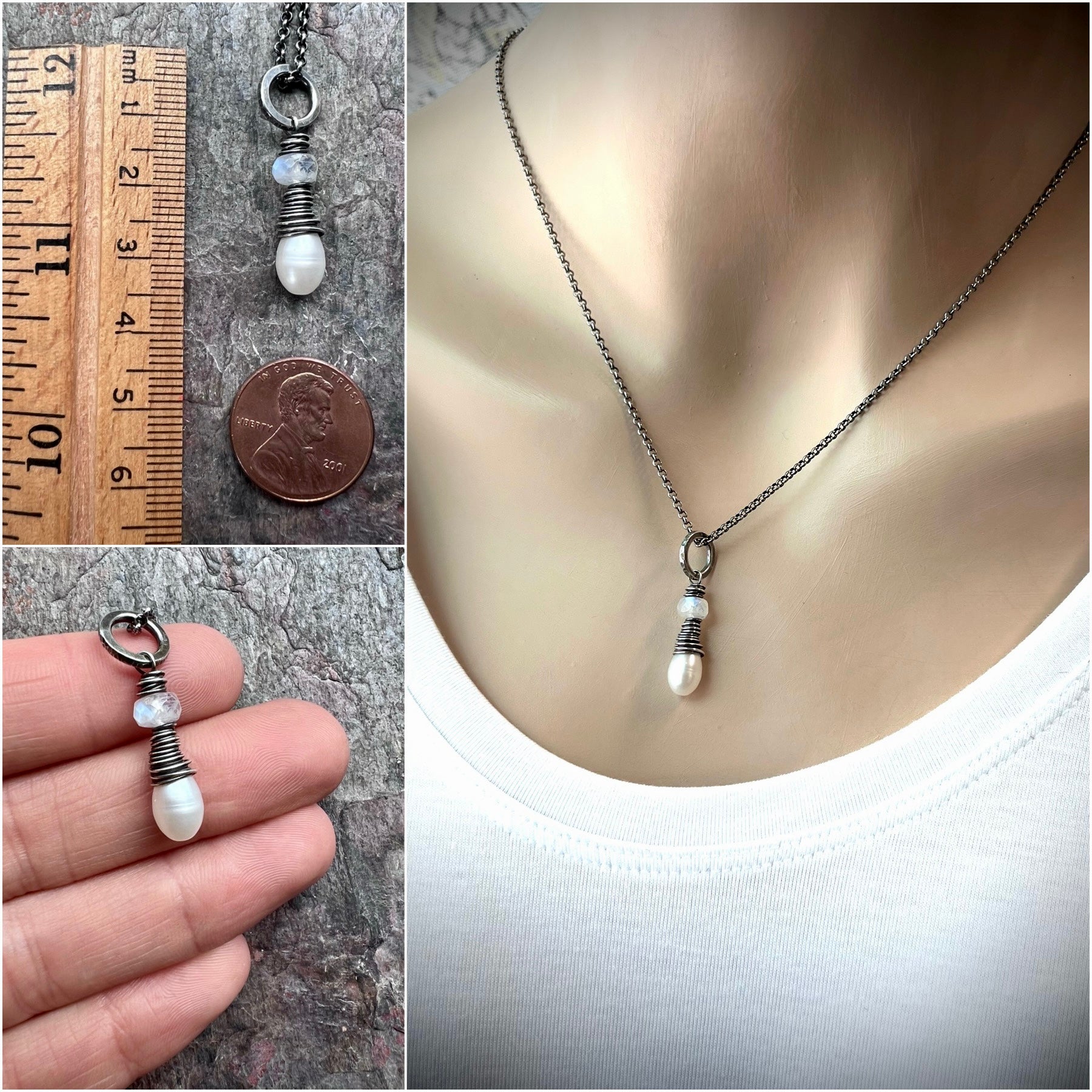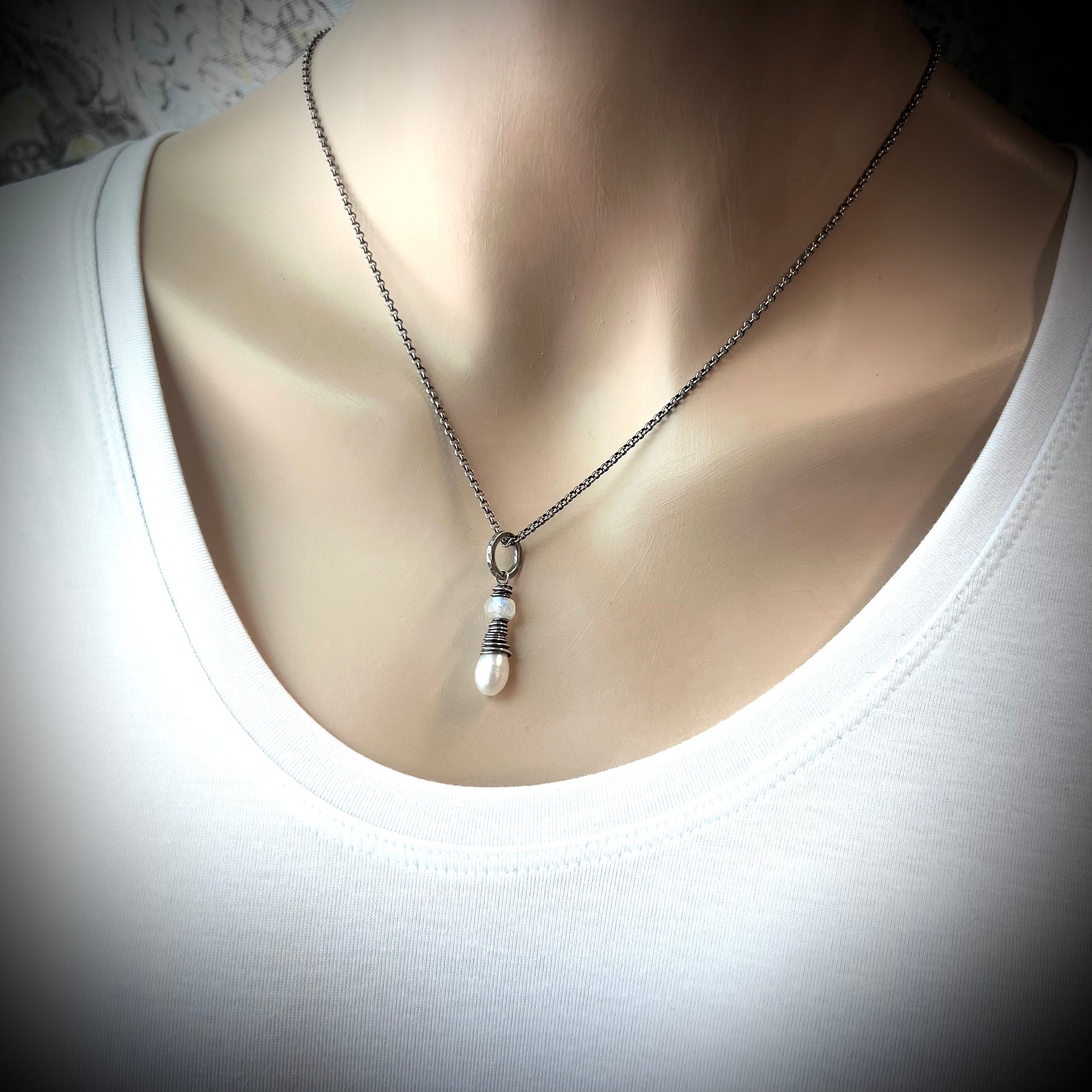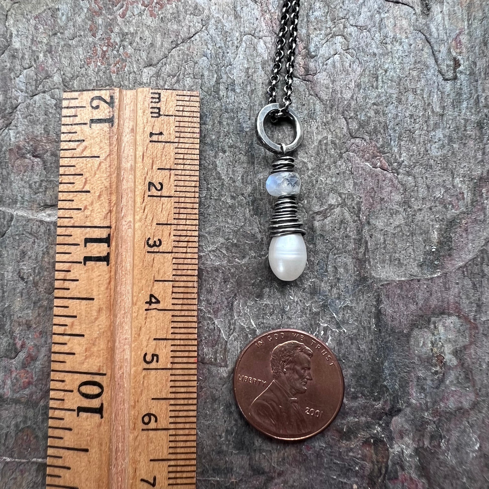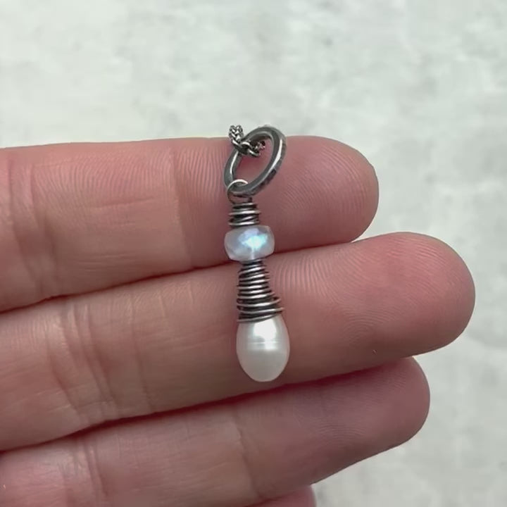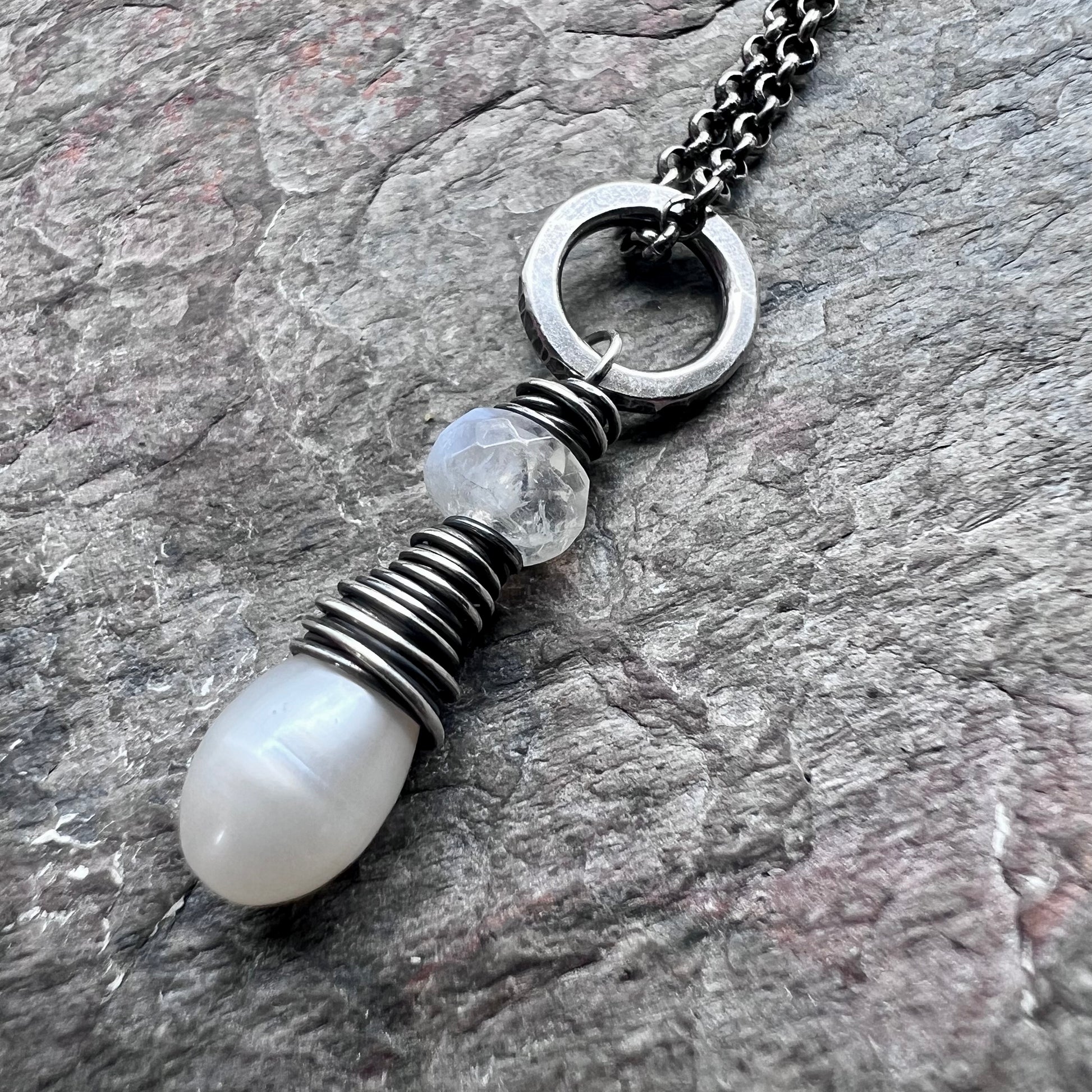 A genuine freshwater pearl has been wrapped in sterling silver. Above the pearl sits a small rainbow moonstone rondelle. The pendant dangles from a hammered sterling silver bail which has been formed, soldered, and textured by hand. The silver has been oxidized and polished to create an aged patina finish.