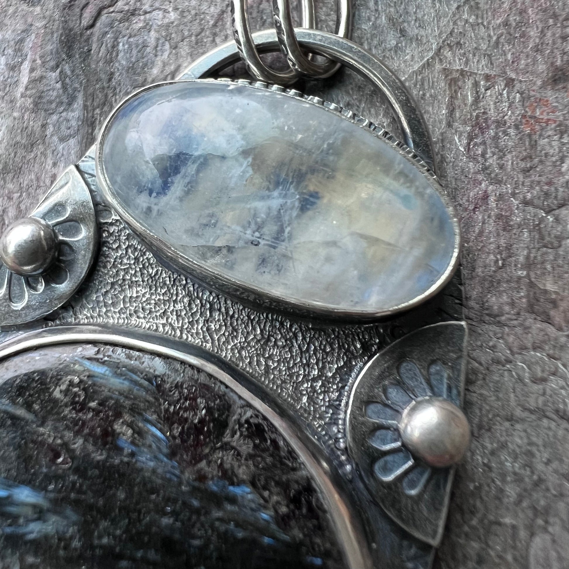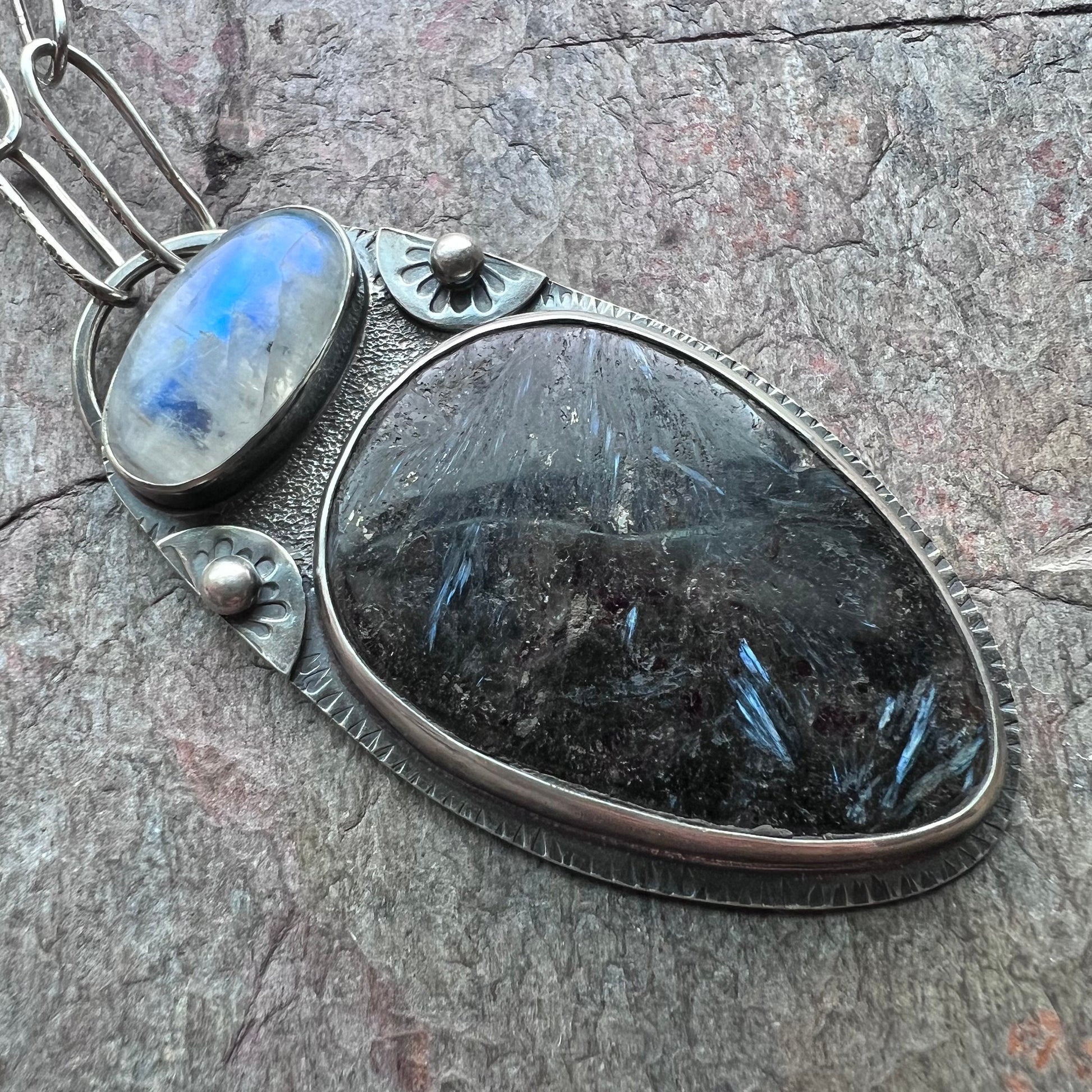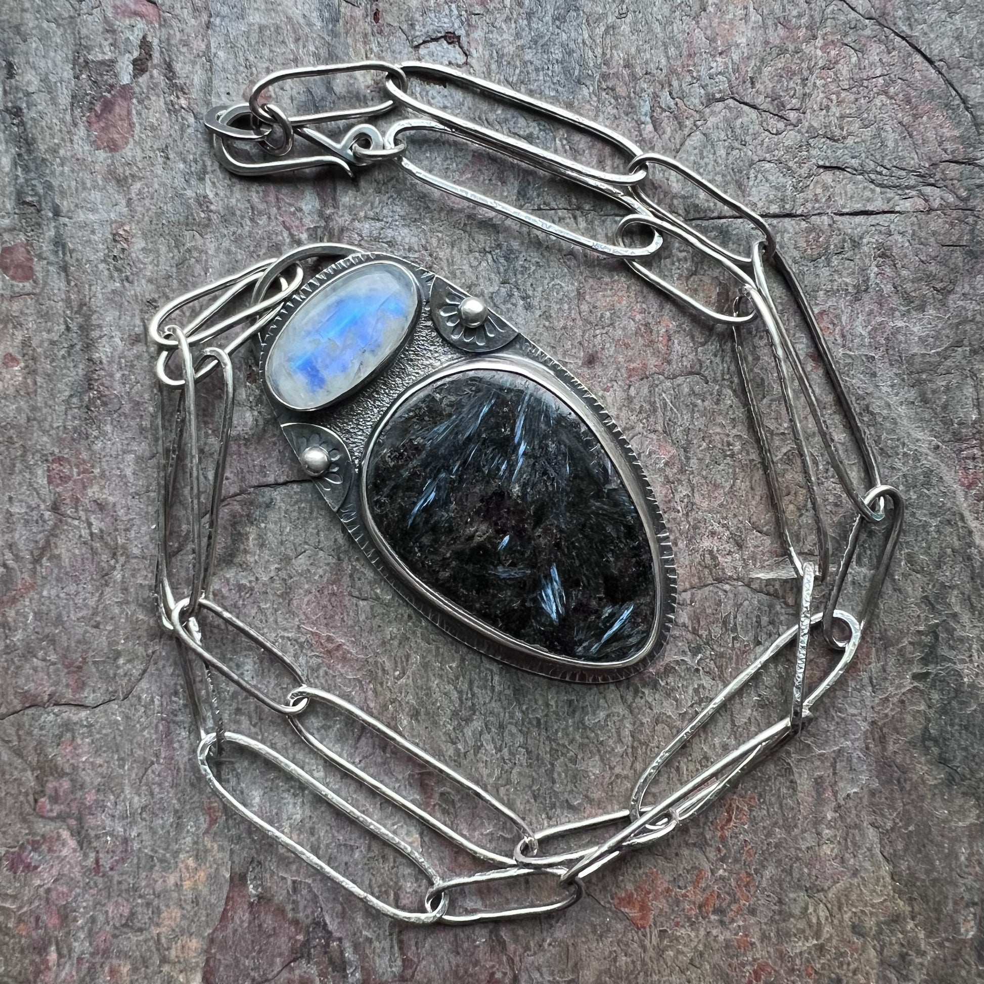 Rainbow moonstone and pietersite cabochons have been set in sterling and fine silver. I have made this one-of-a-kind necklace by sawing, soldering, texturing, and finishing the design entirely by hand. Pendant hangs from a handmade sterling silver chain which measures just under 24 inches in total length. The silver has been oxidized and polished to create a patina finish.
