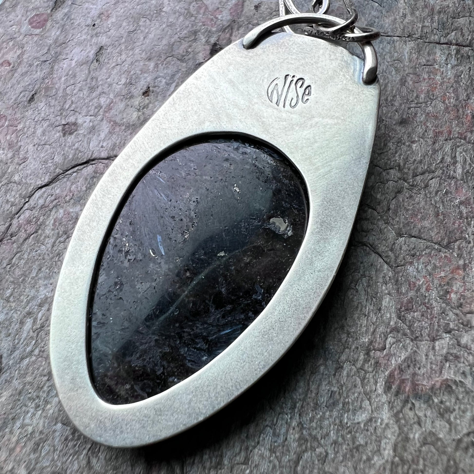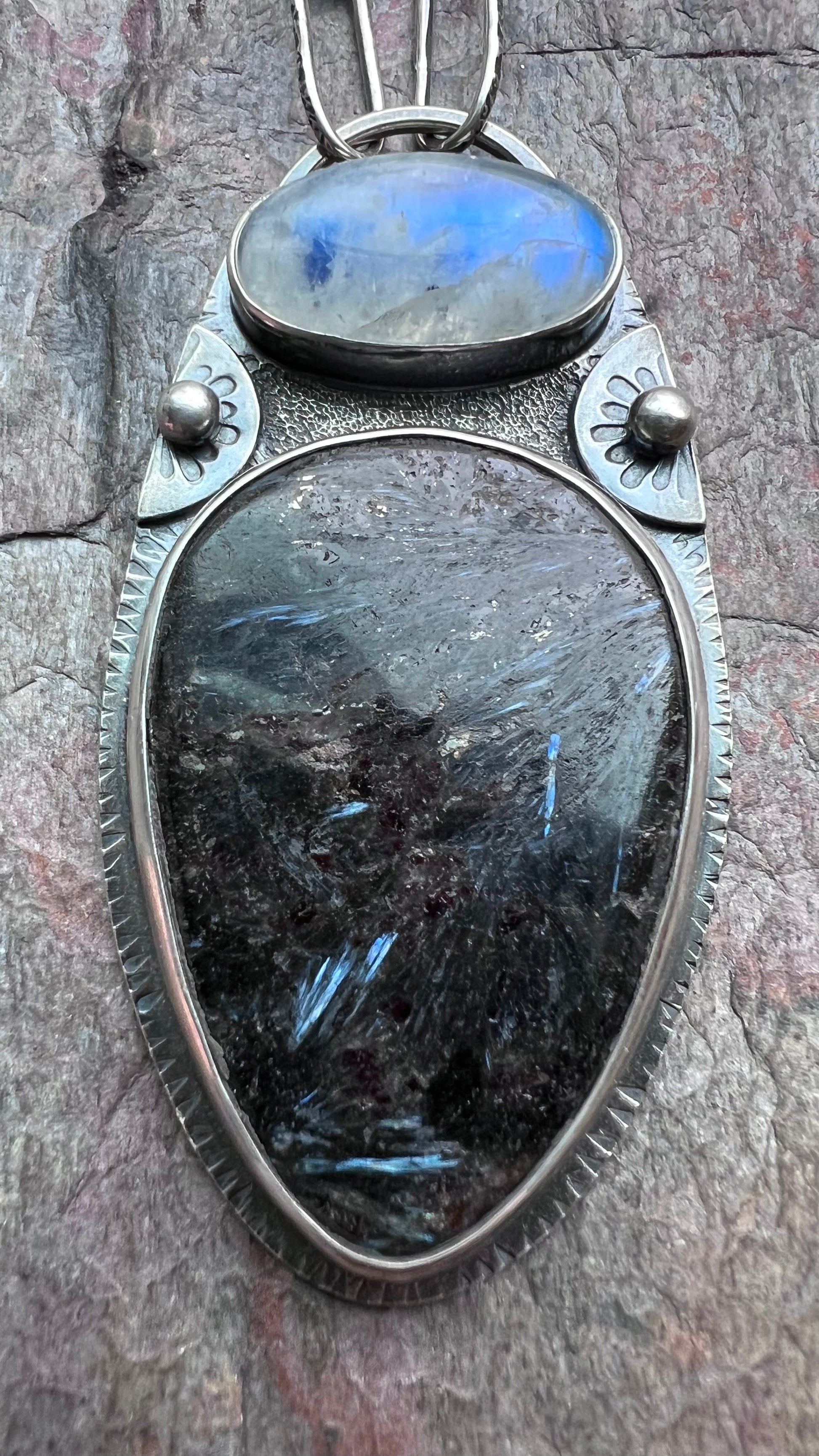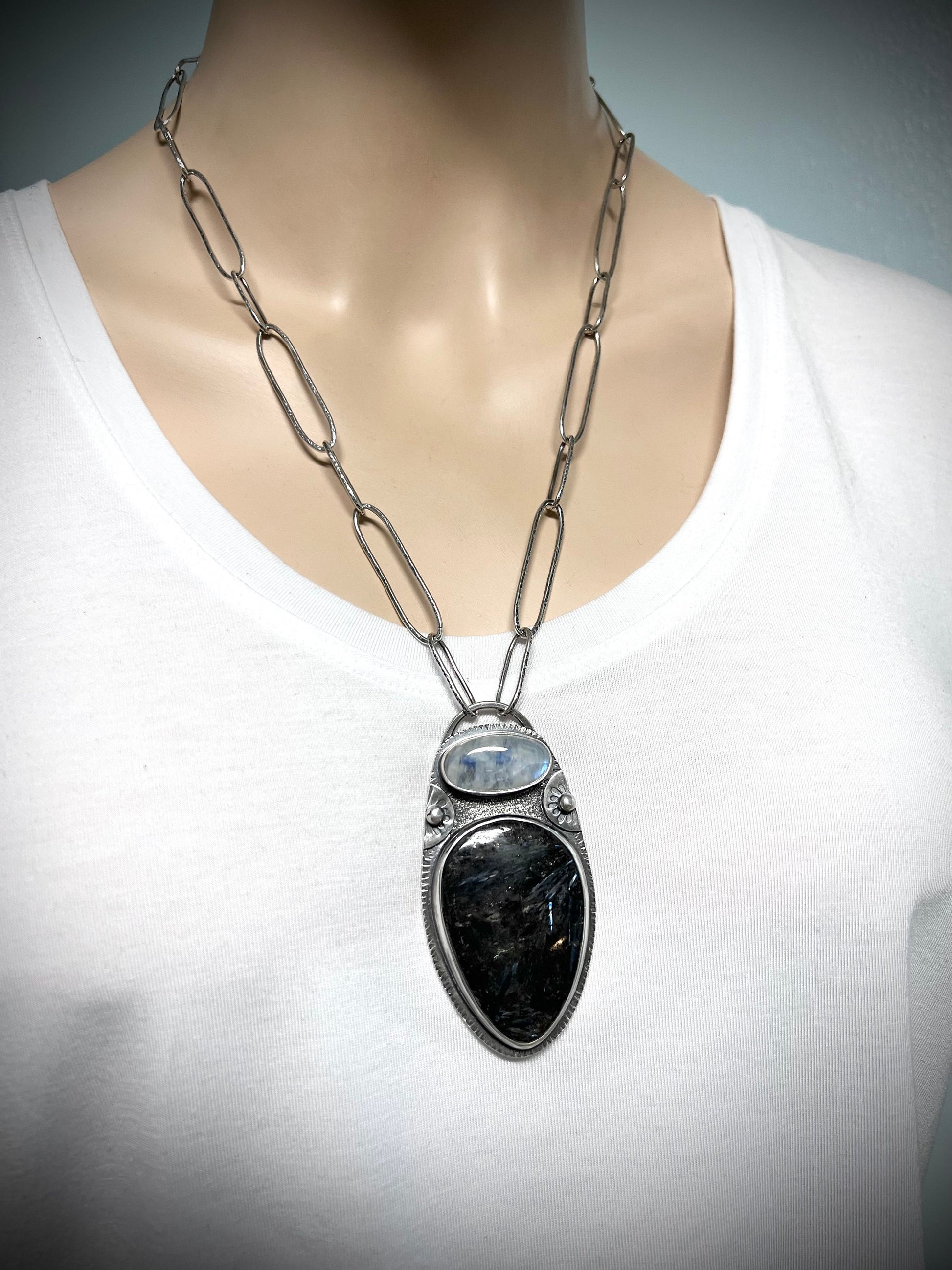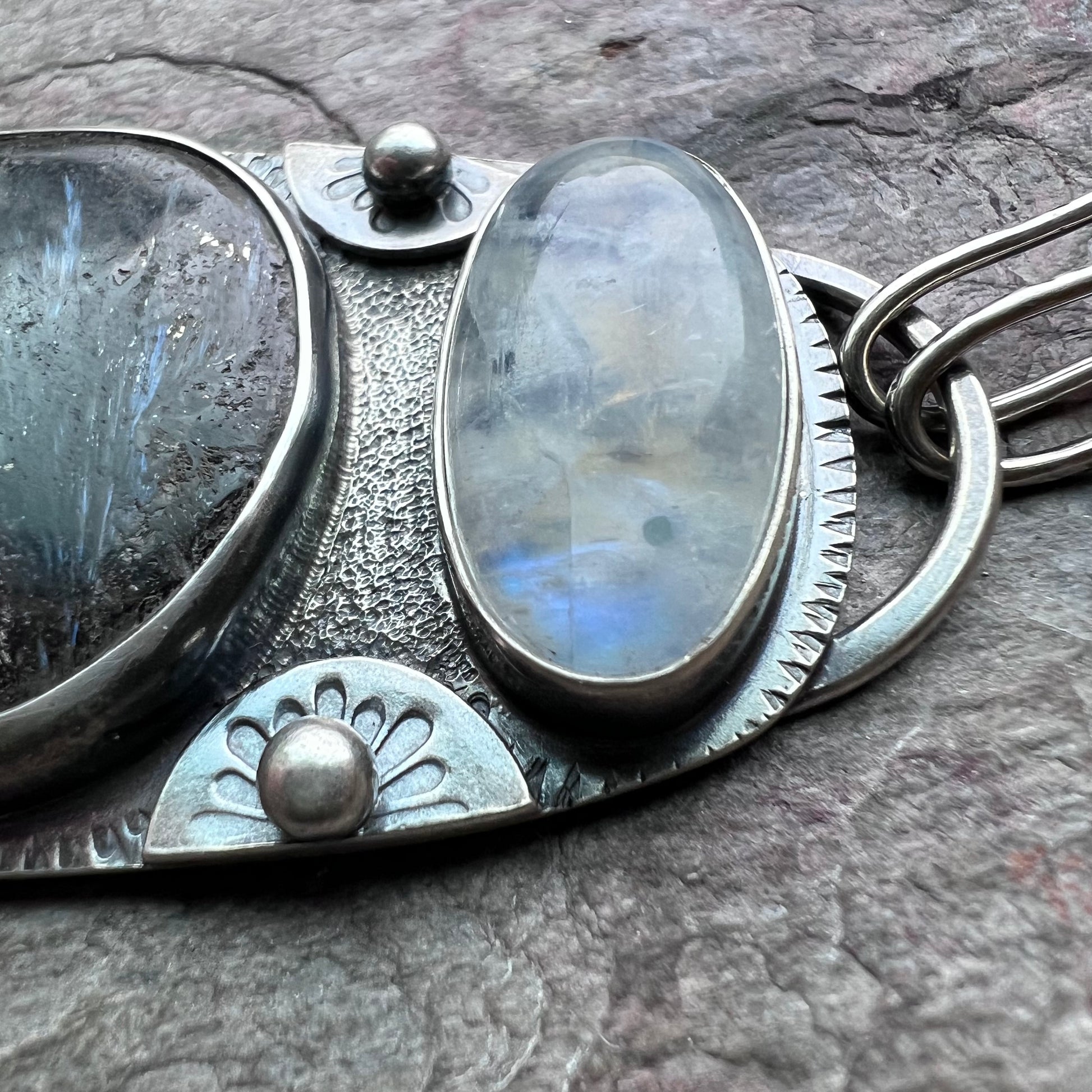 Rainbow moonstone and pietersite cabochons have been set in sterling and fine silver. I have made this one-of-a-kind necklace by sawing, soldering, texturing, and finishing the design entirely by hand. Pendant hangs from a handmade sterling silver chain which measures just under 24 inches in total length. The silver has been oxidized and polished to create a patina finish.