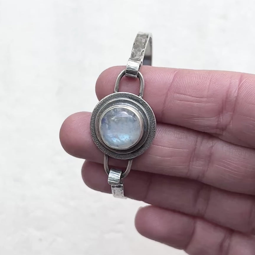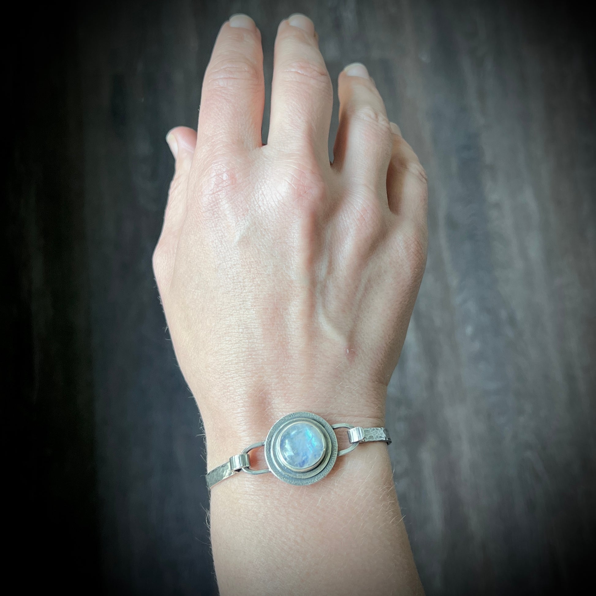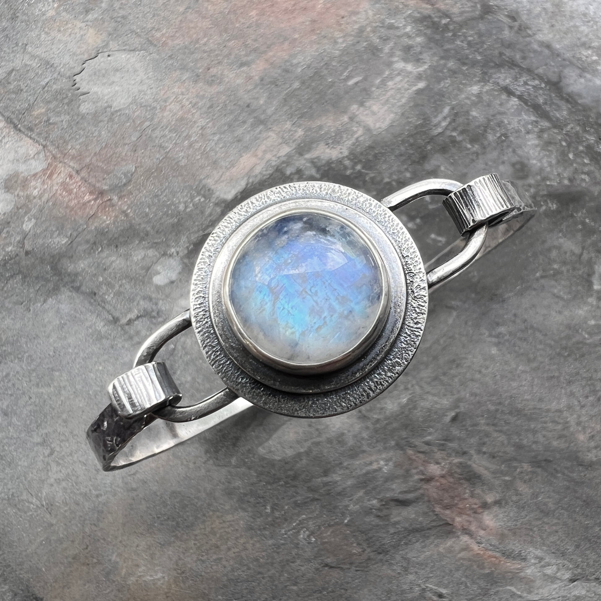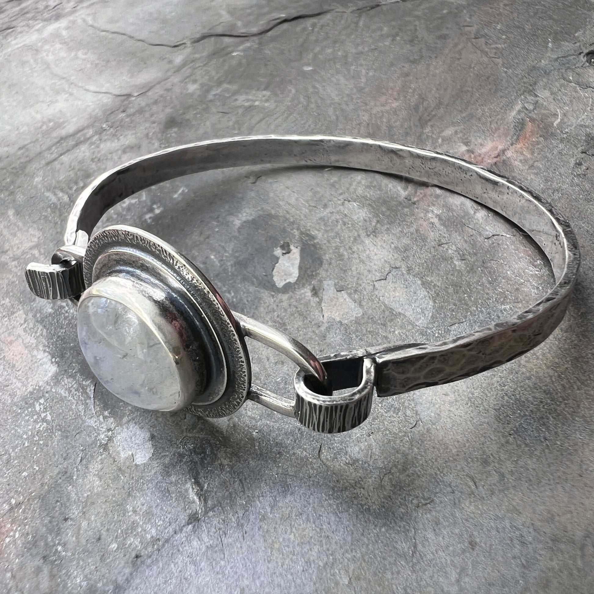 This artisan tension cuff bracelet is handmade from sterling silver and a genuine rainbow moonstone cabochon. The natural stone is framed by a textured silver border and features a hammered silver cuff. I have made this one of a kind bracelet by sawing, soldering, hammering, and finishing the design entirely by hand. The silver has been oxidized and polished to create an antique patina finish.